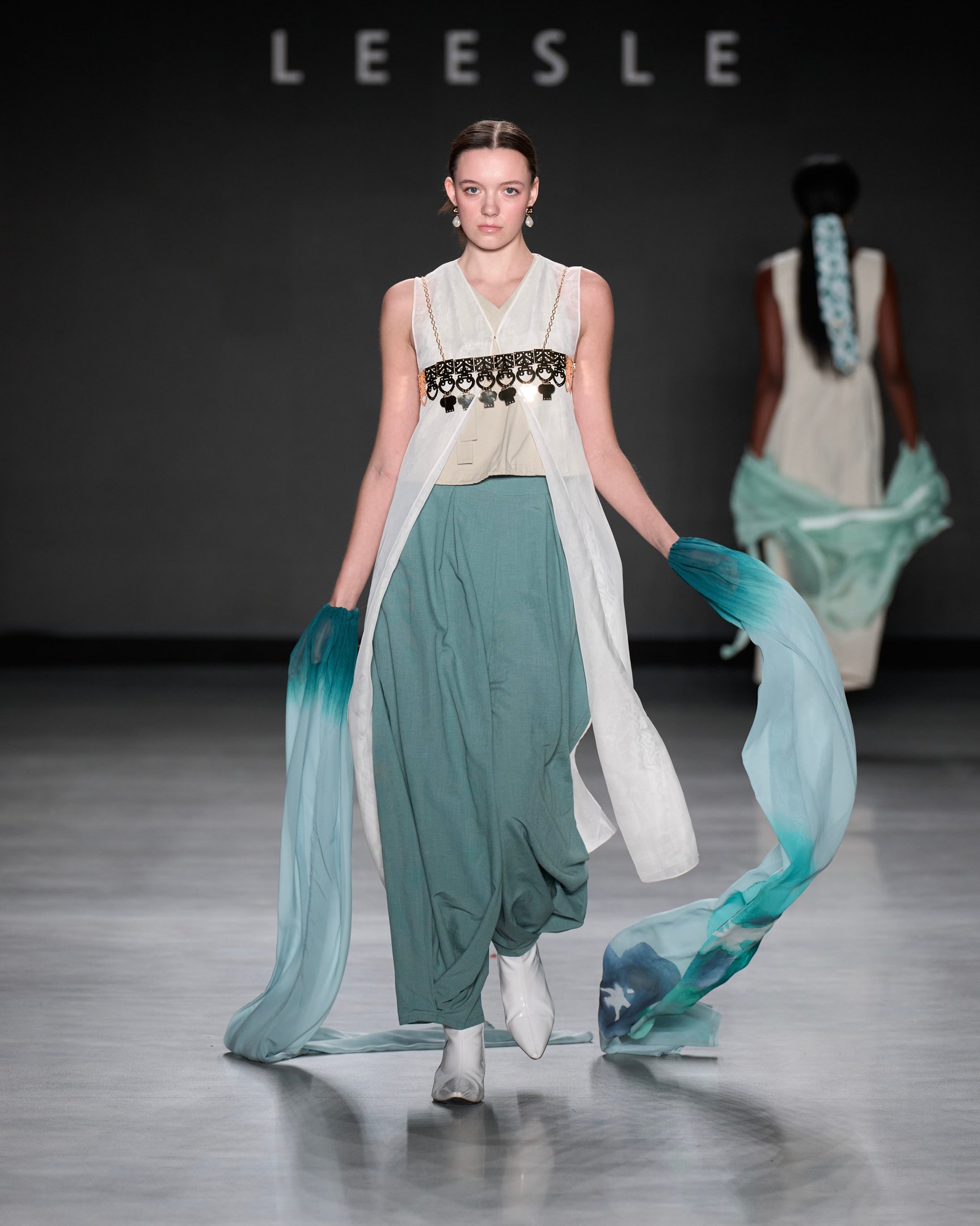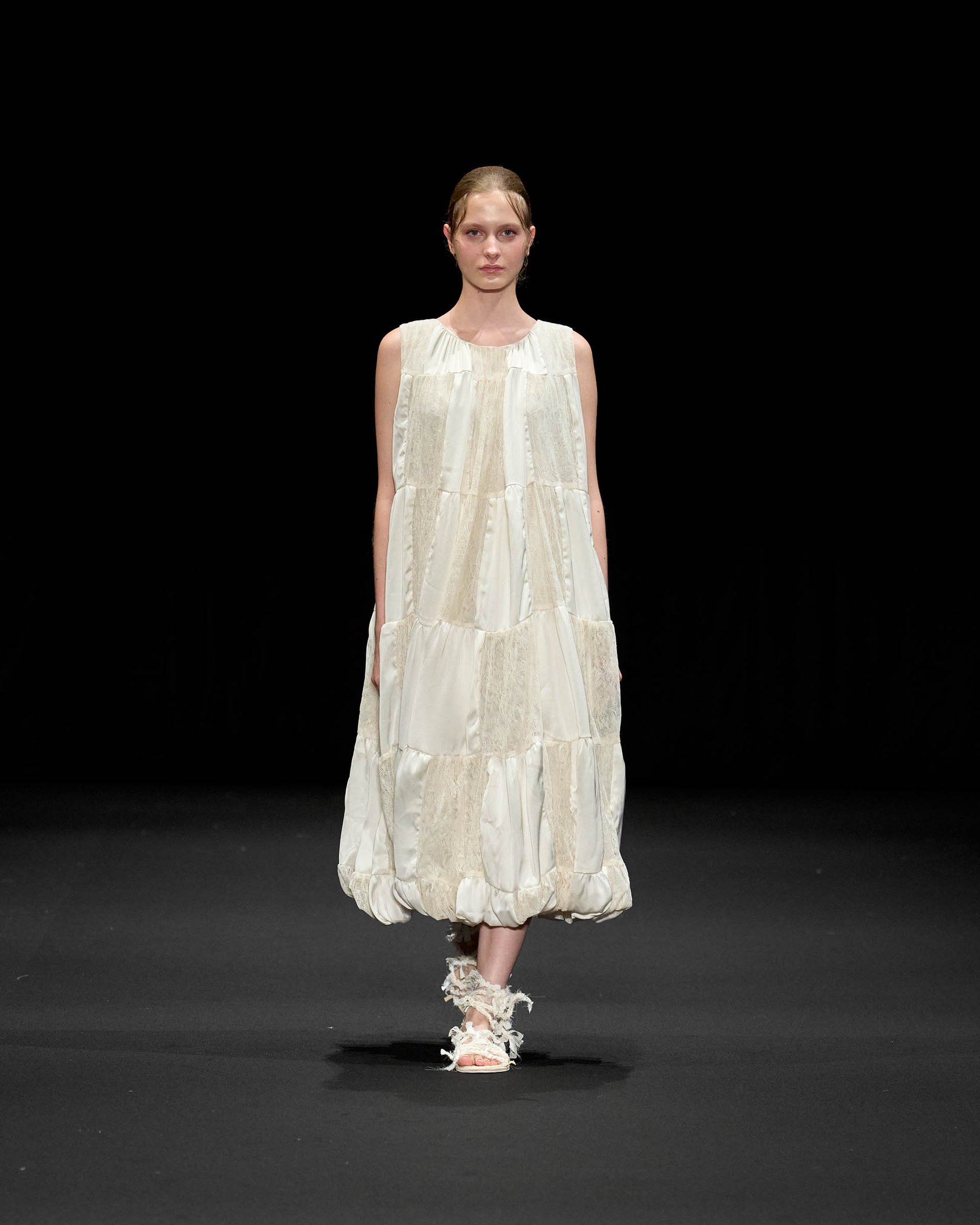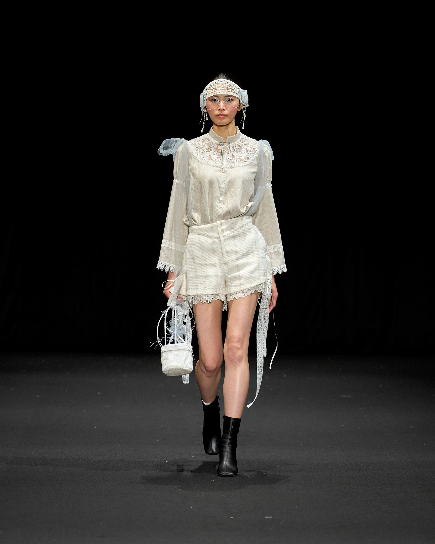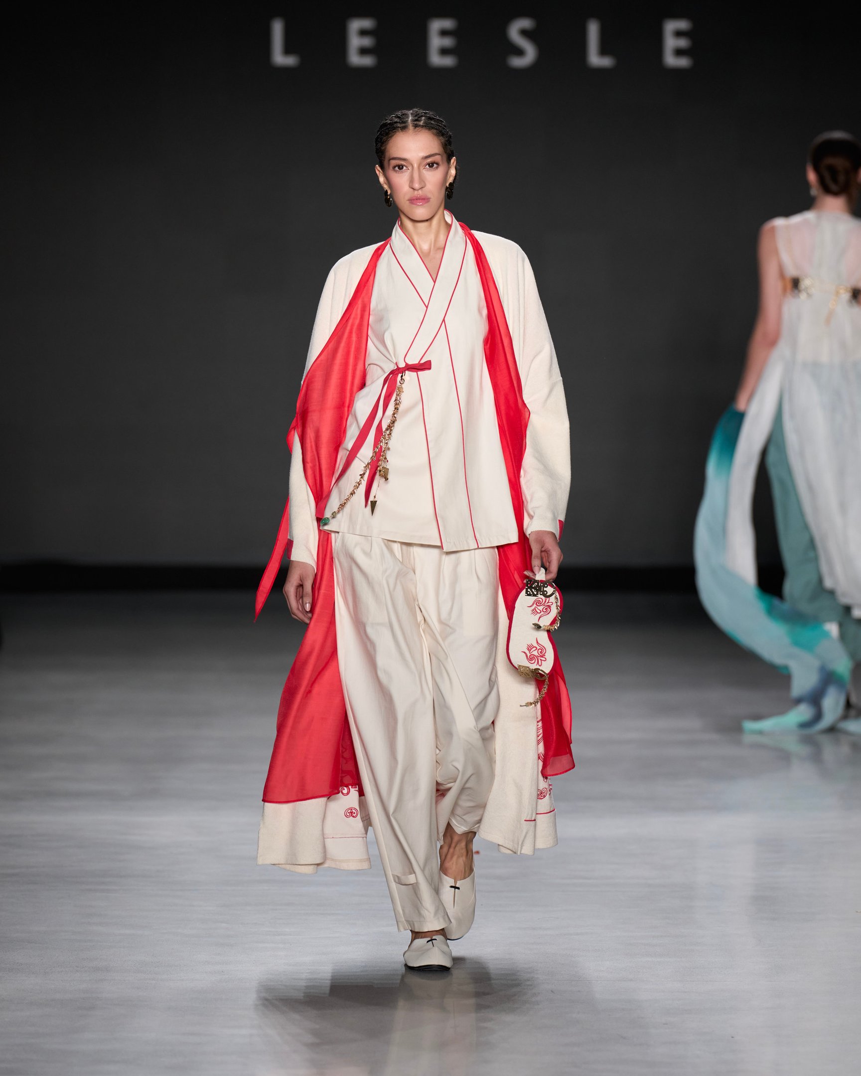 韓国の伝統衣装・韓服を現代に昇華させたリースルは、軽やかな素材と艶のある質感を用いた、流線的なシルエットが際立った。韓服特有の前合わせや巻きスカートの構造を、シアーな素材やコンテンポラリーなカッティングで再解釈し、伝統とモダンを見事に融合させている。アーティストの衣装制作やグローバルブランドとの協業でも知られるリースルが、今回のショーでは韓服の新解釈を通し、文化を越えて共鳴するスタイルを打ち出した。