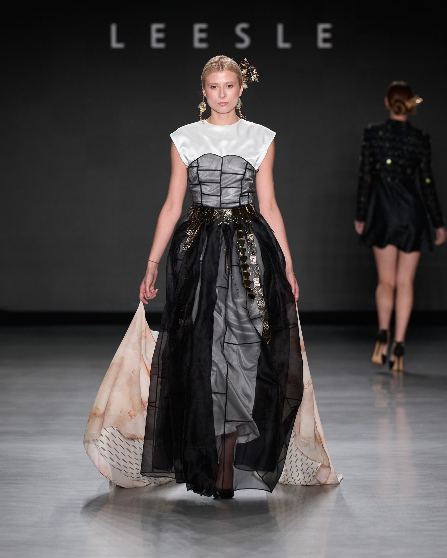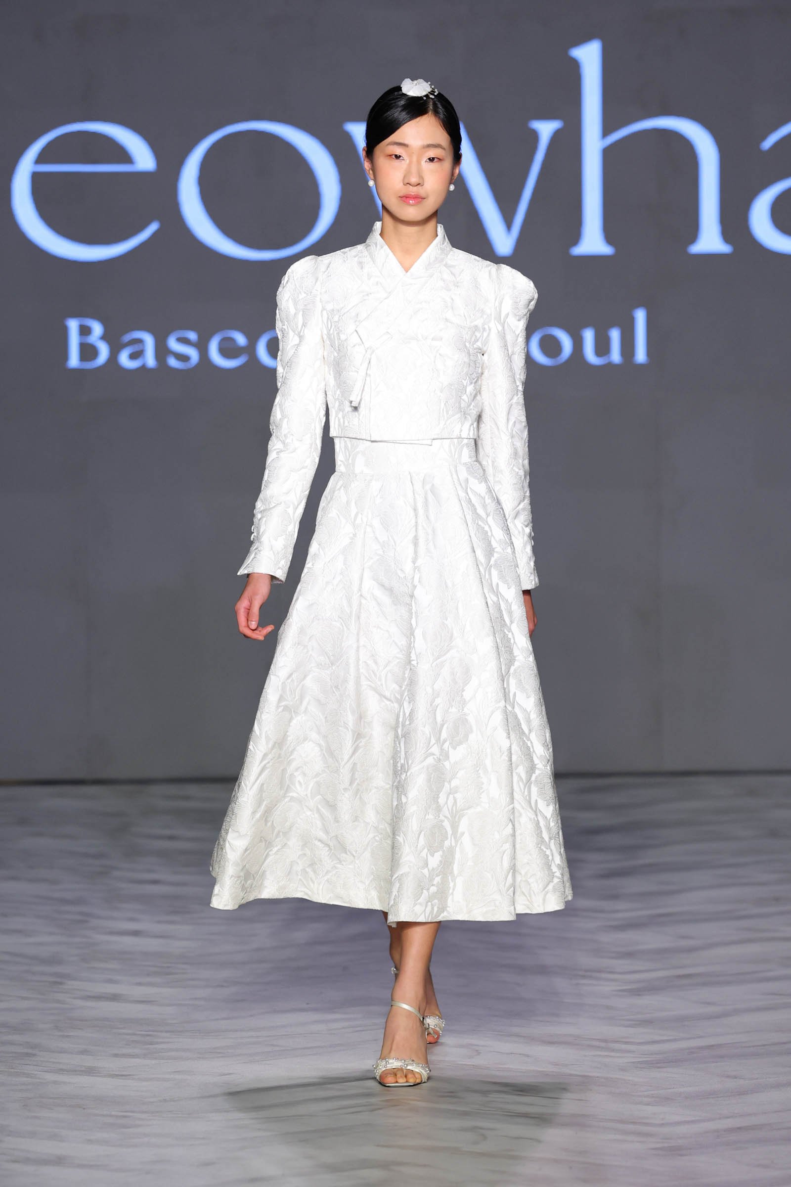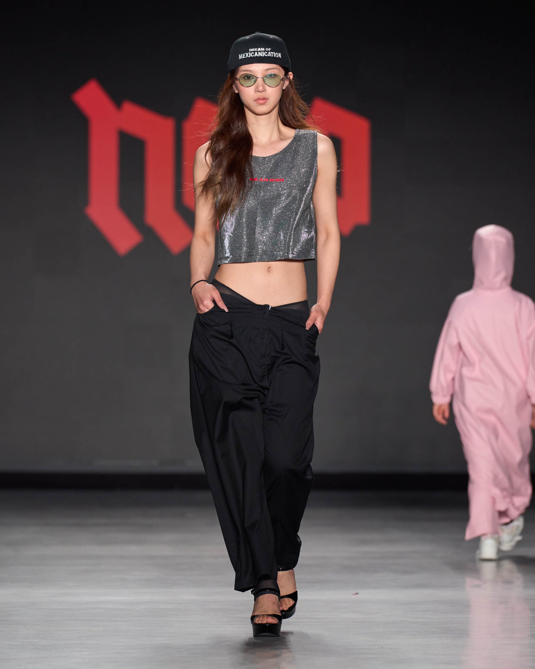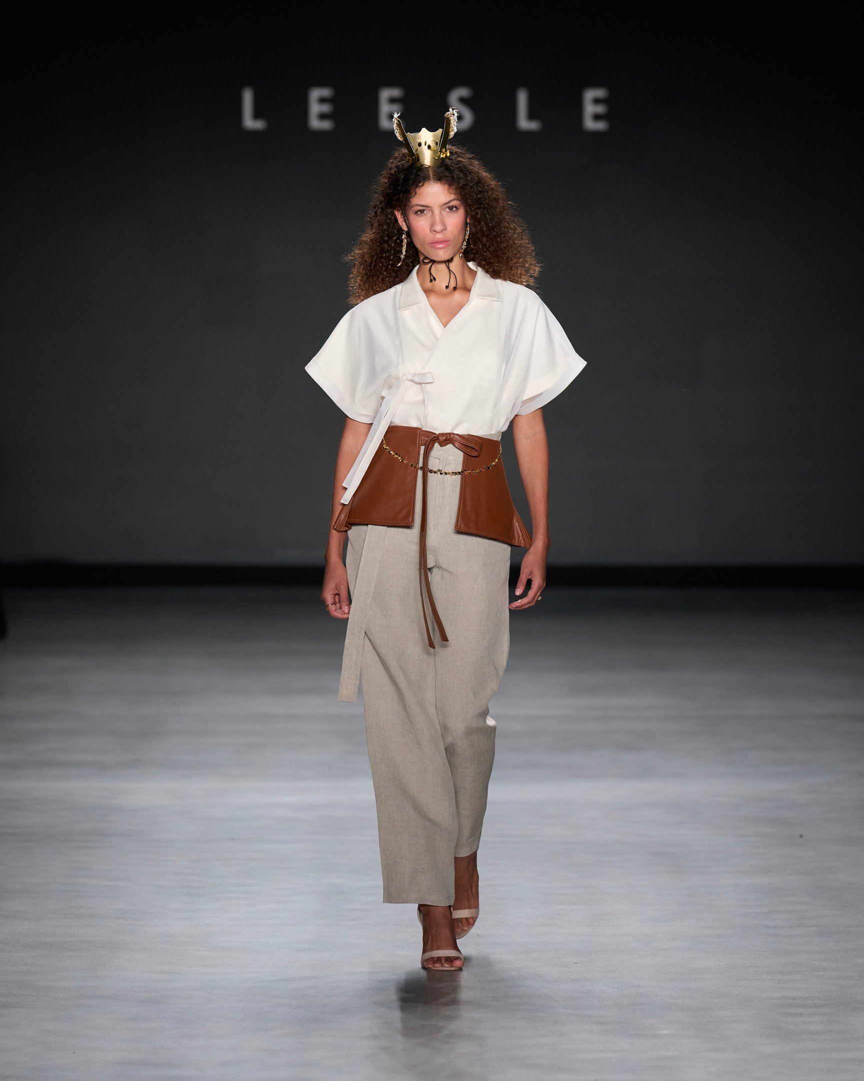 韓国の伝統衣装・韓服を現代に昇華させたリースルは、軽やかな素材と艶のある質感を用いた、流線的なシルエットが際立った。韓服特有の前合わせや巻きスカートの構造を、シアーな素材やコンテンポラリーなカッティングで再解釈し、伝統とモダンを見事に融合させている。アーティストの衣装制作やグローバルブランドとの協業でも知られるリースルが、今回のショーでは韓服の新解釈を通し、文化を越えて共鳴するスタイルを打ち出した。