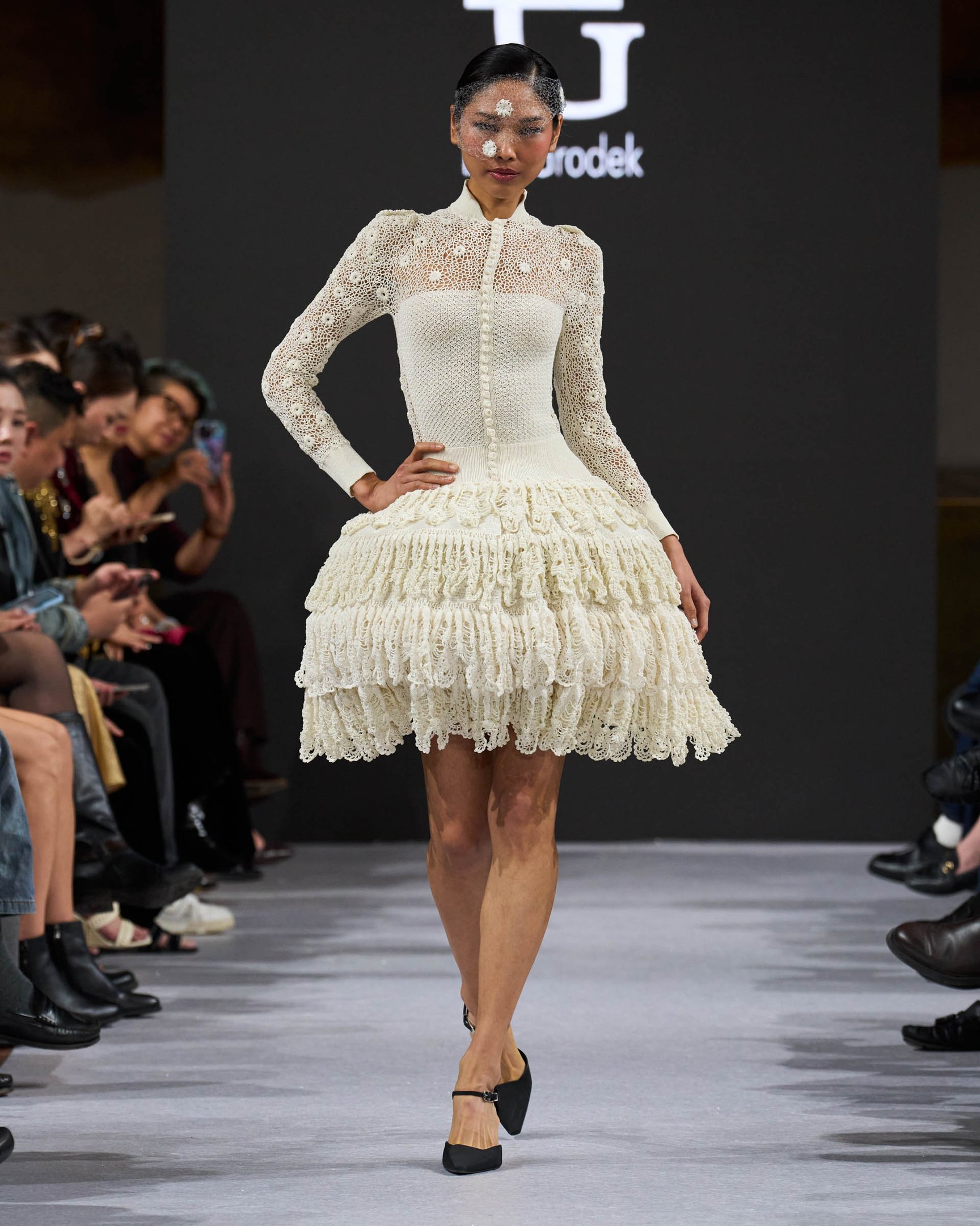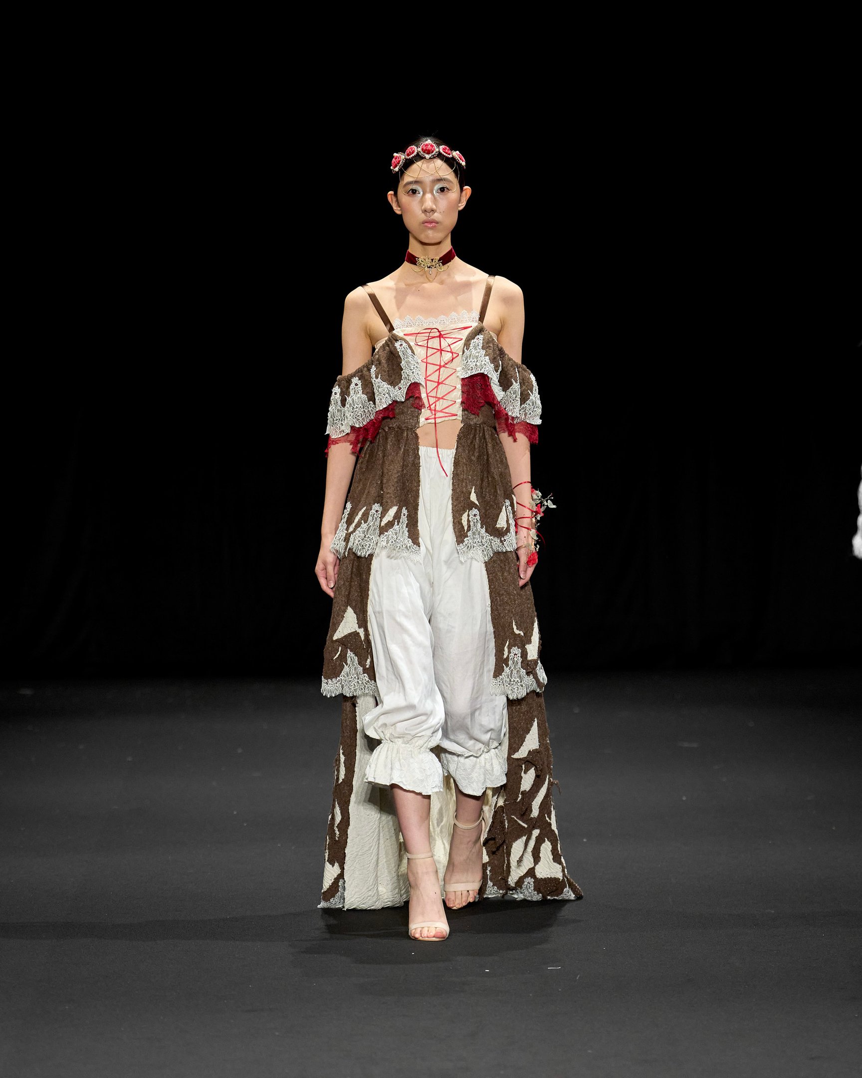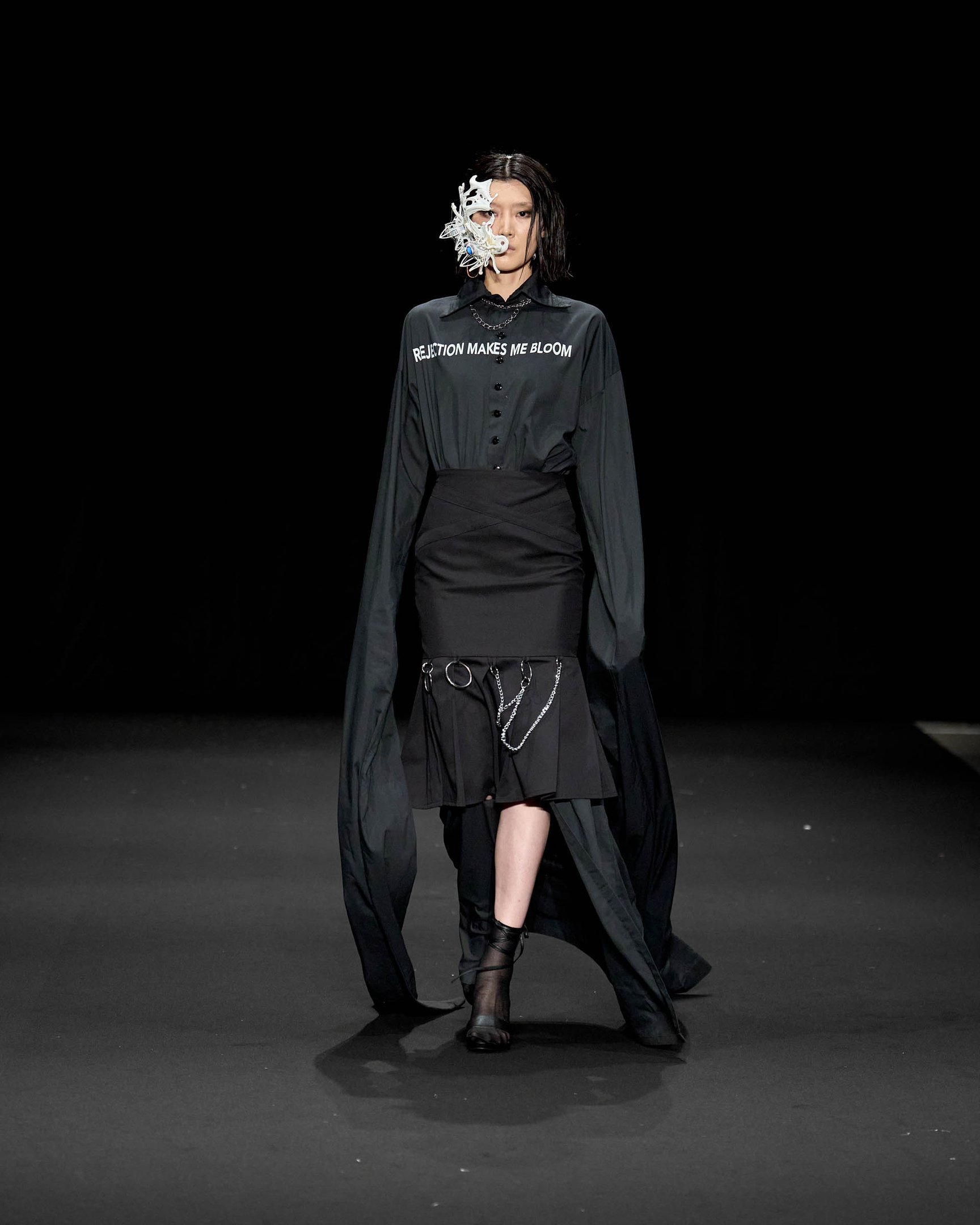 メットガラの眩いエネルギーに着想を得た台湾発ブランド「ウーリークス」。スパンコールやパールスタッズ、異素材の大胆な掛け合わせなど、装いを楽しむ自由な精神でショーに高揚感をもたらした。装飾性と遊び心が共存する一方で、レースやフリルといった甘いディテールの裏には、意志の強さを感じさせる反逆のエッセンスも見え隠れする。挑発的な華やぎと過剰さを謳歌する装いで、ドレスアップの概念を新しく塗り替えた。