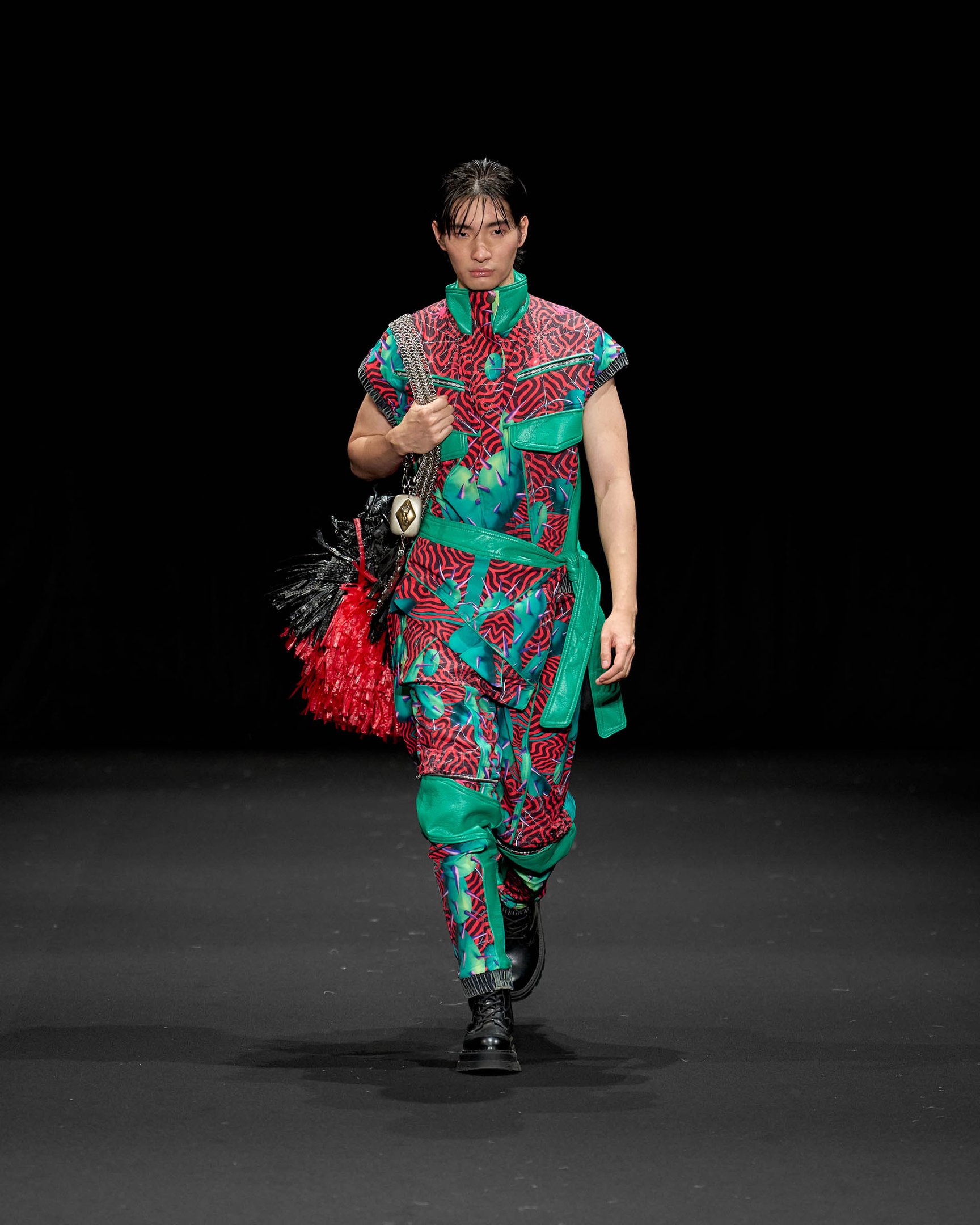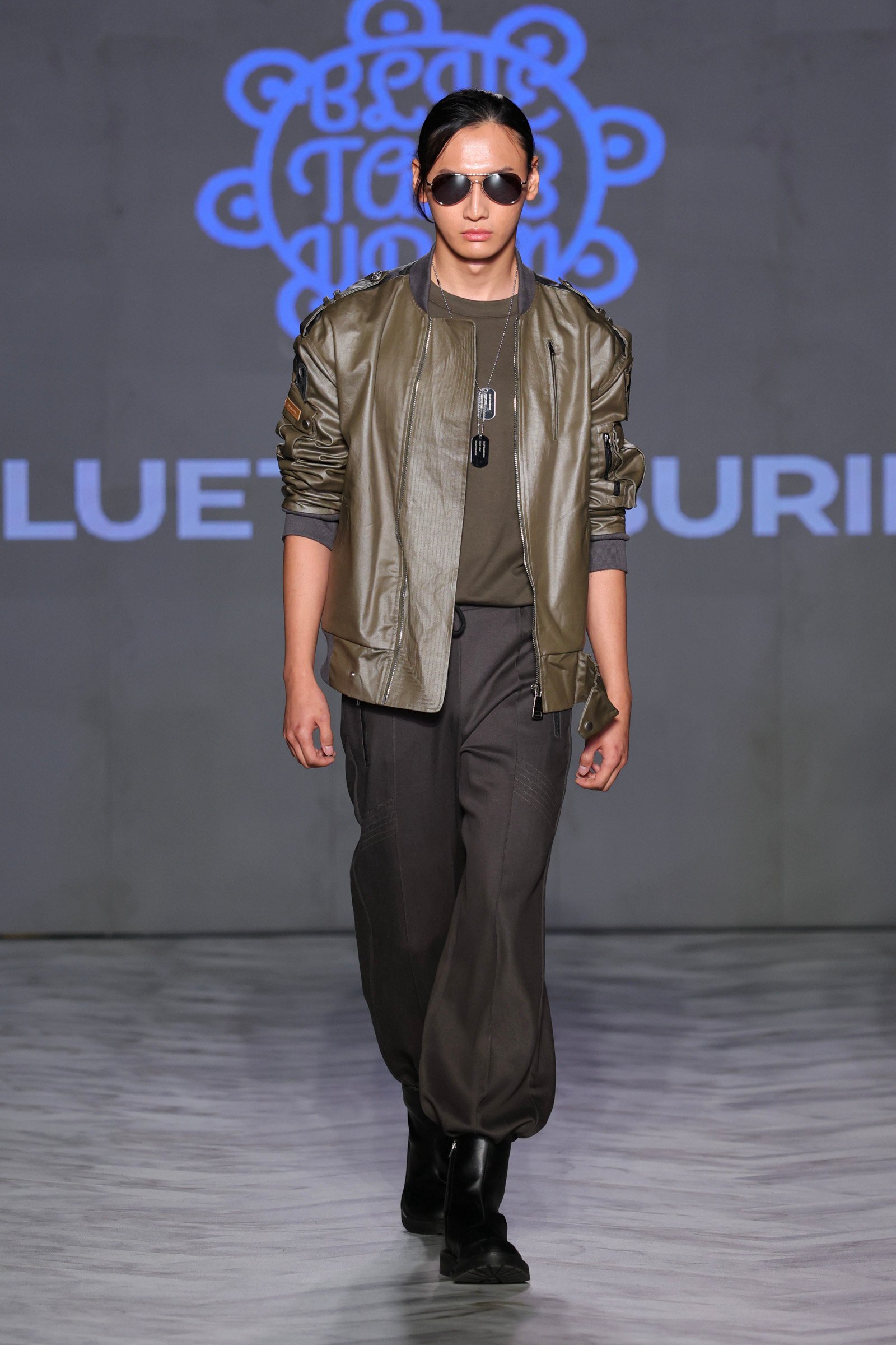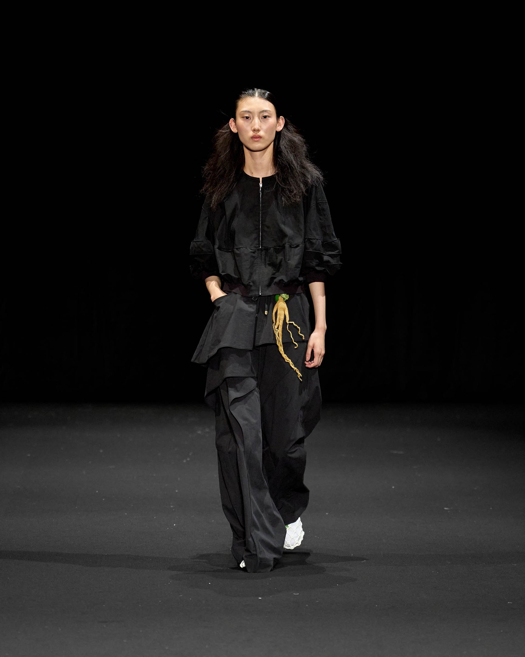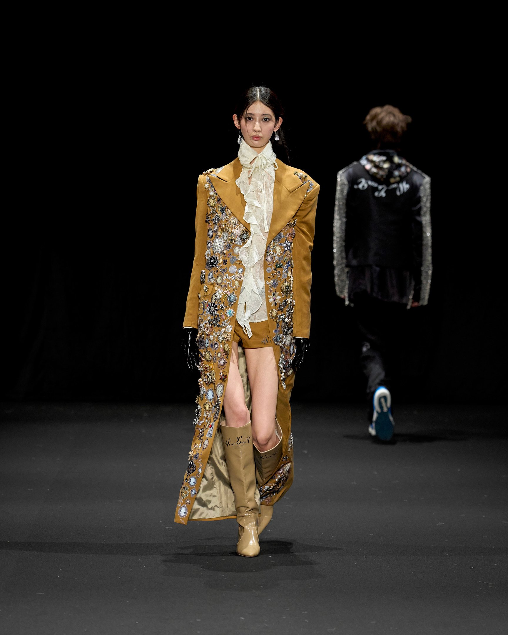 「アートと社会貢献の共存」を理念に掲げるブルータンバリンは、ミリタリーコードを再解釈。カーキやオリーブを基調としたユーティリティウェアに、テーラリングやスーツの要素を融合させ、力強さとエレガンスを交錯させたスタイルを打ち出した。ベレー帽やメタルアクセサリーの硬質な輝きと、軽やかなファブリックとの対比が印象を際立たせ、“規律と献身”の精神を纏うタフな美しさでランウェイを魅了した。