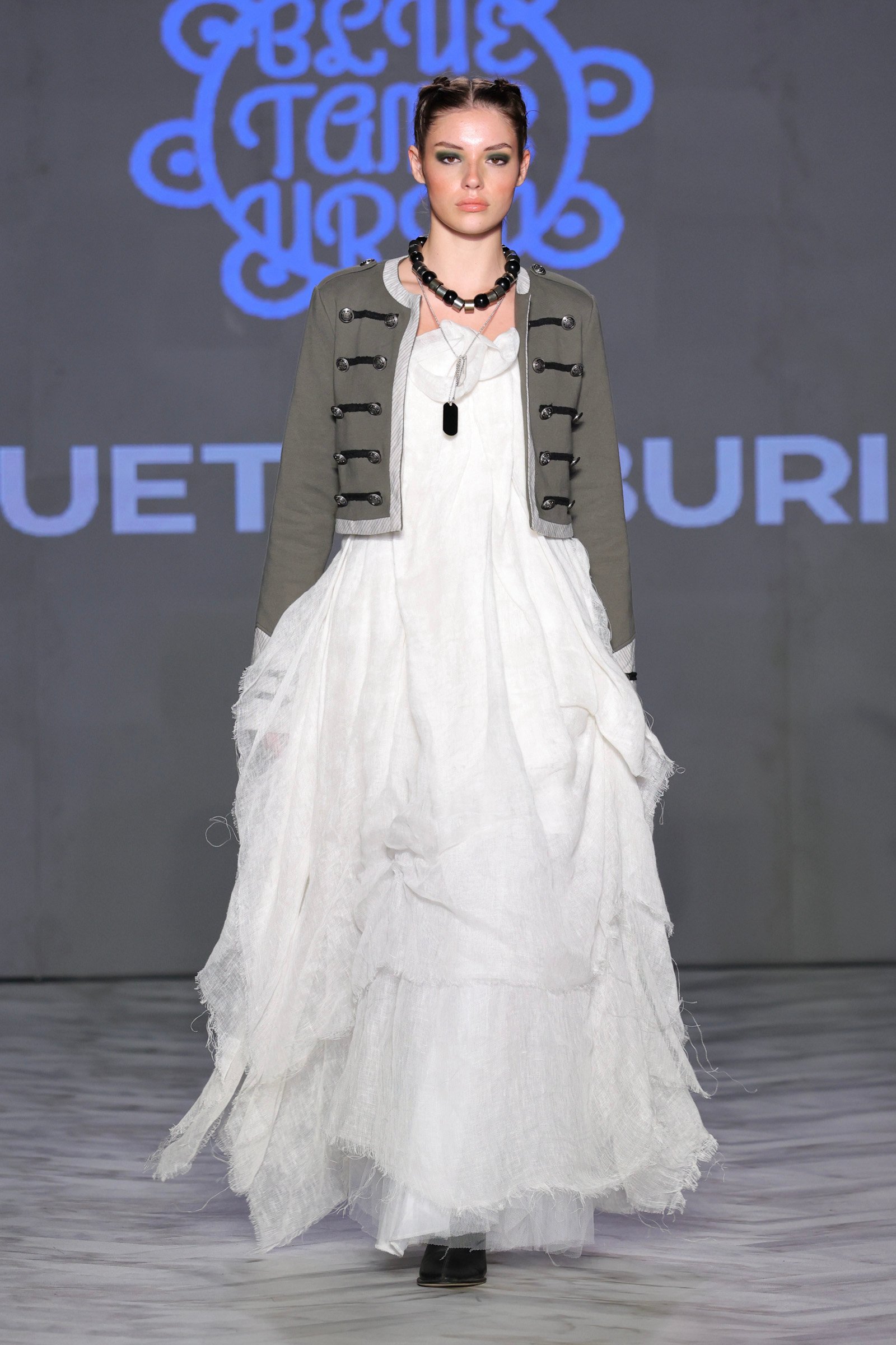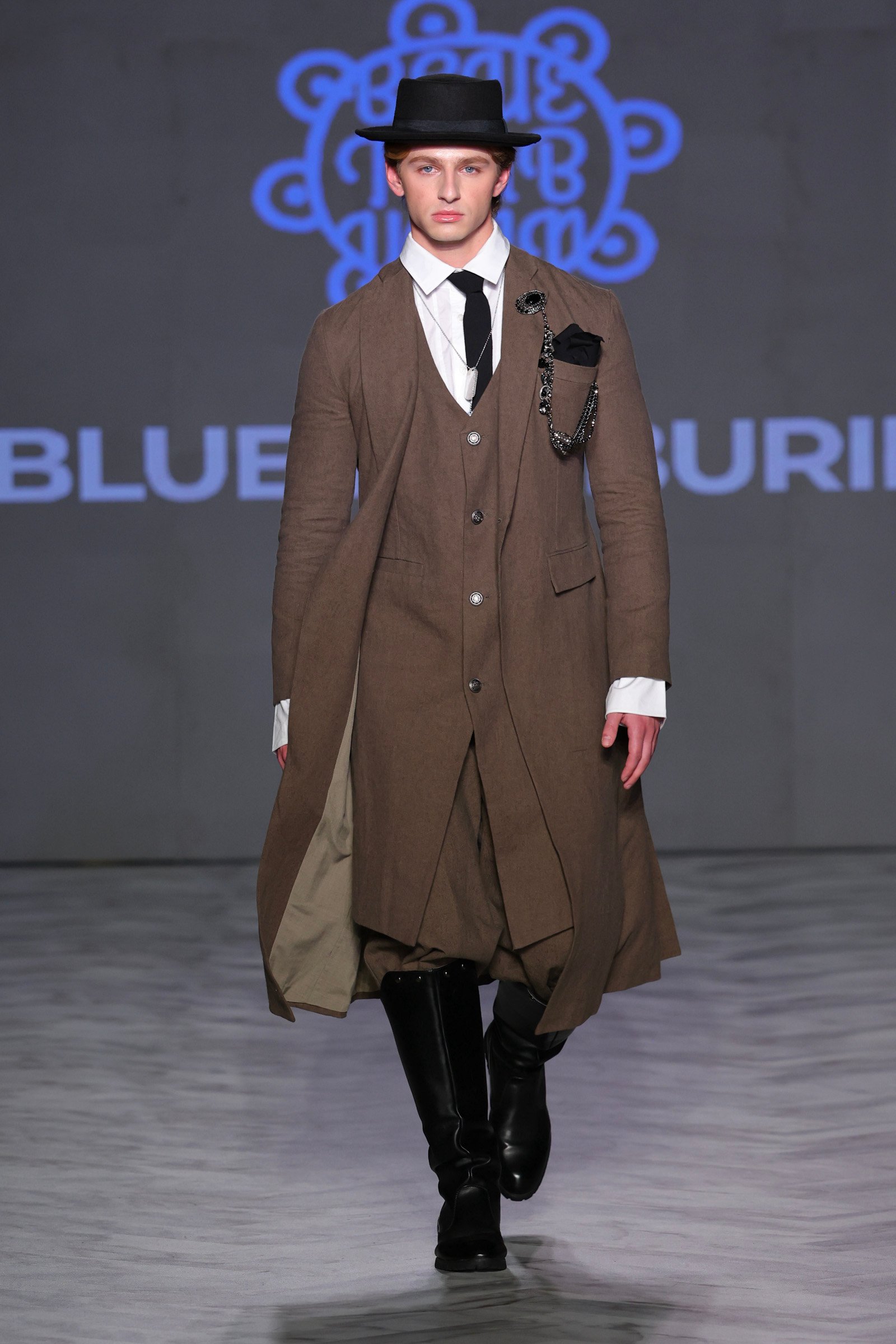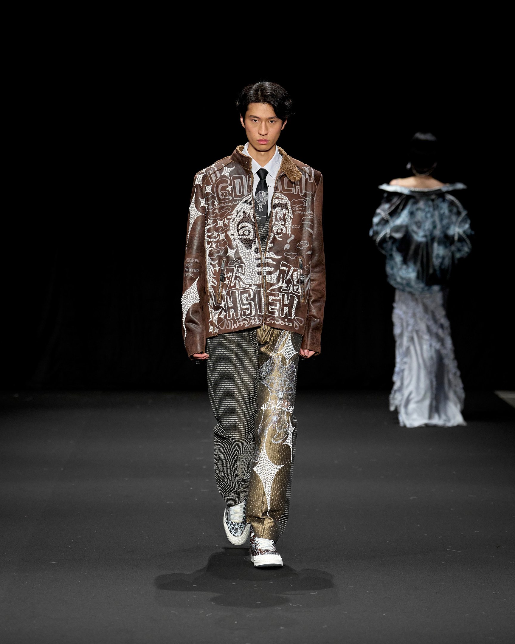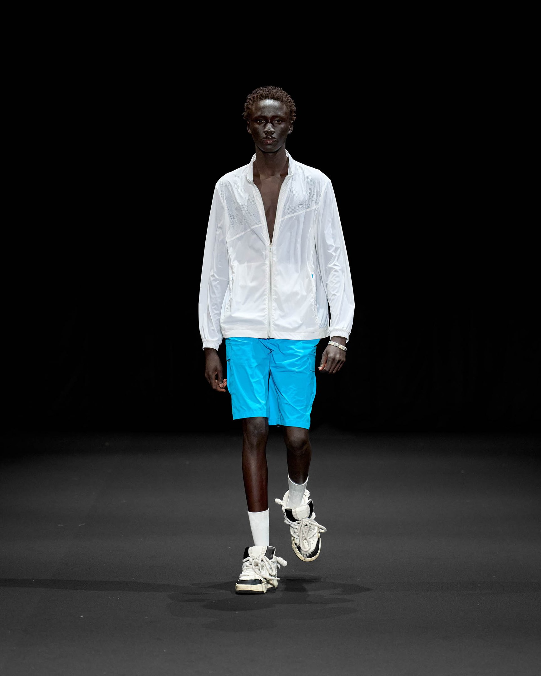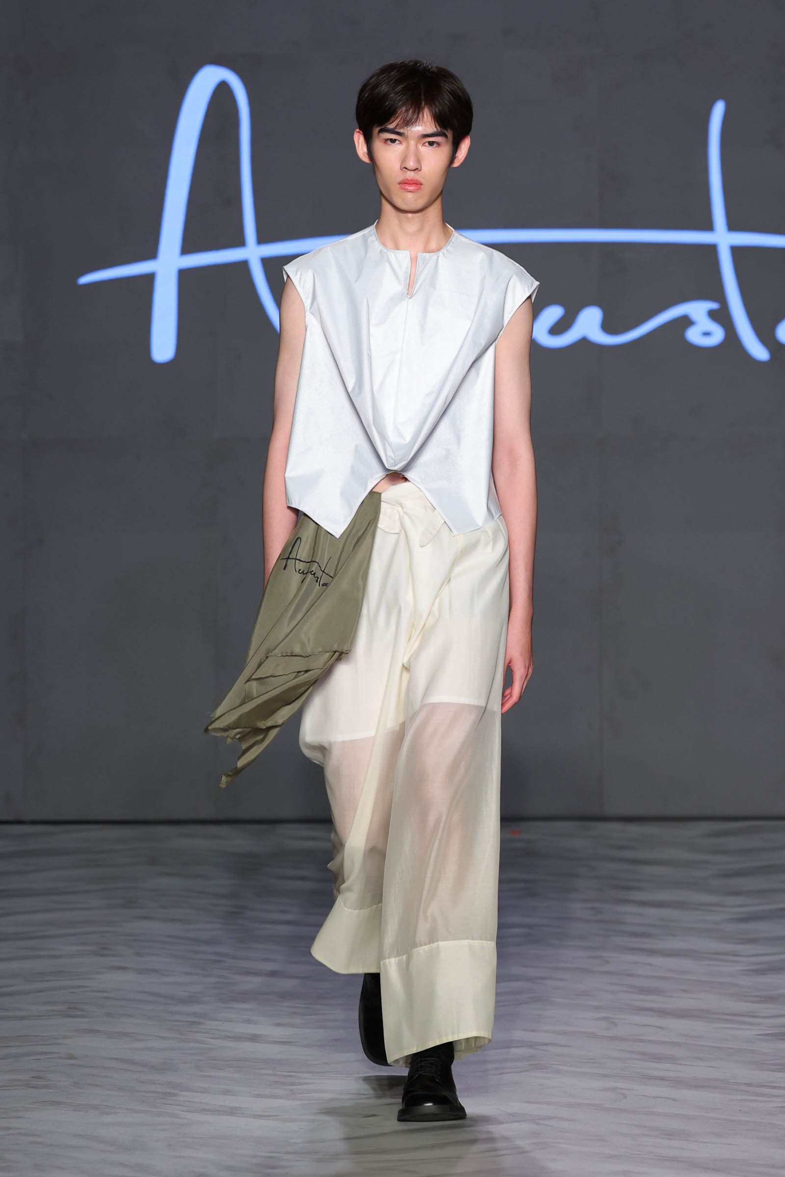 「アートと社会貢献の共存」を理念に掲げるブルータンバリンは、ミリタリーコードを再解釈。カーキやオリーブを基調としたユーティリティウェアに、テーラリングやスーツの要素を融合させ、力強さとエレガンスを交錯させたスタイルを打ち出した。ベレー帽やメタルアクセサリーの硬質な輝きと、軽やかなファブリックとの対比が印象を際立たせ、“規律と献身”の精神を纏うタフな美しさでランウェイを魅了した。