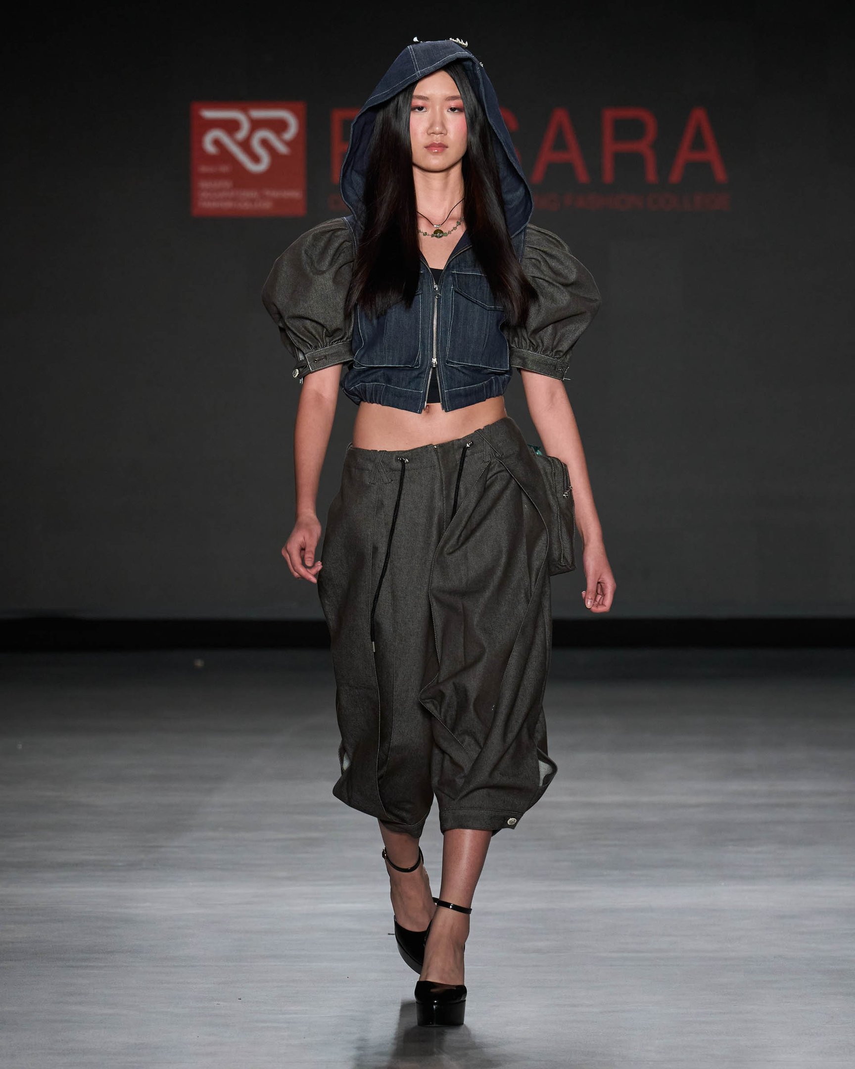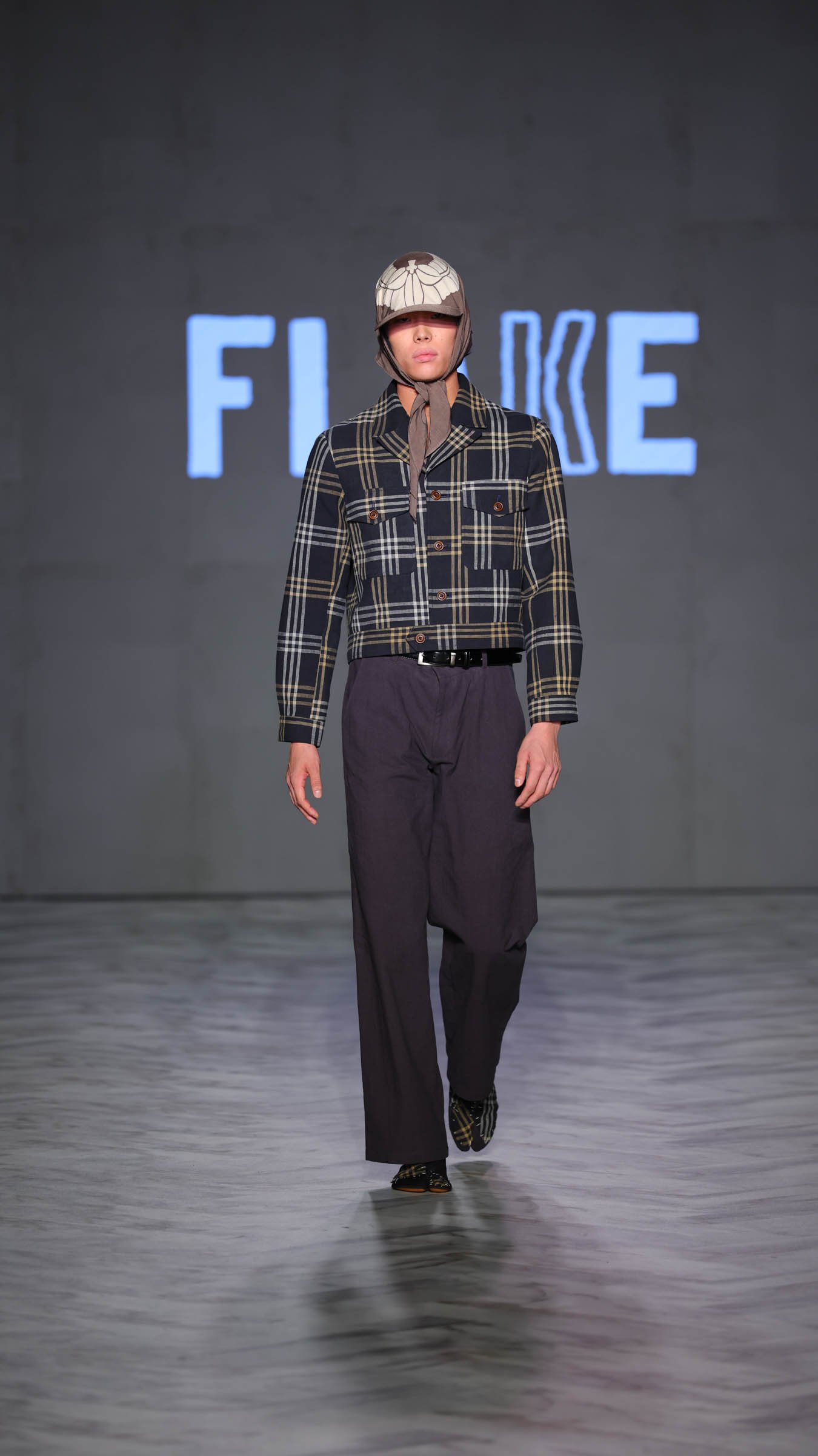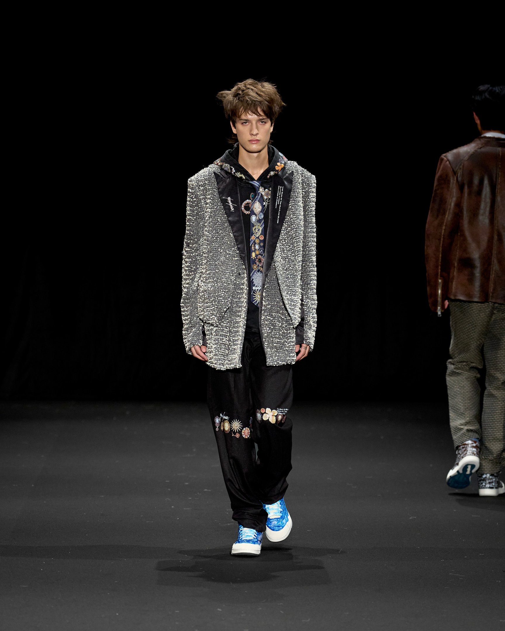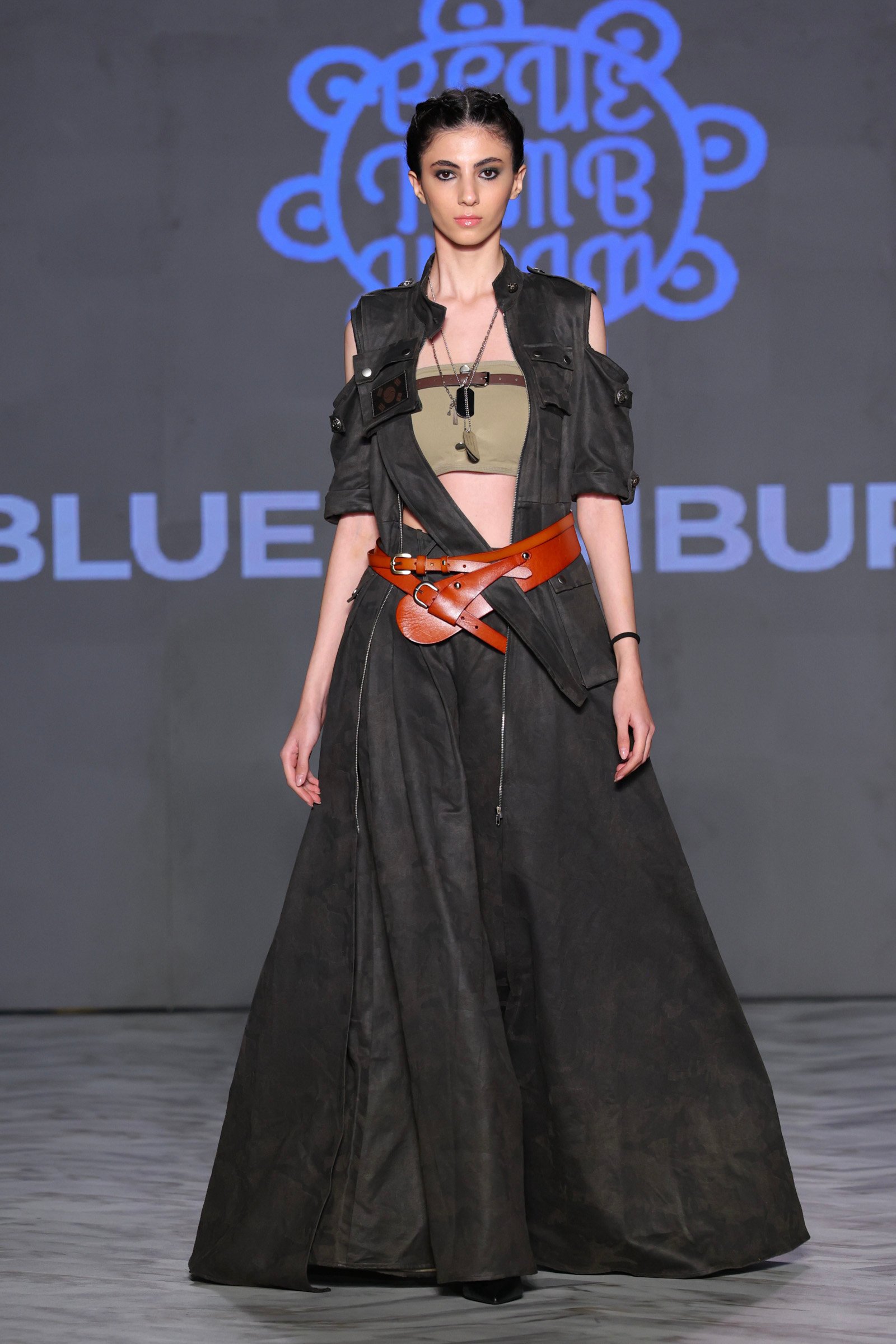 「アートと社会貢献の共存」を理念に掲げるブルータンバリンは、ミリタリーコードを再解釈。カーキやオリーブを基調としたユーティリティウェアに、テーラリングやスーツの要素を融合させ、力強さとエレガンスを交錯させたスタイルを打ち出した。ベレー帽やメタルアクセサリーの硬質な輝きと、軽やかなファブリックとの対比が印象を際立たせ、“規律と献身”の精神を纏うタフな美しさでランウェイを魅了した。
