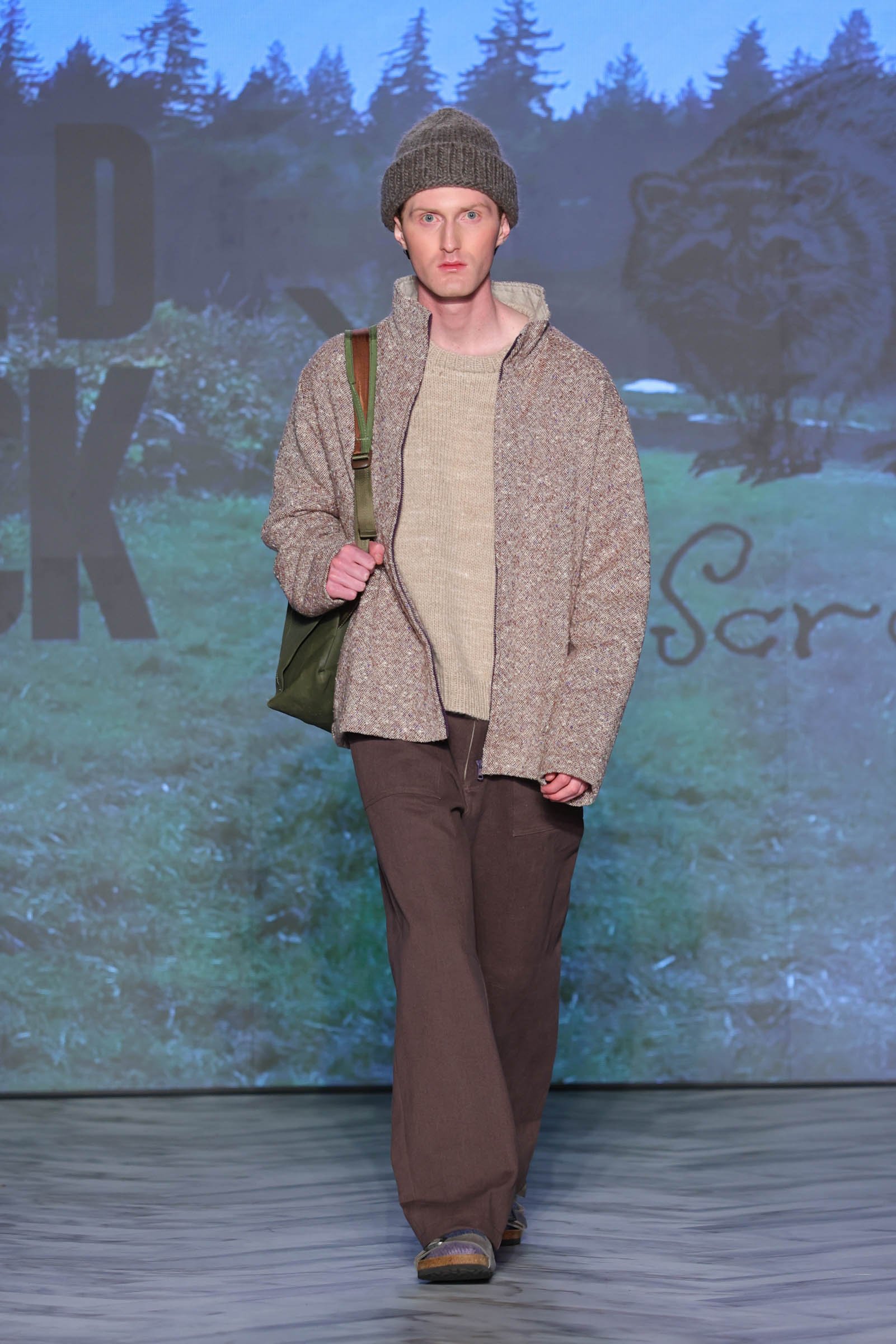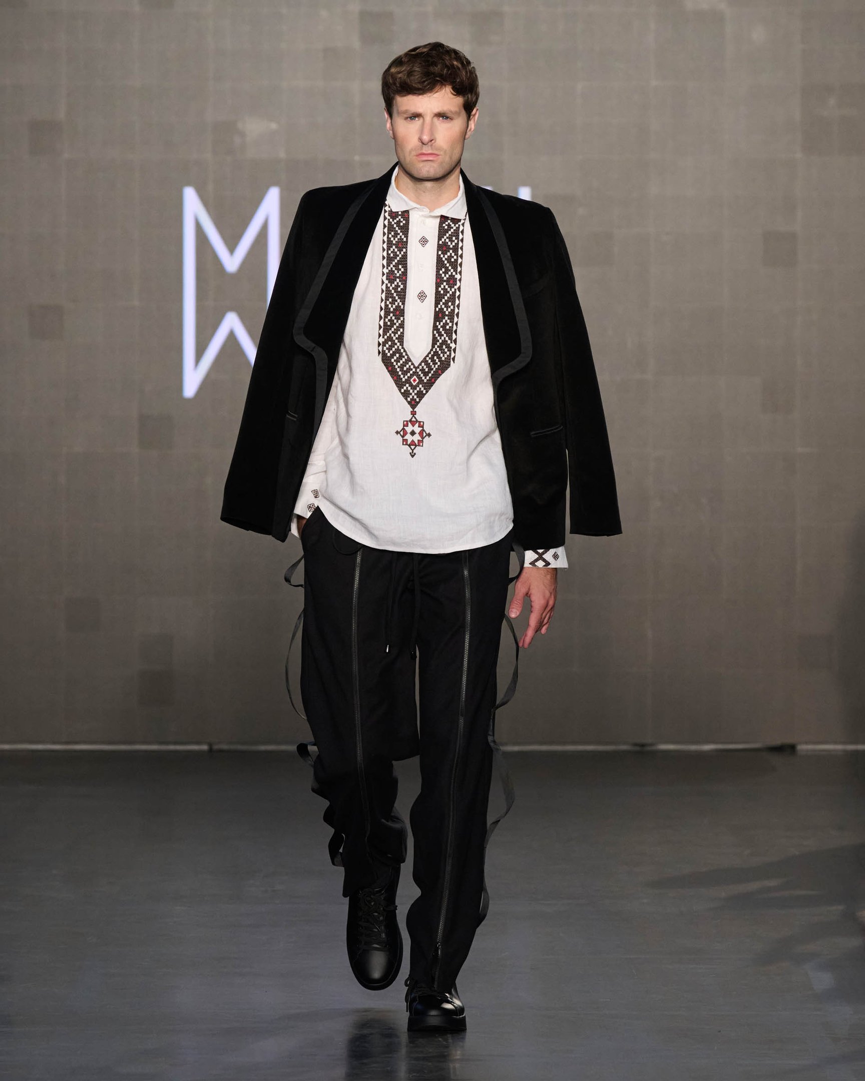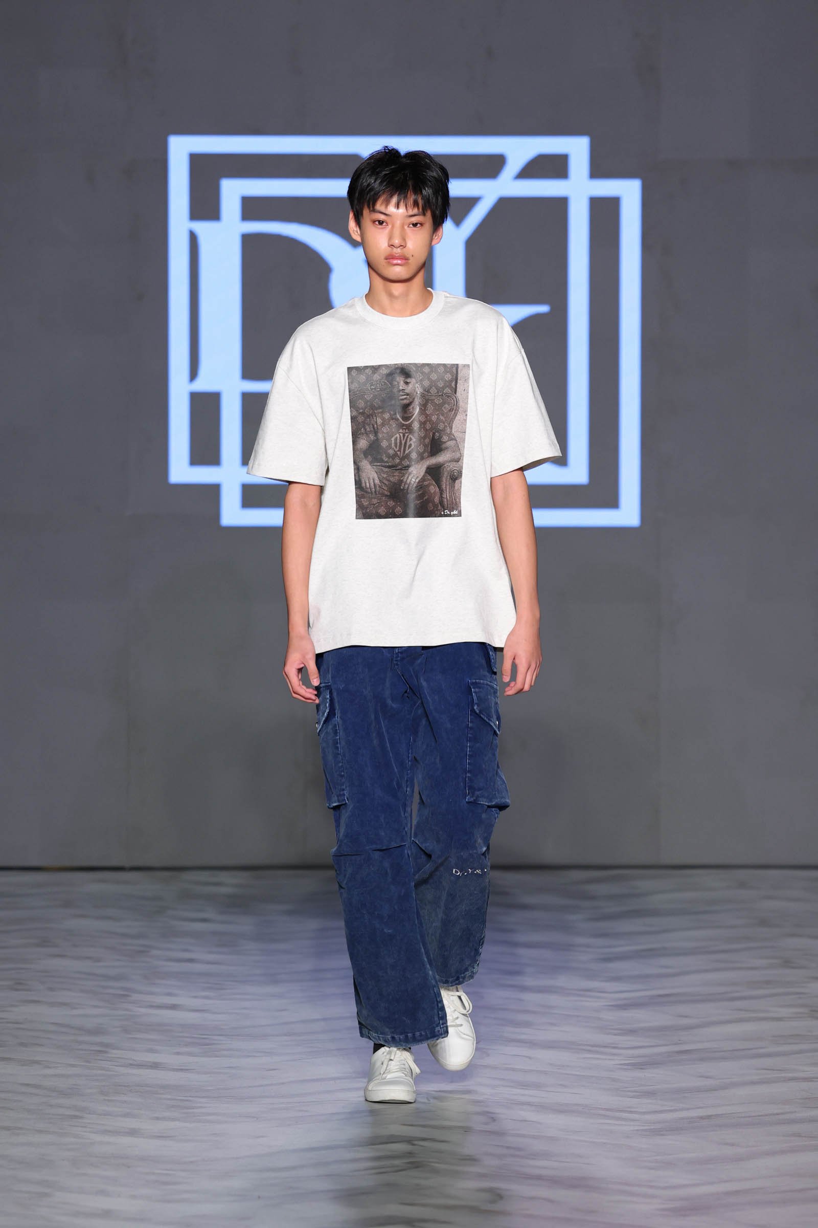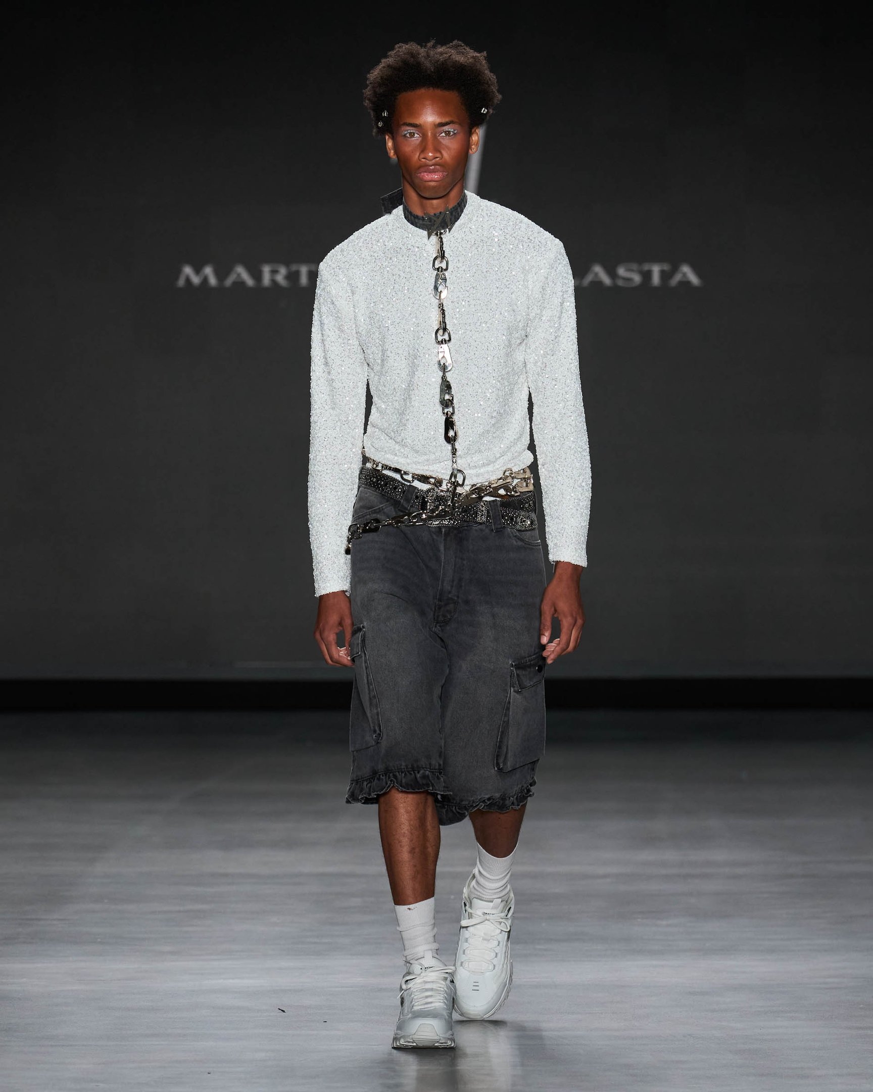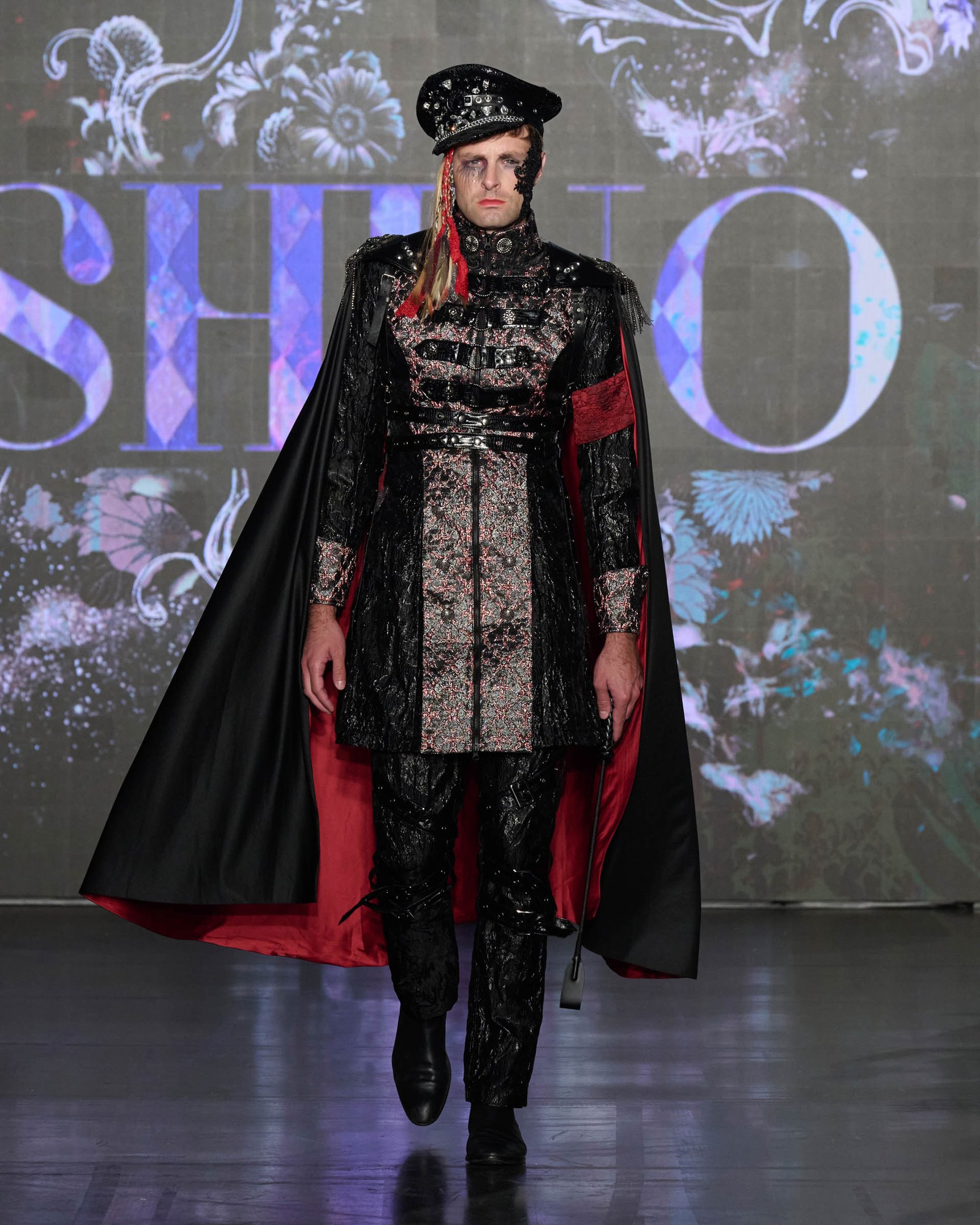 「アートと社会貢献の共存」を理念に掲げるブルータンバリンは、ミリタリーコードを再解釈。カーキやオリーブを基調としたユーティリティウェアに、テーラリングやスーツの要素を融合させ、力強さとエレガンスを交錯させたスタイルを打ち出した。ベレー帽やメタルアクセサリーの硬質な輝きと、軽やかなファブリックとの対比が印象を際立たせ、“規律と献身”の精神を纏うタフな美しさでランウェイを魅了した。