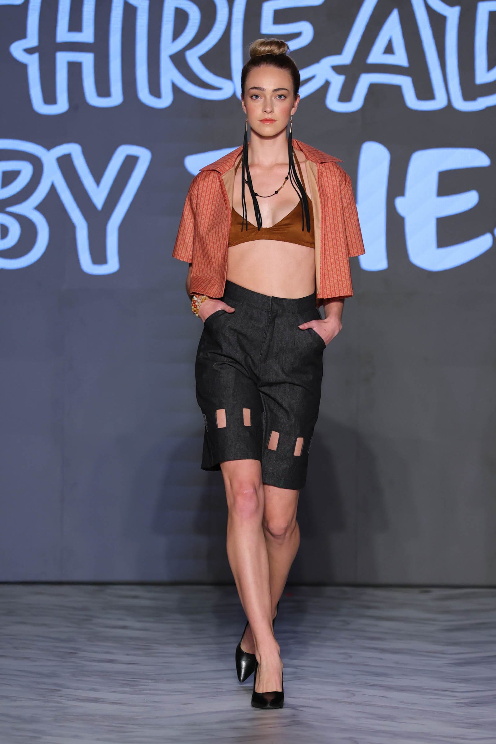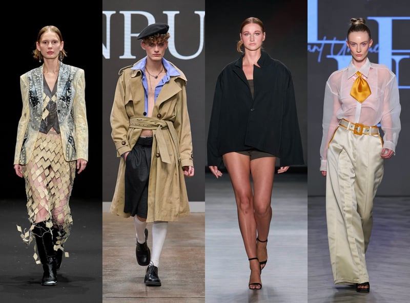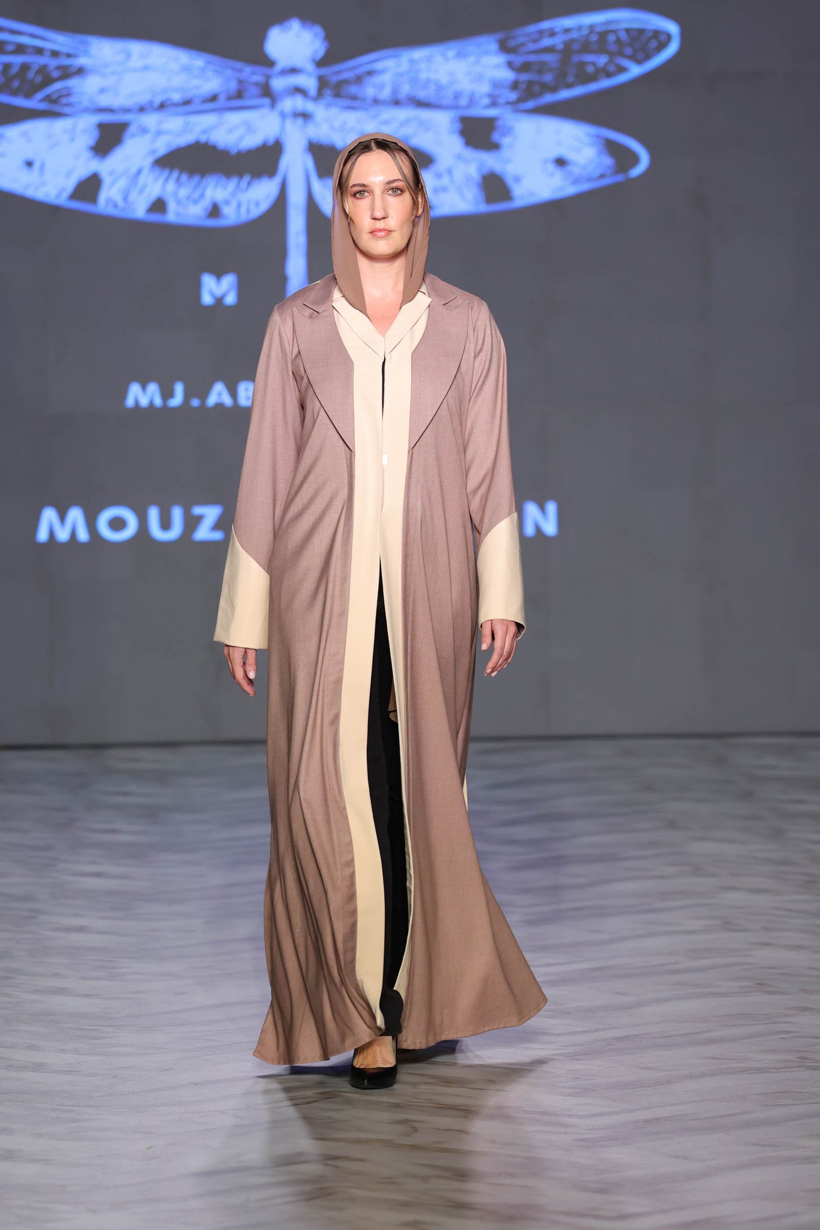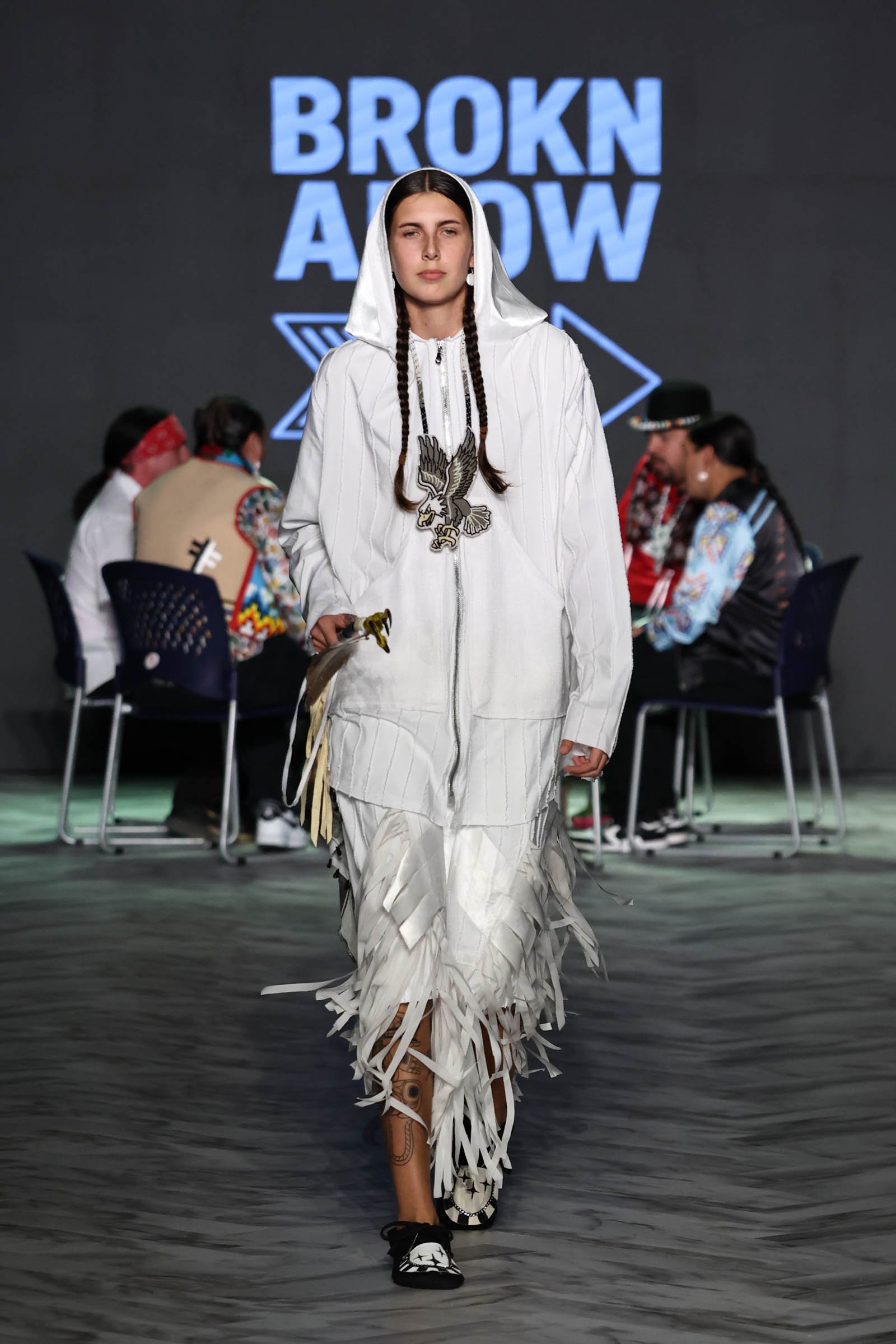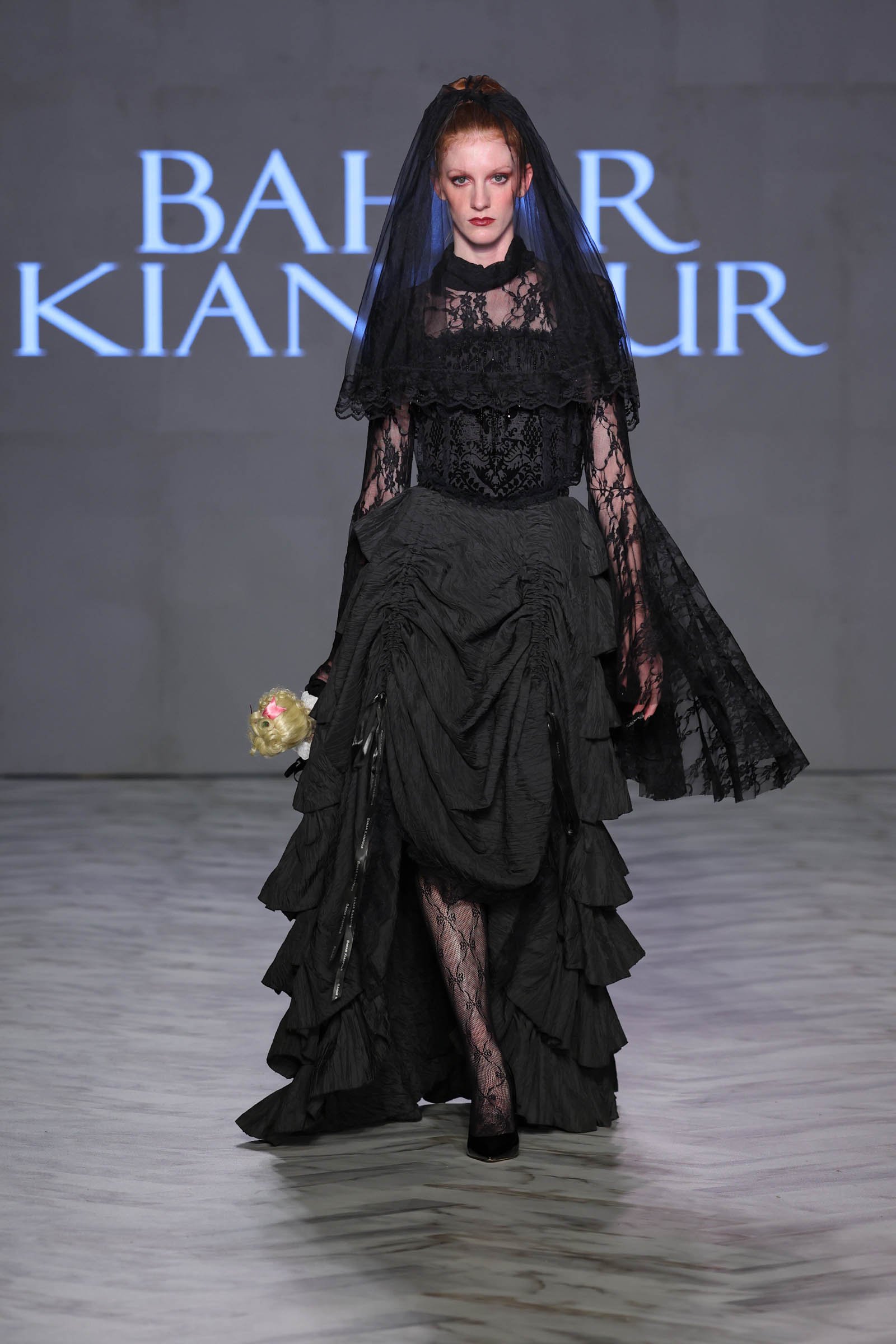 「アートと社会貢献の共存」を理念に掲げるブルータンバリンは、ミリタリーコードを再解釈。カーキやオリーブを基調としたユーティリティウェアに、テーラリングやスーツの要素を融合させ、力強さとエレガンスを交錯させたスタイルを打ち出した。ベレー帽やメタルアクセサリーの硬質な輝きと、軽やかなファブリックとの対比が印象を際立たせ、“規律と献身”の精神を纏うタフな美しさでランウェイを魅了した。