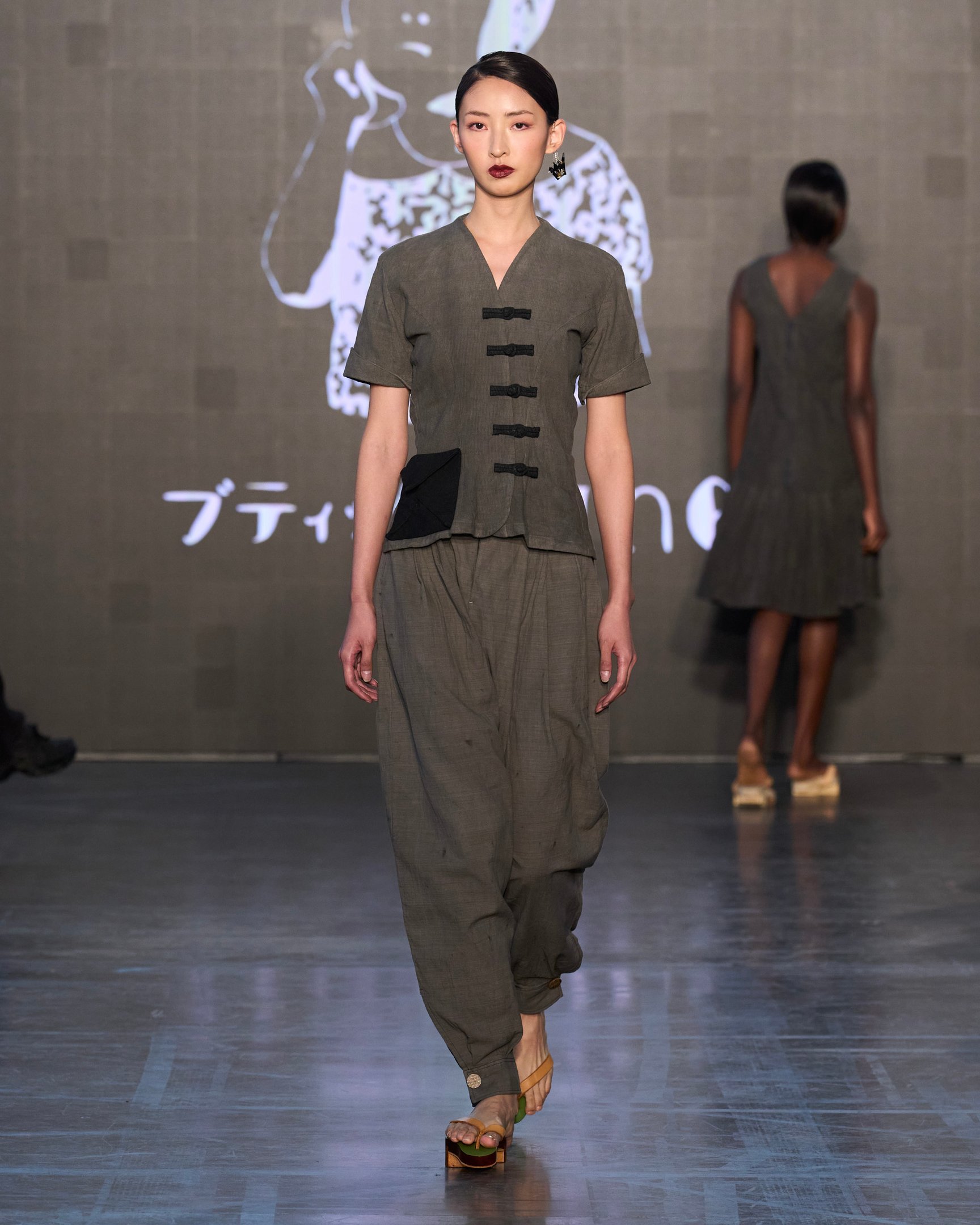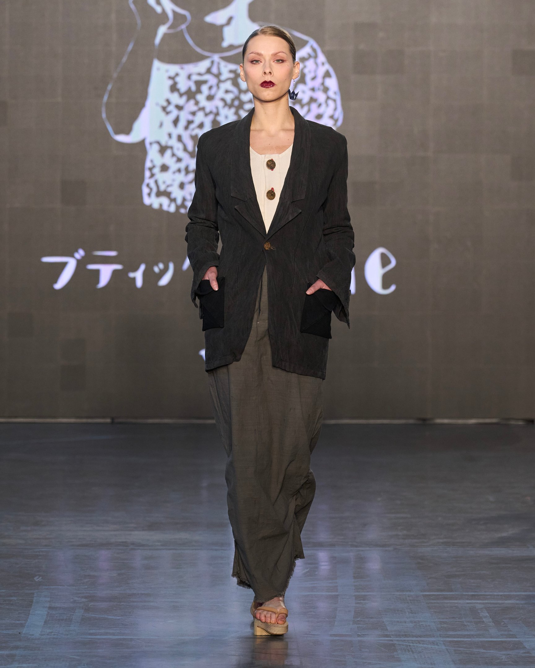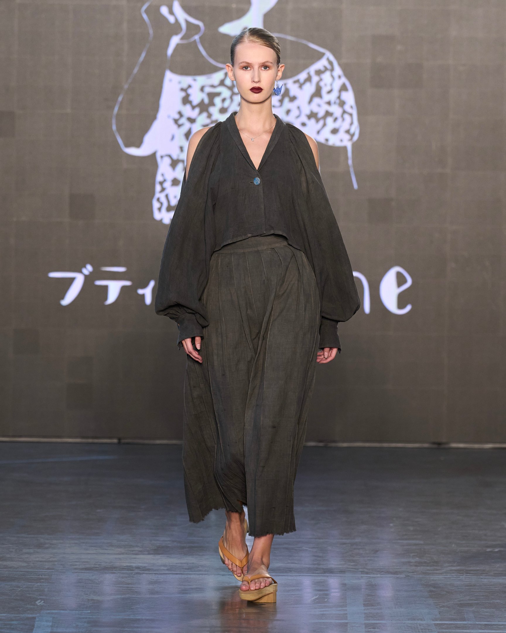 日本発ブランド、ブティック・ジューンが発表した「Light and Shadow」は、ホタ織の生地に水墨画のような深みのある墨染めを施し、光と影が交錯する奥行きを描いたコレクション。手織りならではの不均一な表情や、染めの濃淡が生む陰影、漆ボタンや立体的な縫製には、職人の手仕事と素材の生命力が滲む。伝統技術と現代の感性が交わる日本の美意識は、控えめな色調ながらもパリのランウェイに確かな存在感を示した。