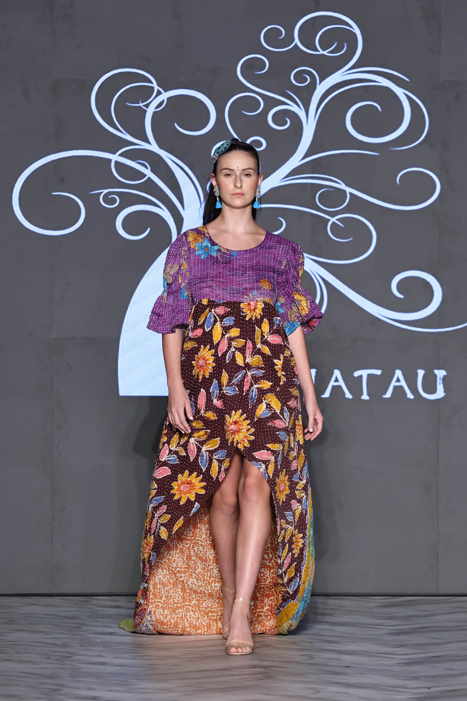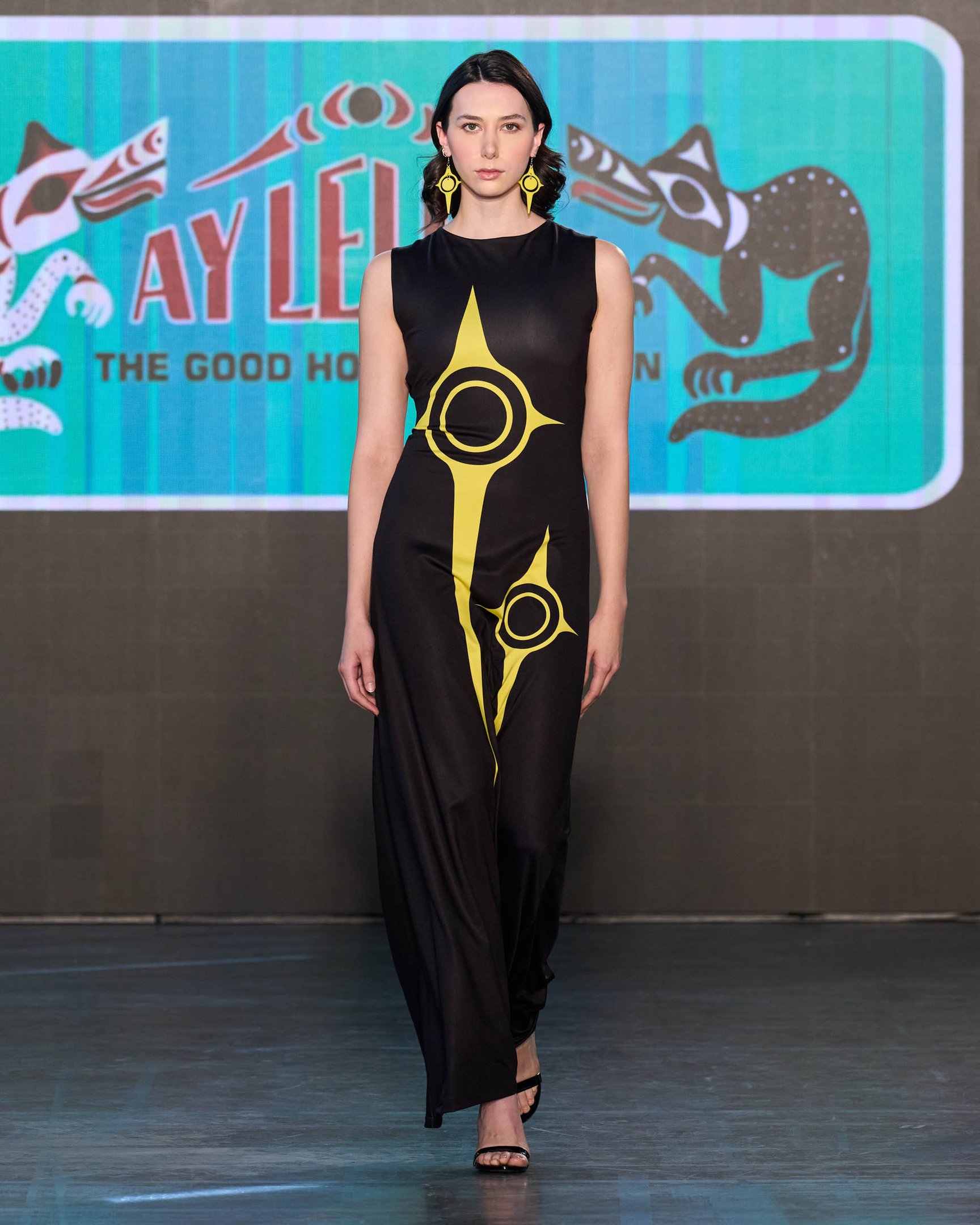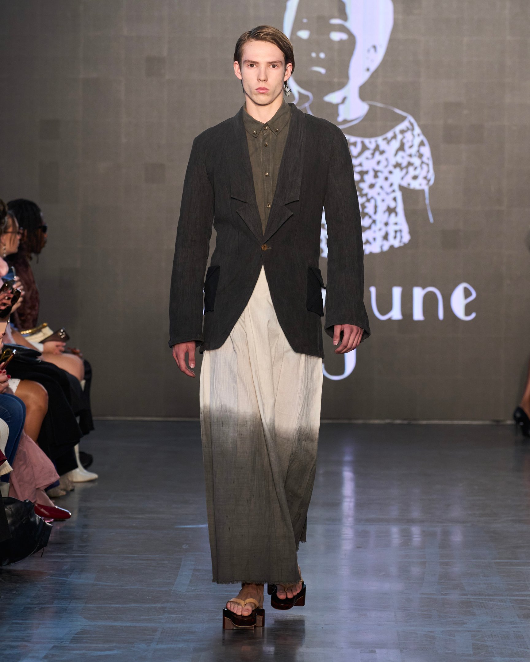 日本発ブランド、ブティック・ジューンが発表した「Light and Shadow」は、ホタ織の生地に水墨画のような深みのある墨染めを施し、光と影が交錯する奥行きを描いたコレクション。手織りならではの不均一な表情や、染めの濃淡が生む陰影、漆ボタンや立体的な縫製には、職人の手仕事と素材の生命力が滲む。伝統技術と現代の感性が交わる日本の美意識は、控えめな色調ながらもパリのランウェイに確かな存在感を示した。
