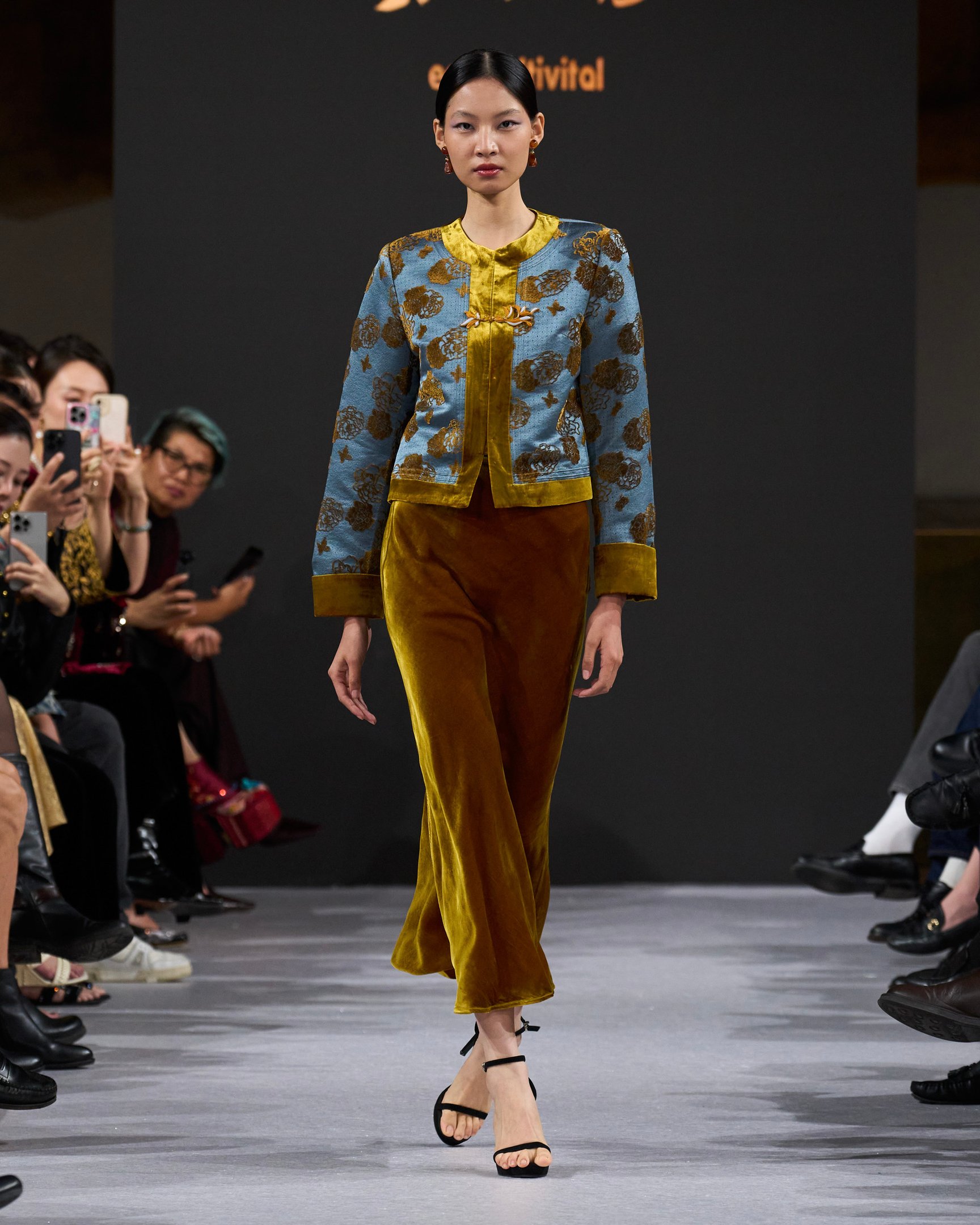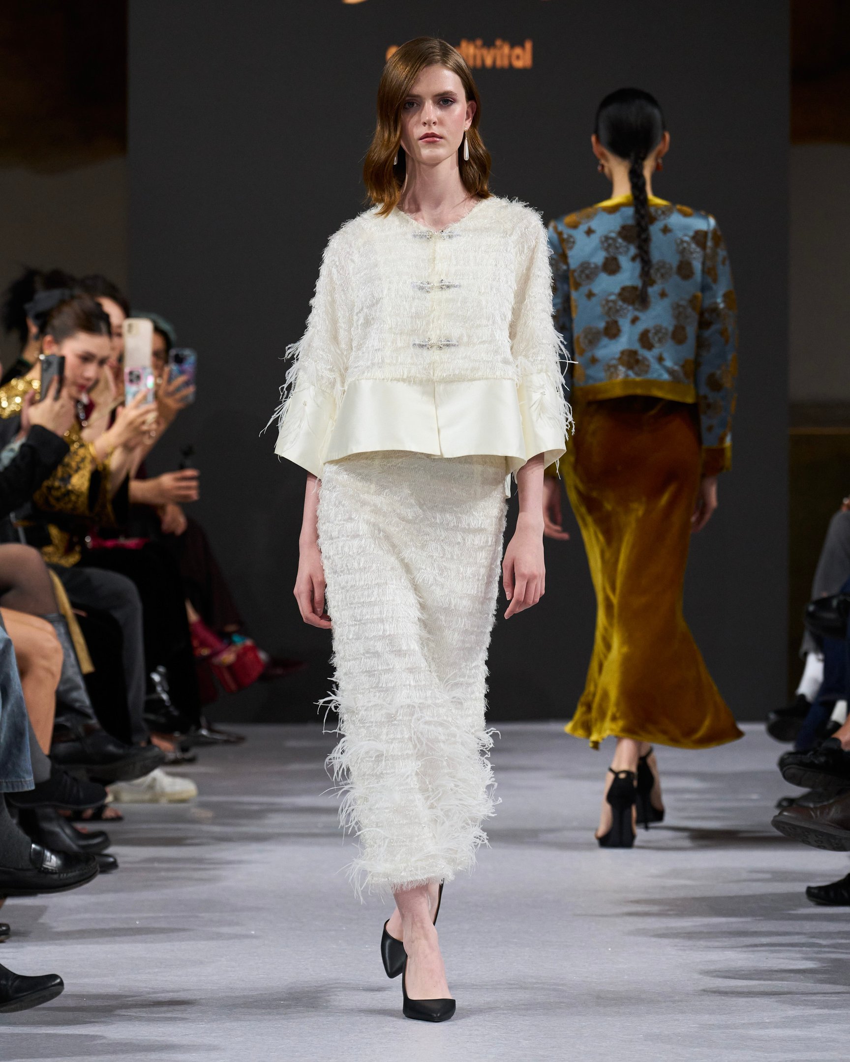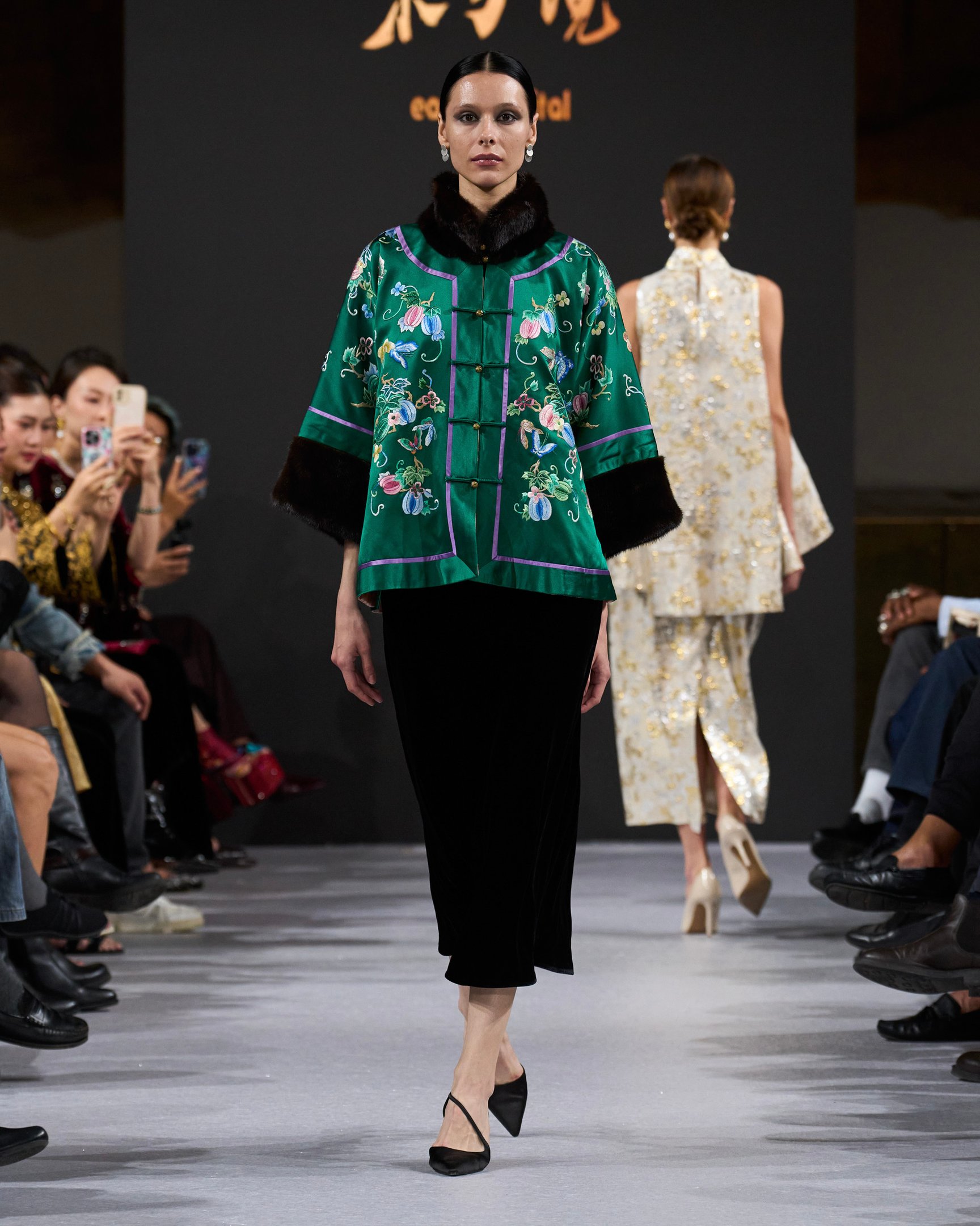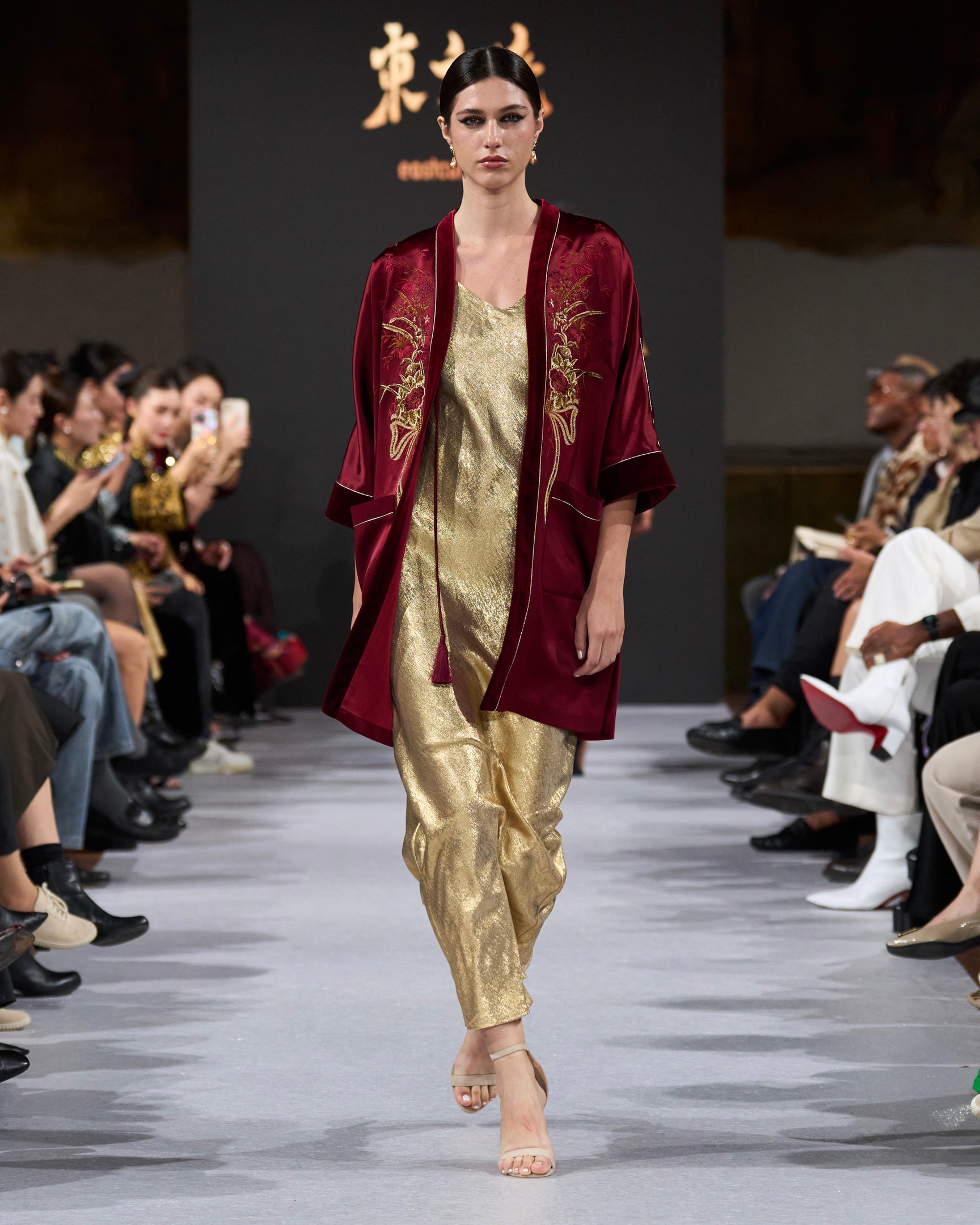 イーストカルティヴィタルは中国発ブランドらしく、無形文化財にも指定される刺繍技法をはじめ、職人の手仕事を随所に取り入れた華やかなルックでランウェイを彩った。光沢を帯びたサテンや重厚なベルベット、朱や金の糸で色鮮やかに施された刺繍、ケープスリーブやショートジャケットの独特なフォルムが、伝統的なチャイナウェアを彷彿とさせる。東洋の美意識を現代に昇華したアプローチで、気品あふれるスタイルを印象付けた。