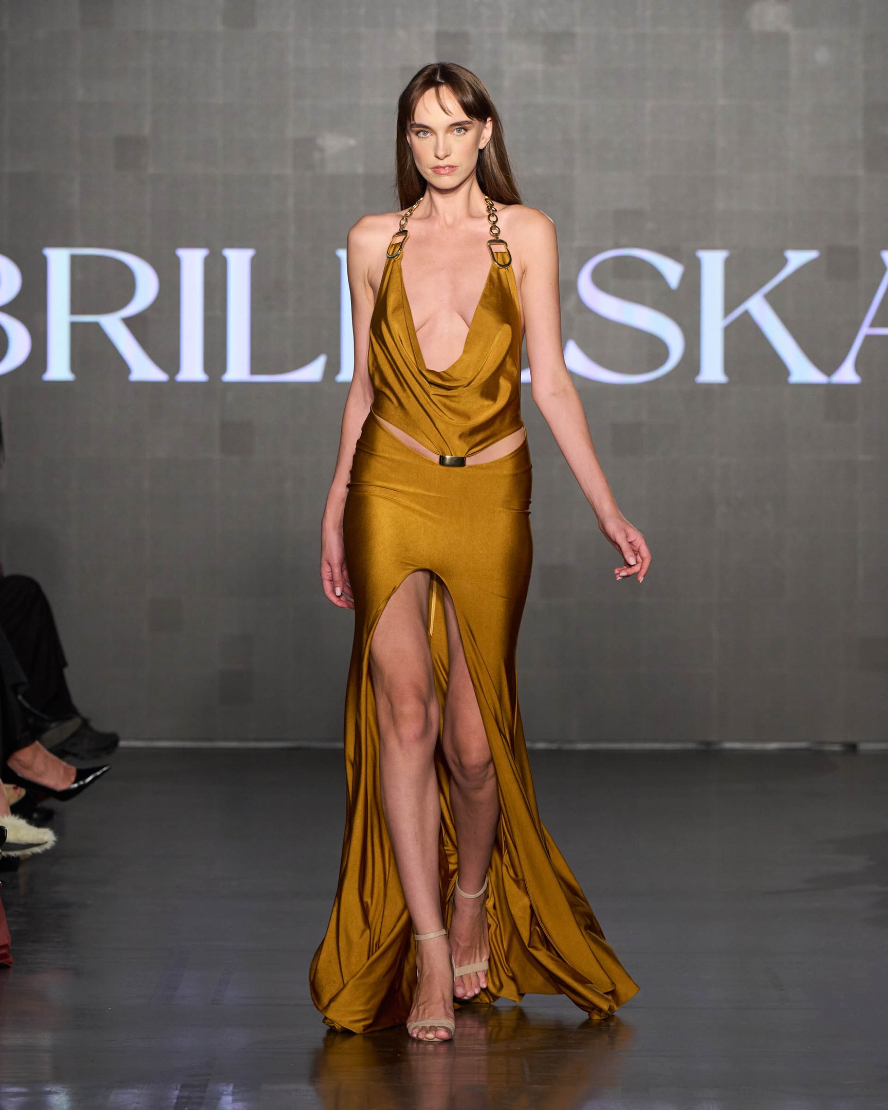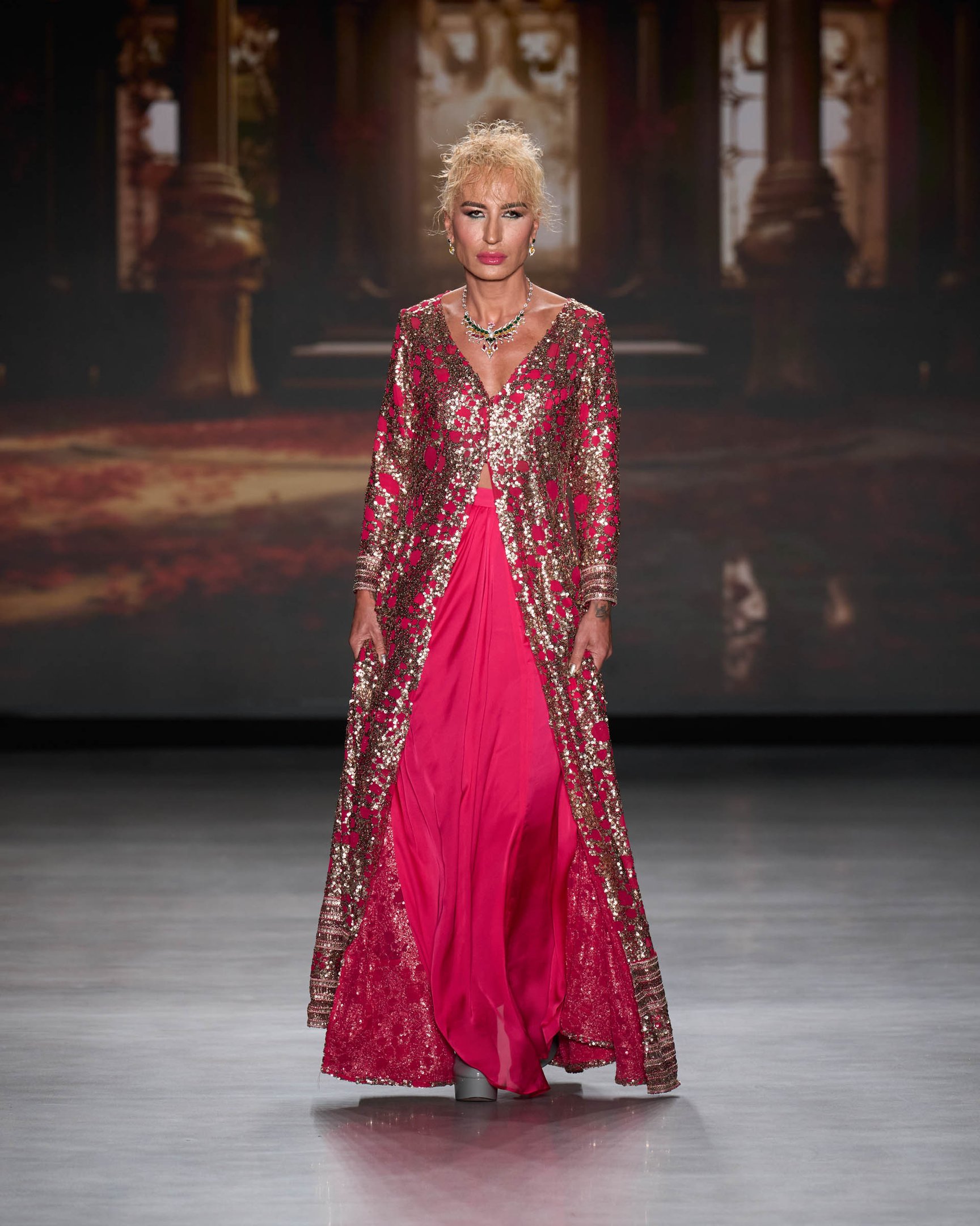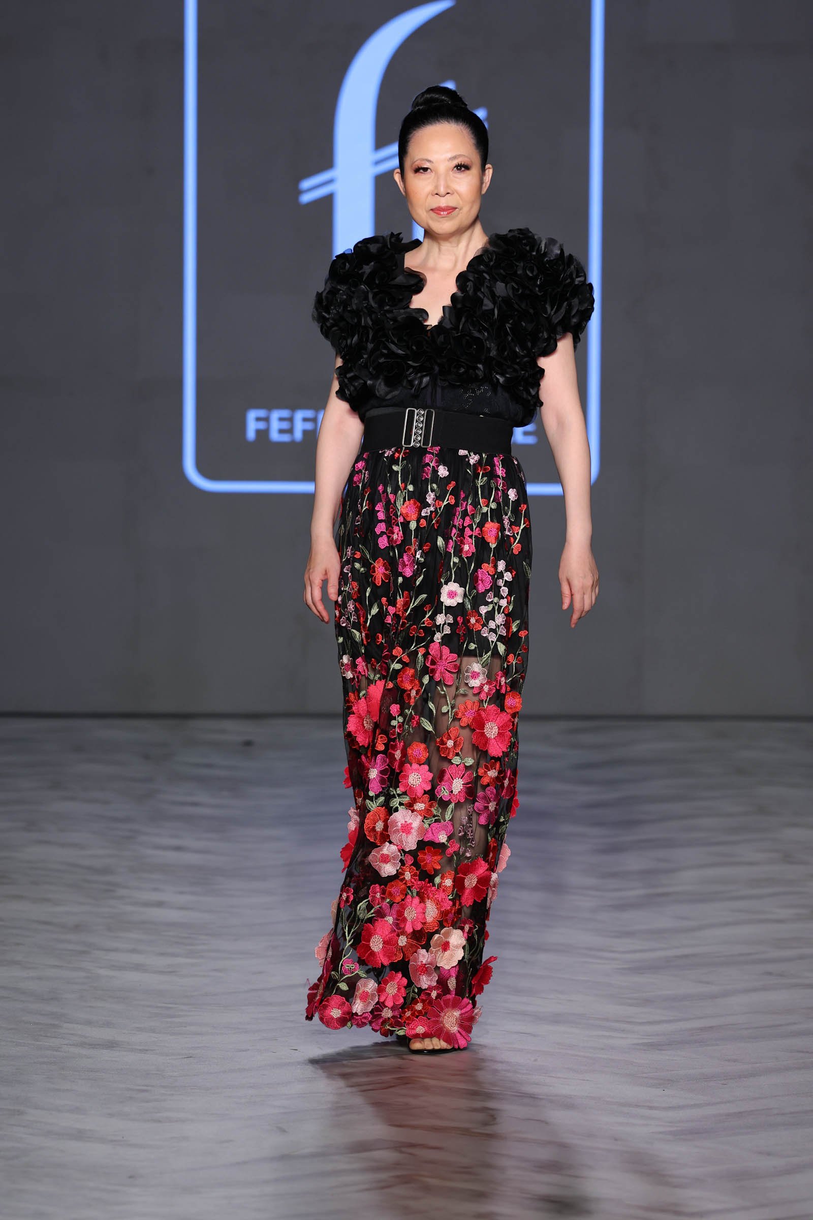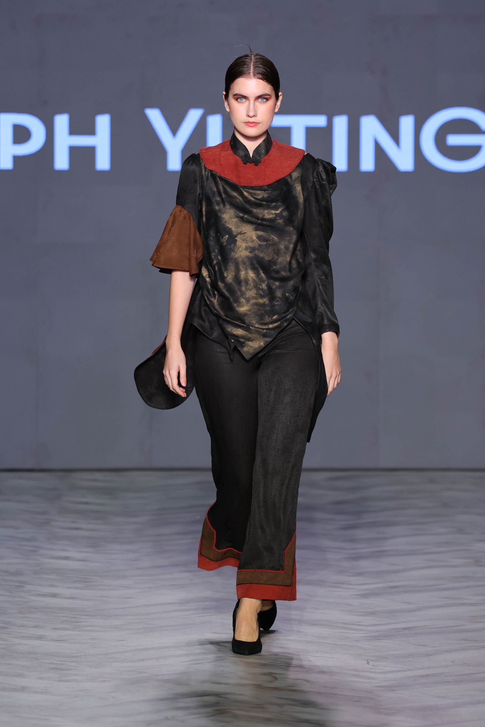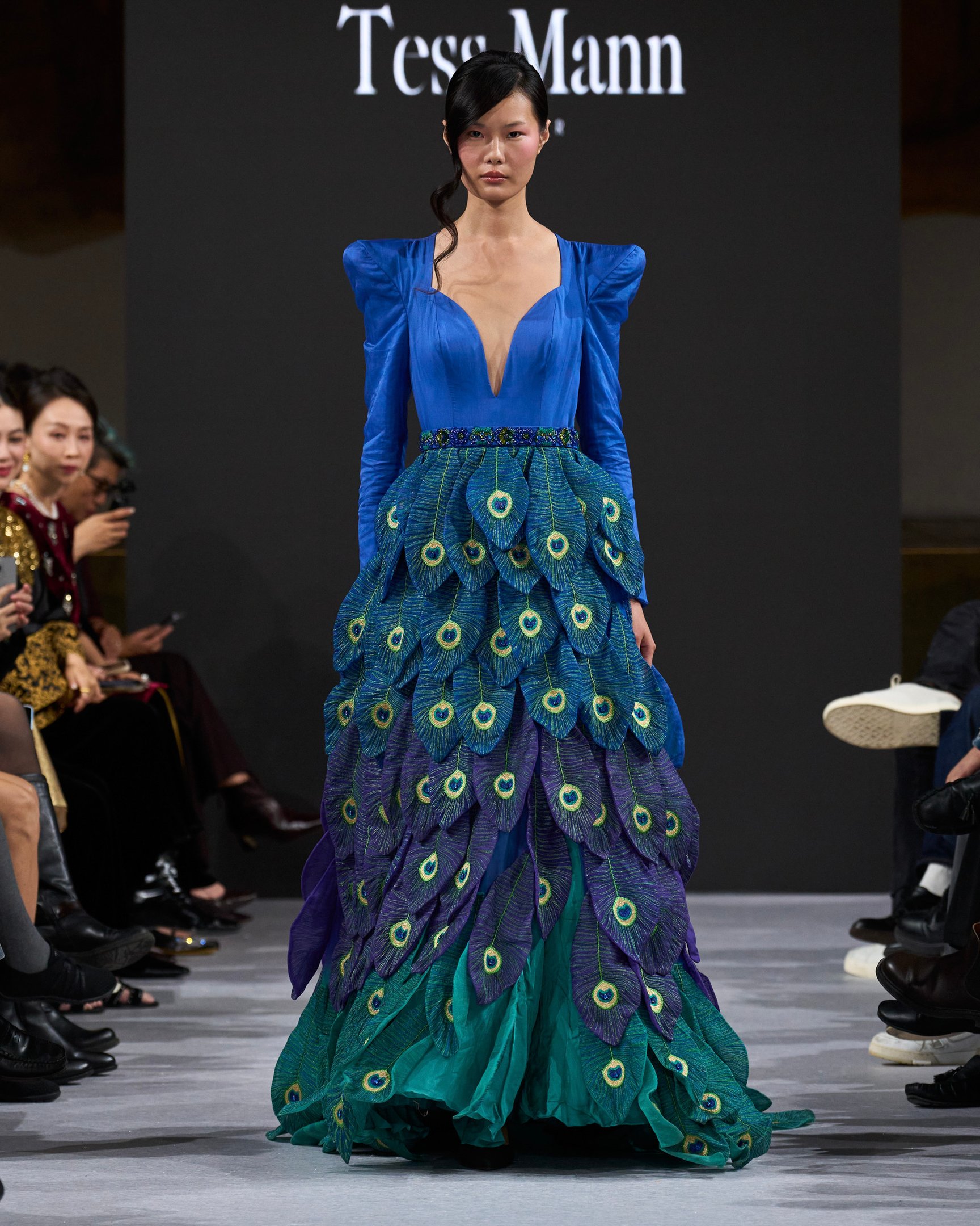 イーストカルティヴィタルは中国発ブランドらしく、無形文化財にも指定される刺繍技法をはじめ、職人の手仕事を随所に取り入れた華やかなルックでランウェイを彩った。光沢を帯びたサテンや重厚なベルベット、朱や金の糸で色鮮やかに施された刺繍、ケープスリーブやショートジャケットの独特なフォルムが、伝統的なチャイナウェアを彷彿とさせる。東洋の美意識を現代に昇華したアプローチで、気品あふれるスタイルを印象付けた。