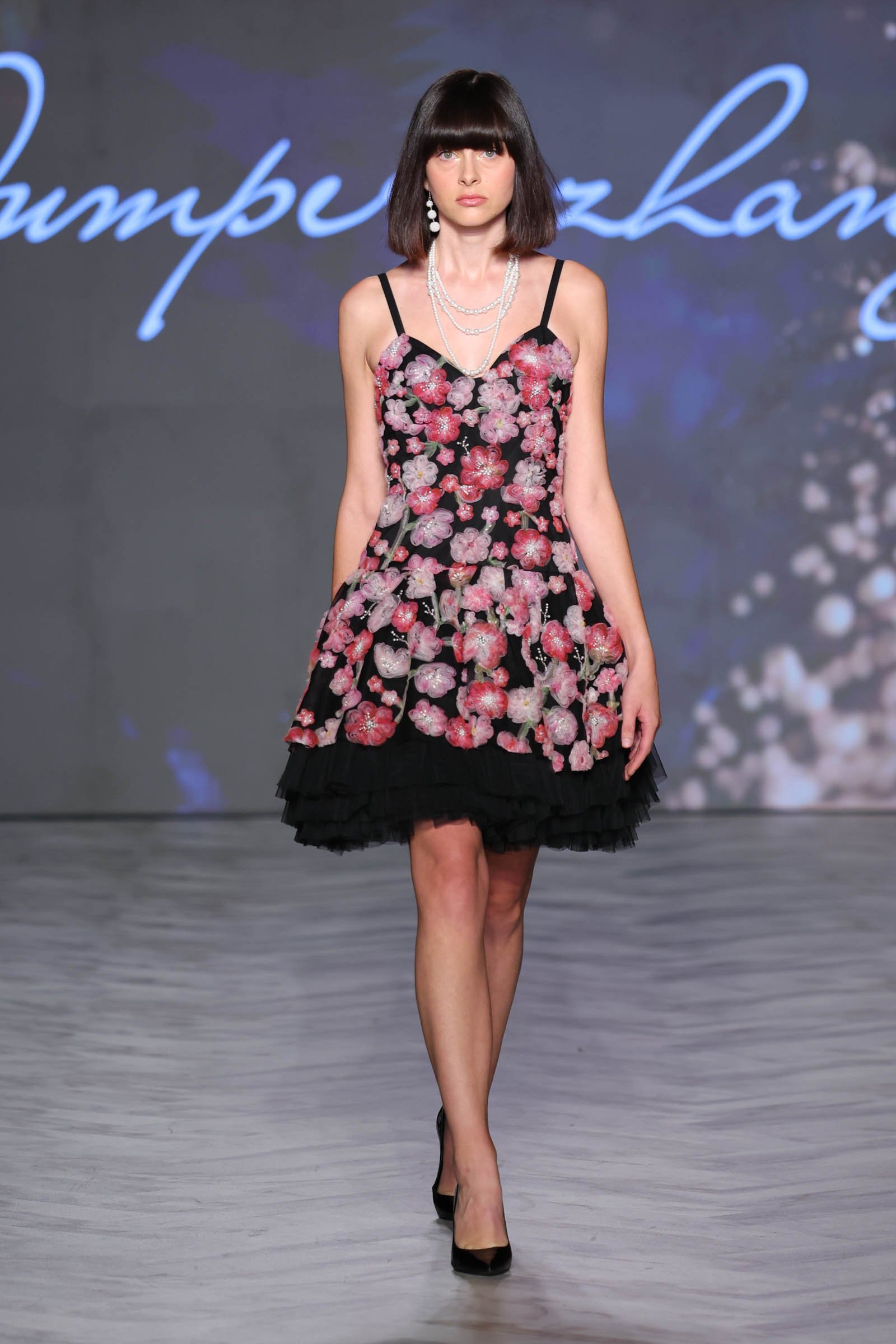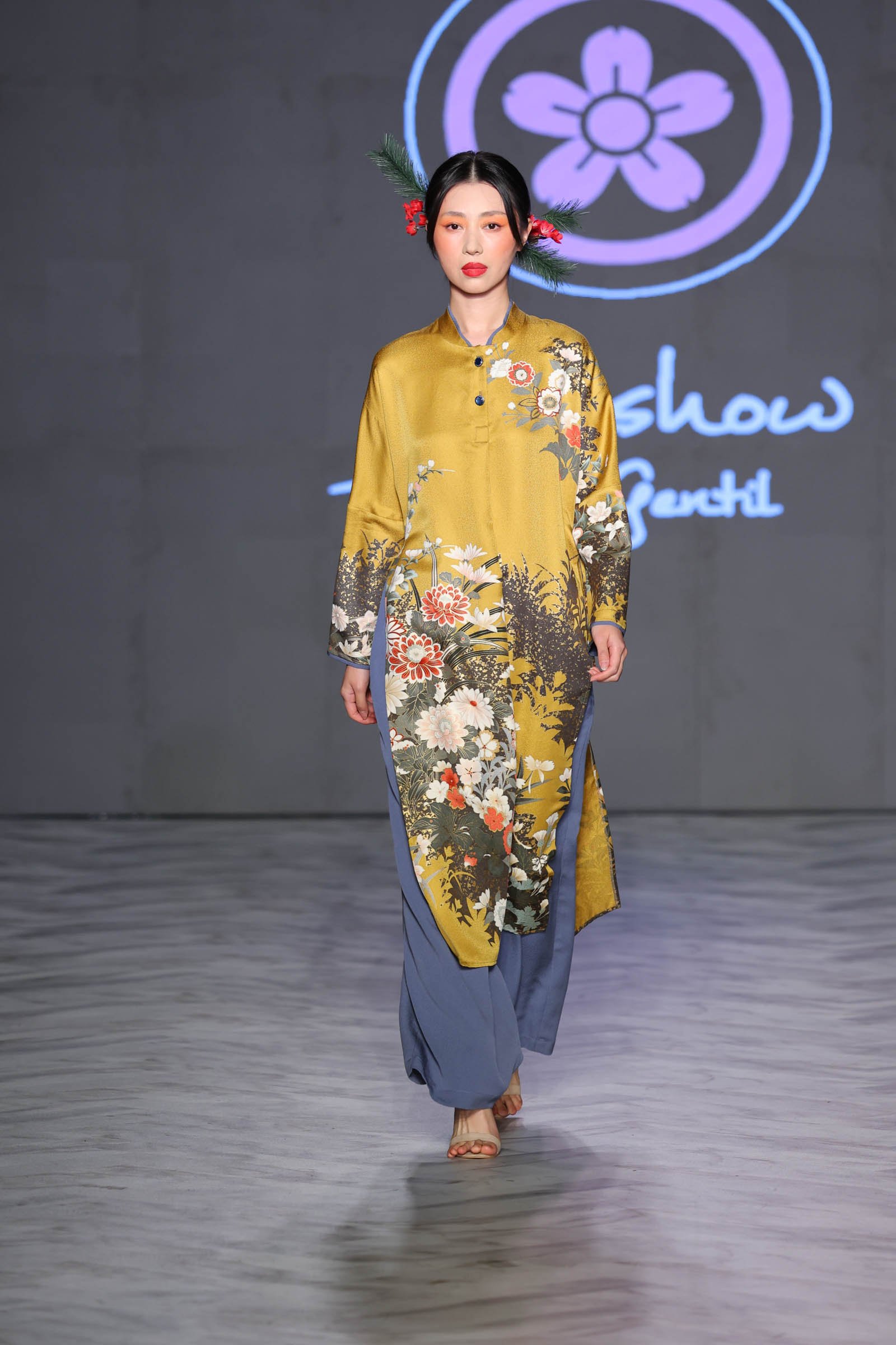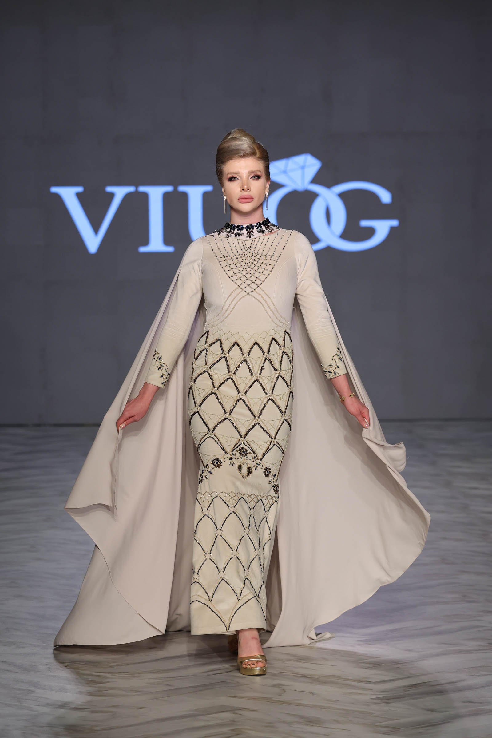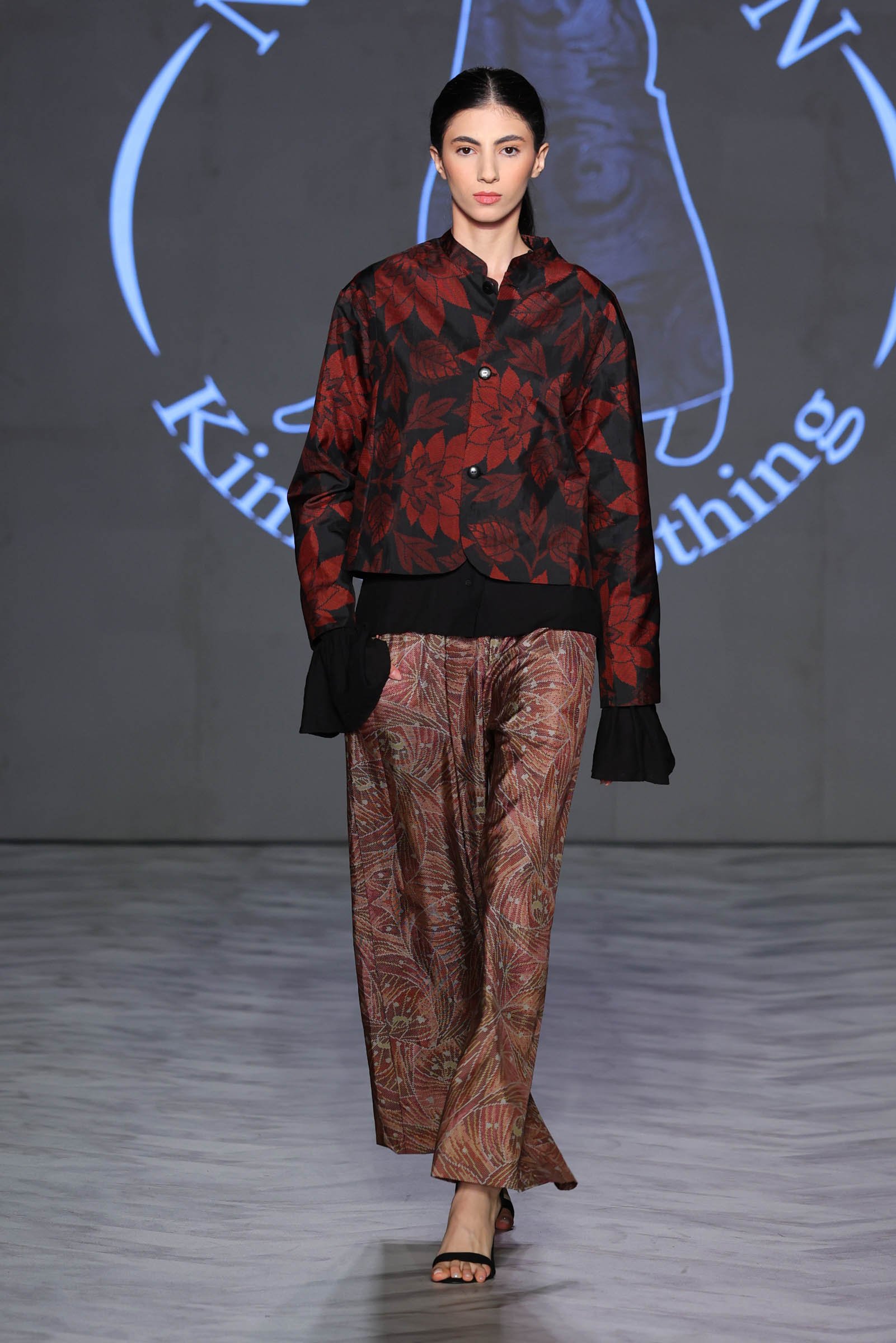 イーストカルティヴィタルは中国発ブランドらしく、無形文化財にも指定される刺繍技法をはじめ、職人の手仕事を随所に取り入れた華やかなルックでランウェイを彩った。光沢を帯びたサテンや重厚なベルベット、朱や金の糸で色鮮やかに施された刺繍、ケープスリーブやショートジャケットの独特なフォルムが、伝統的なチャイナウェアを彷彿とさせる。東洋の美意識を現代に昇華したアプローチで、気品あふれるスタイルを印象付けた。