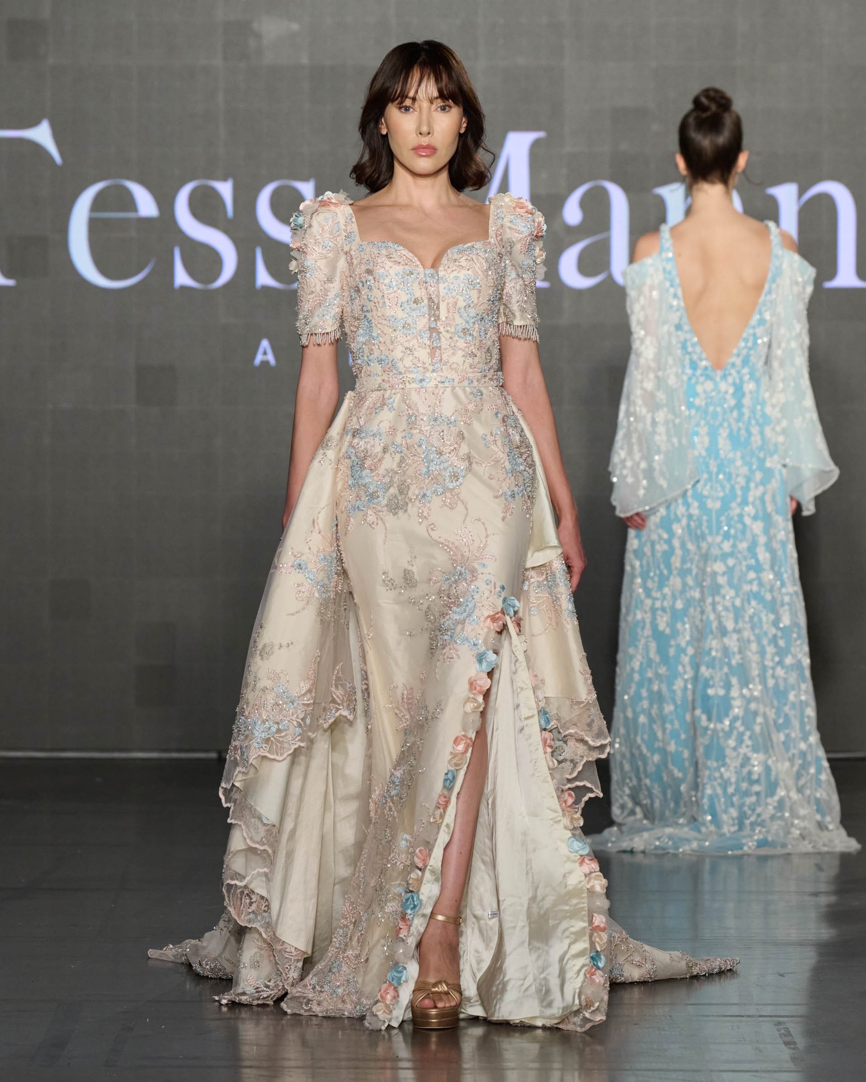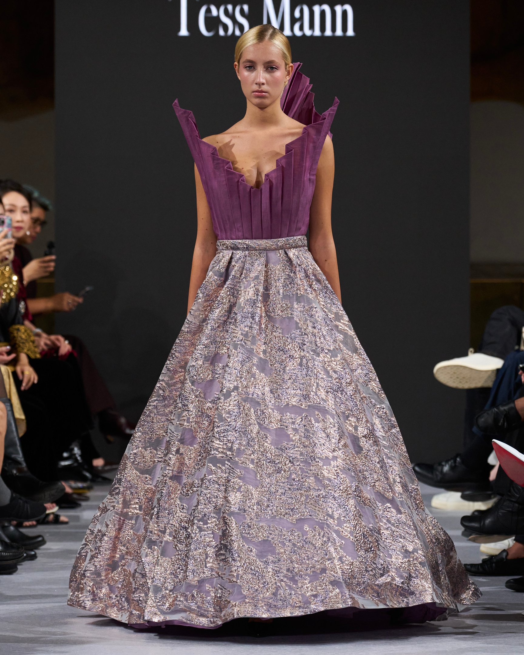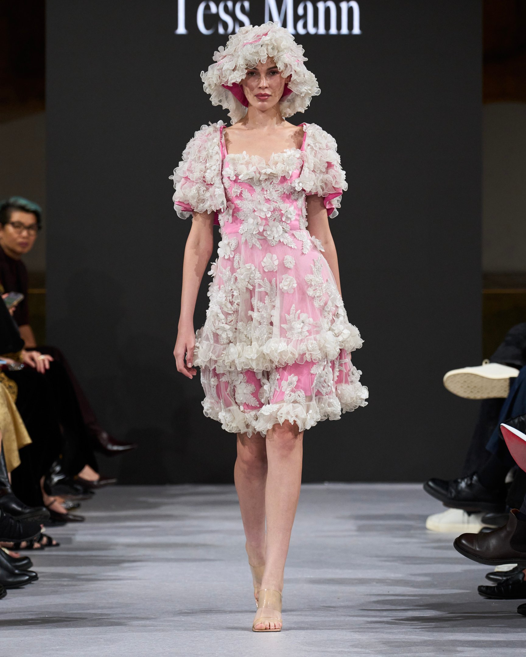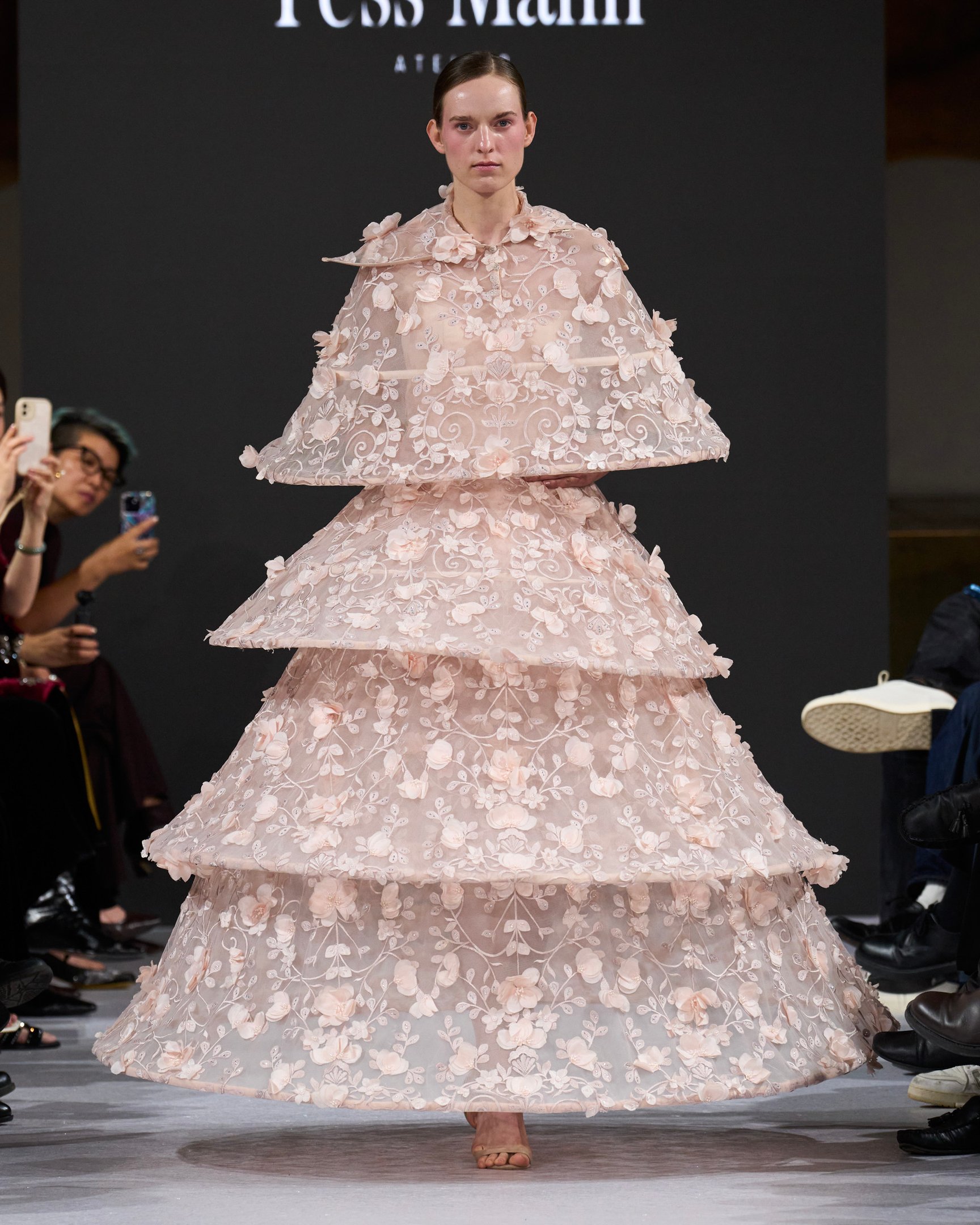 壮麗な美しさが漂うテスマン・アトリエは、ヴェルサイユ庭園に着想を得たコレクションが印象的。建築的なシルエットと緻密な装飾が織りなすドレスは、バロックの華やかさと現代的な軽やかさを巧みに共存させている。幾重にも重なるレースや贅沢なフリル、花を思わせる立体的なモチーフが動きに合わせて表情を変え、ロマンティックな高揚を生み出す。職人技が冴え、造形美に富んだルックの数々は優雅な余韻を残している。