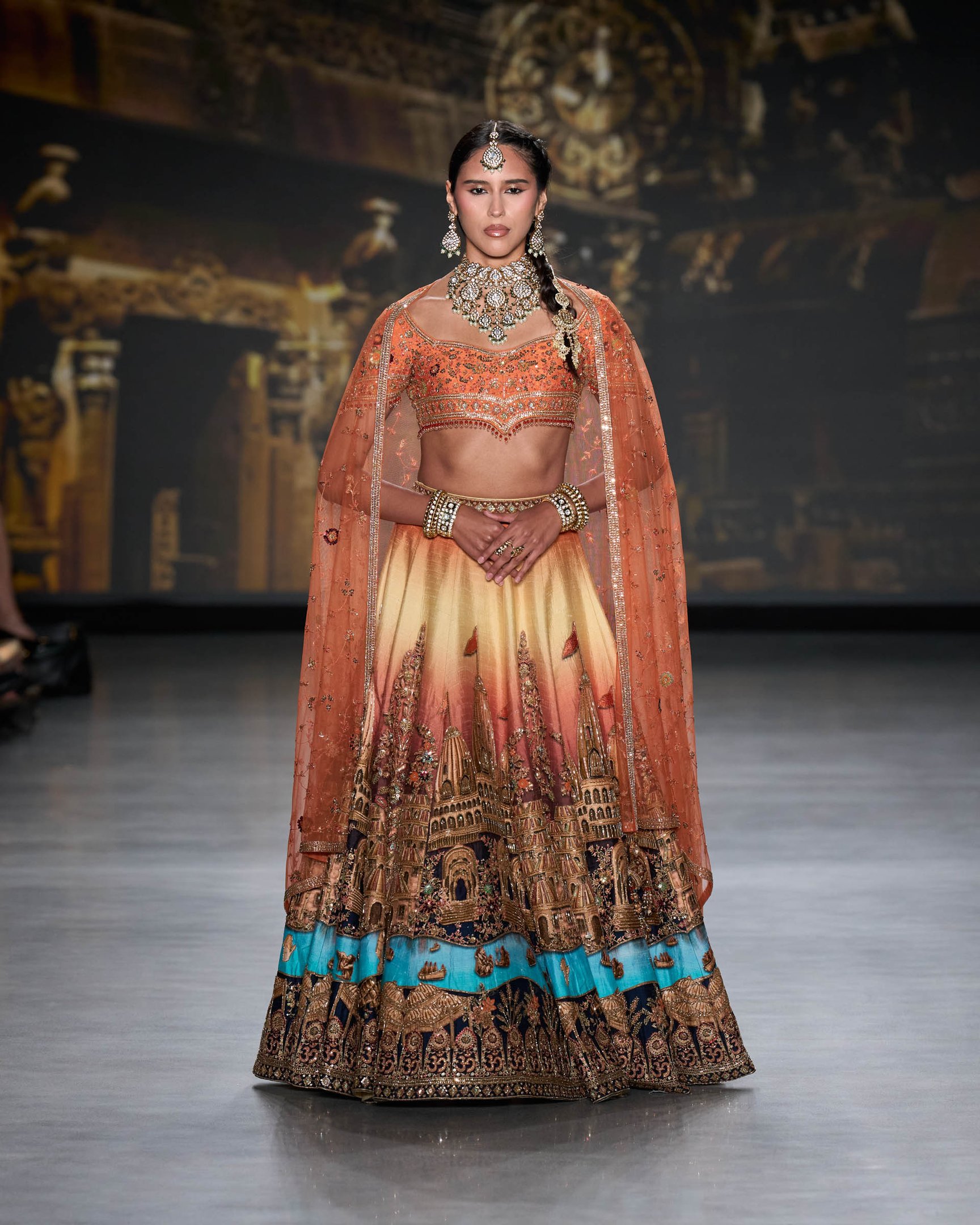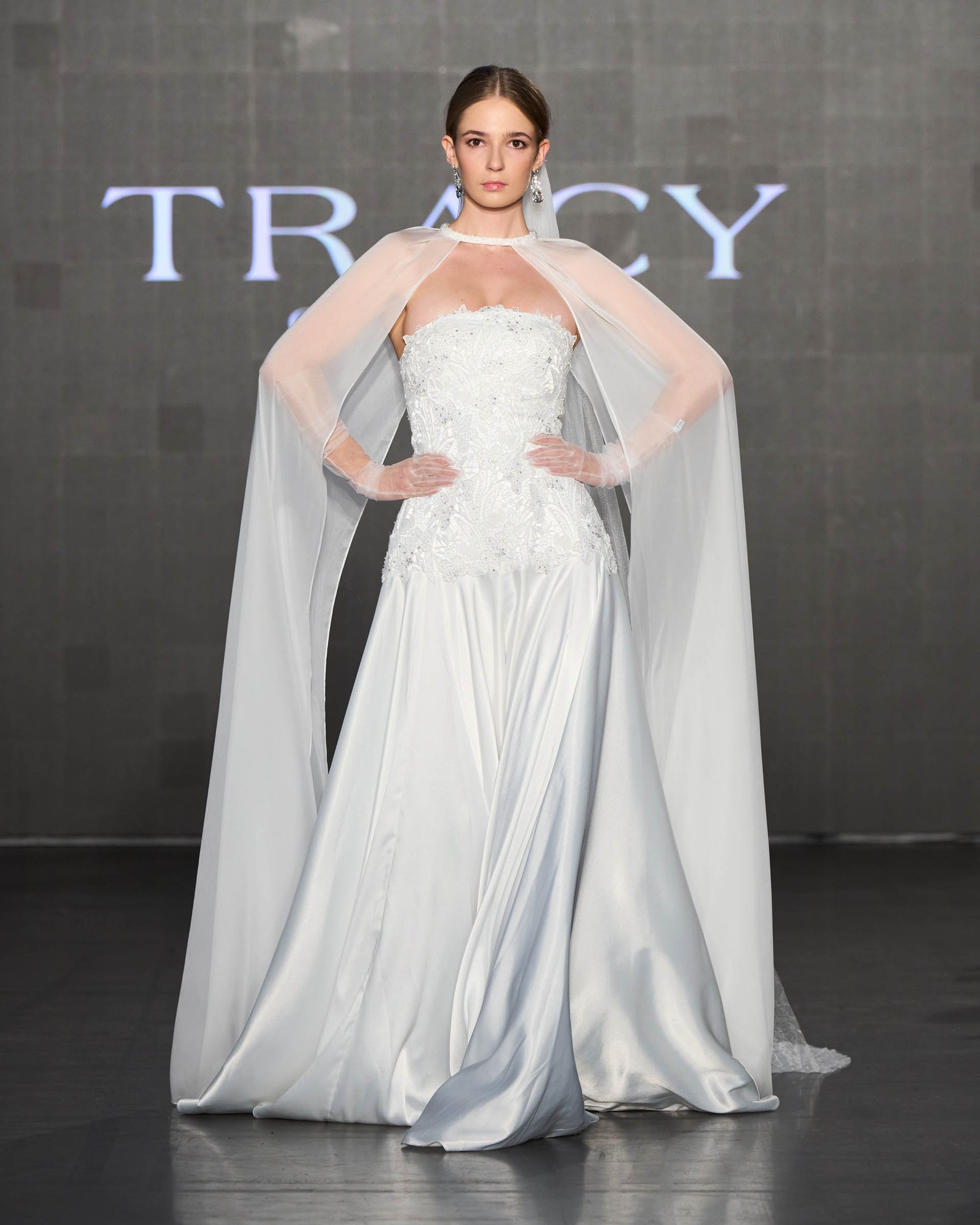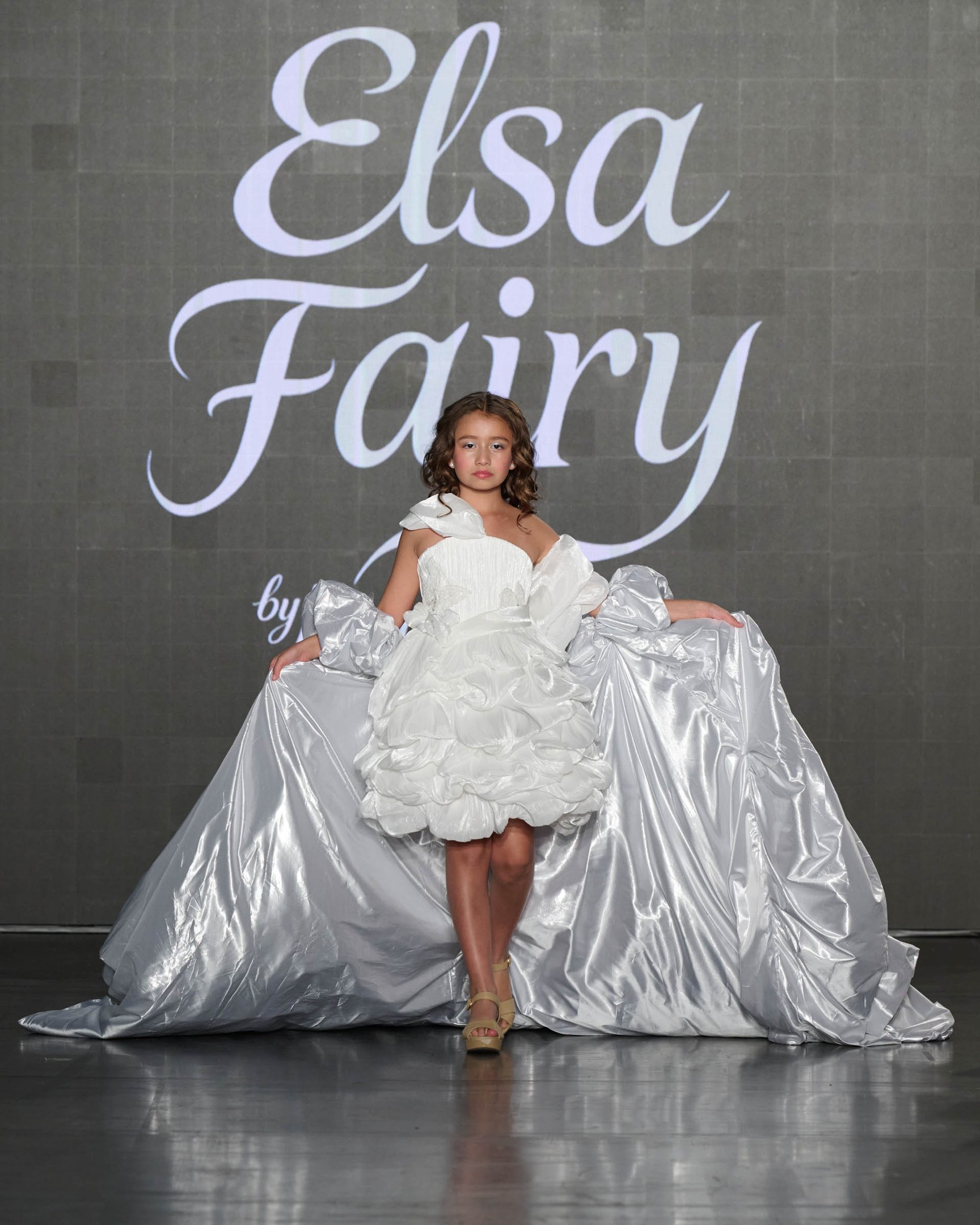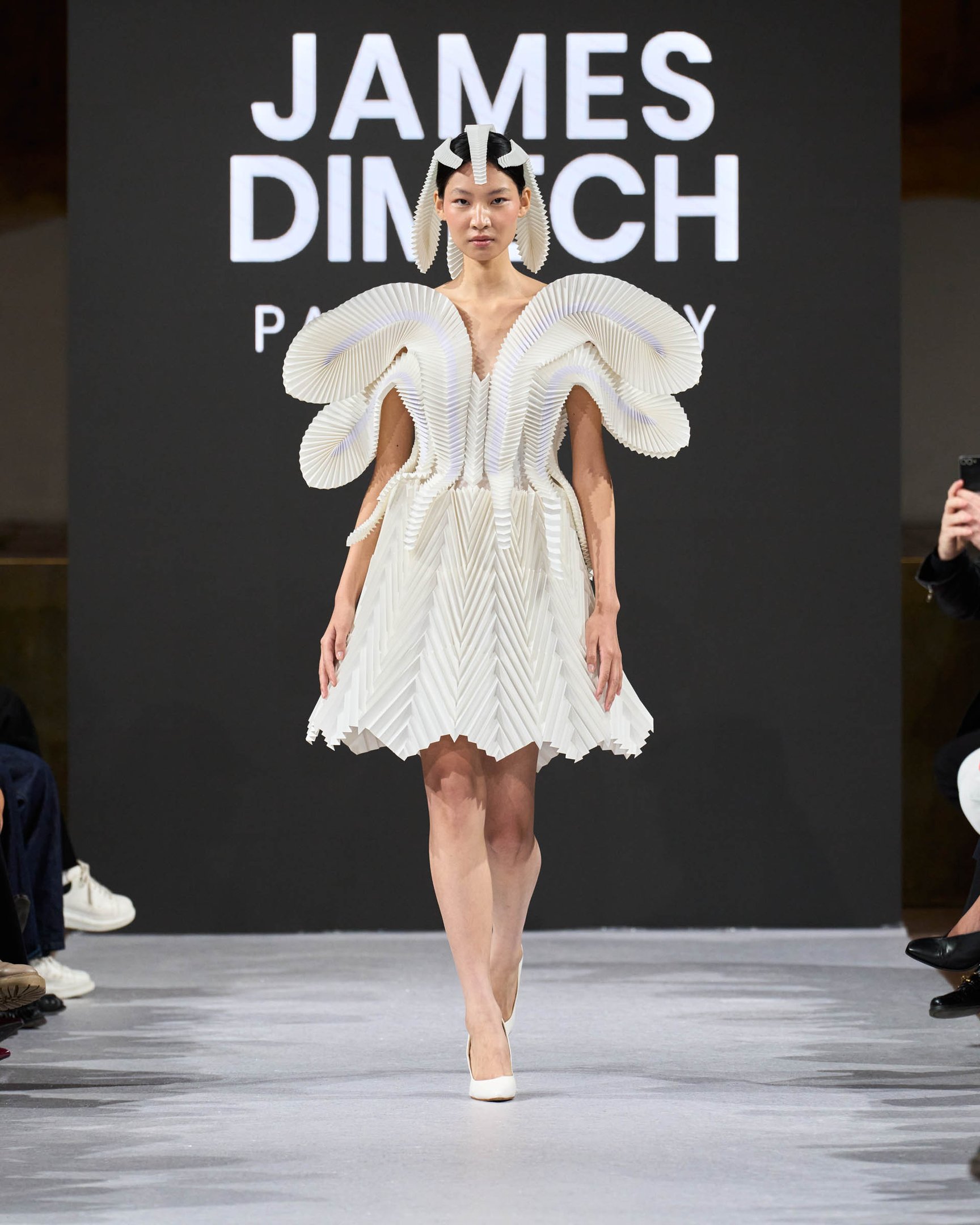 壮麗な美しさが漂うテスマン・アトリエは、ヴェルサイユ庭園に着想を得たコレクションが印象的。建築的なシルエットと緻密な装飾が織りなすドレスは、バロックの華やかさと現代的な軽やかさを巧みに共存させている。幾重にも重なるレースや贅沢なフリル、花を思わせる立体的なモチーフが動きに合わせて表情を変え、ロマンティックな高揚を生み出す。職人技が冴え、造形美に富んだルックの数々は優雅な余韻を残している。