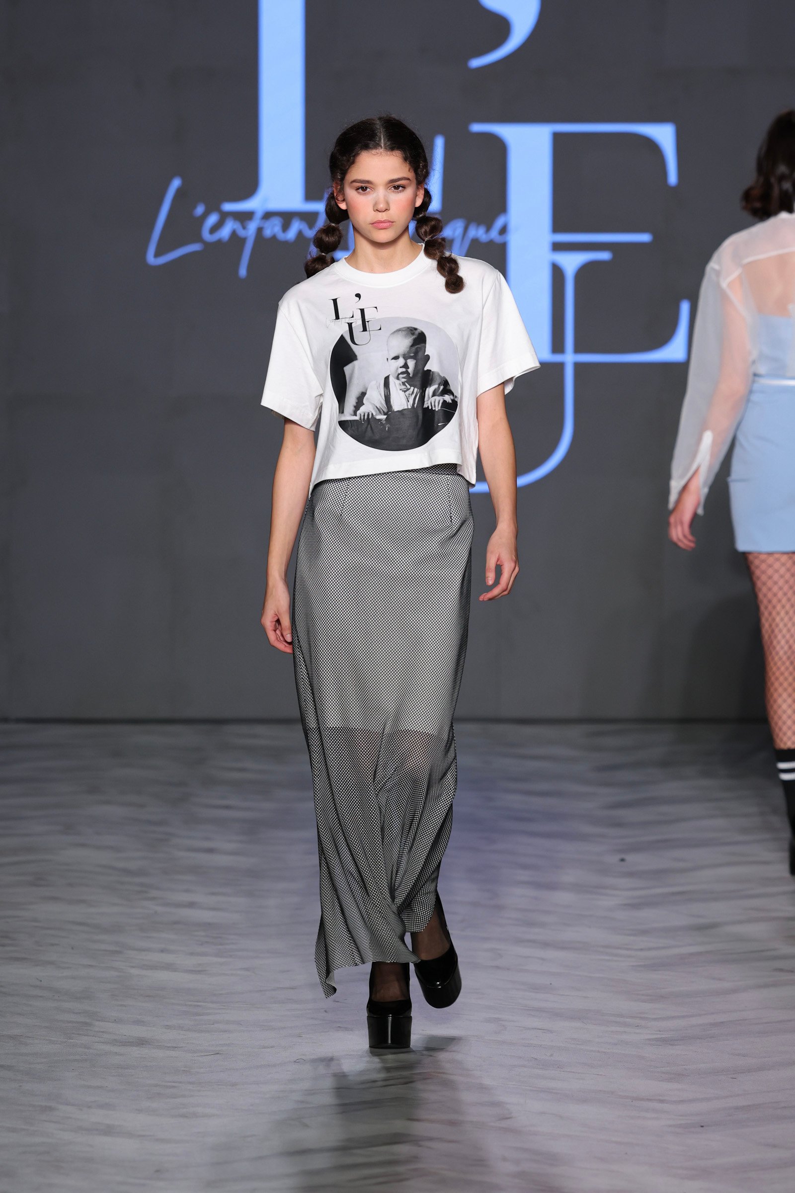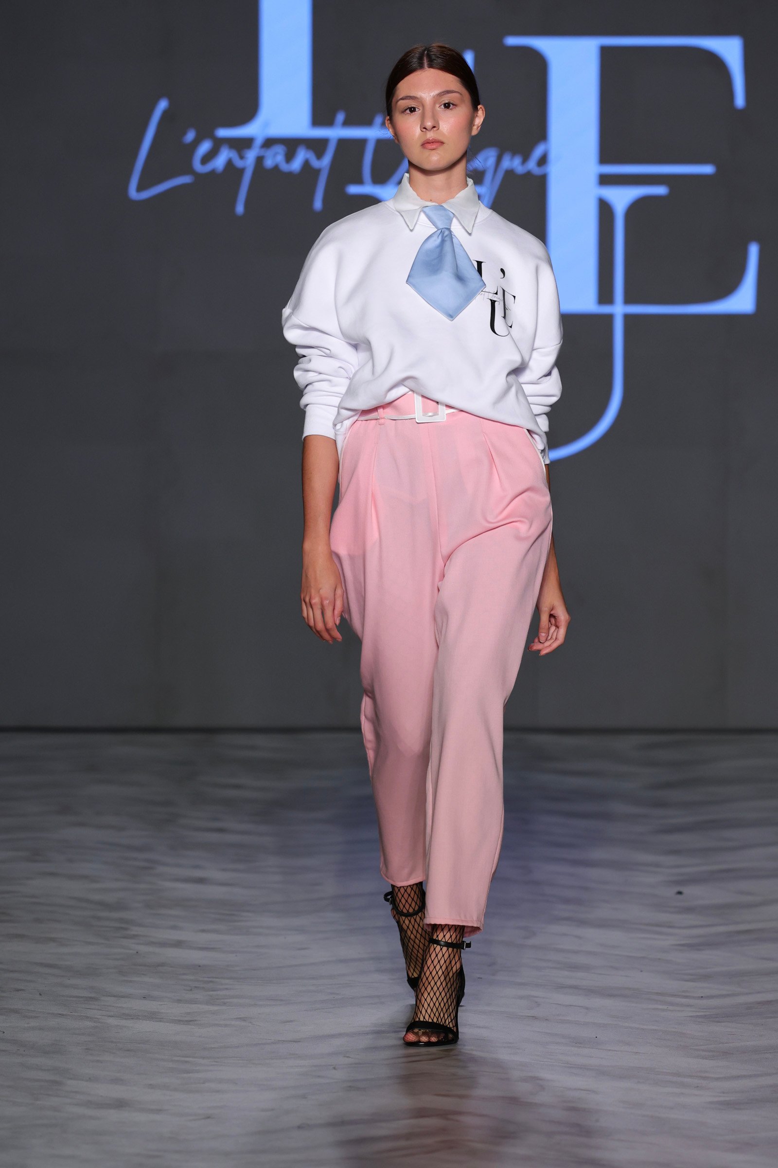クラシックなエッセンスに遊び心を掛け合わせた、ロンファン・ユニーク。淡いピンクやサックスブルーの軽やかなカラーパレットに、オーガンジーやサテンなど、透過と艶のニュアンスを重ね、カジュアルなTシャツやトレーナーにも上質さをもたらしている。首元のタイやロゴ使いには、ほんのりスクールムードなノスタルジーが漂い、ピュアな感性と大人の洗練が調和した独自のスタイルを確立している。