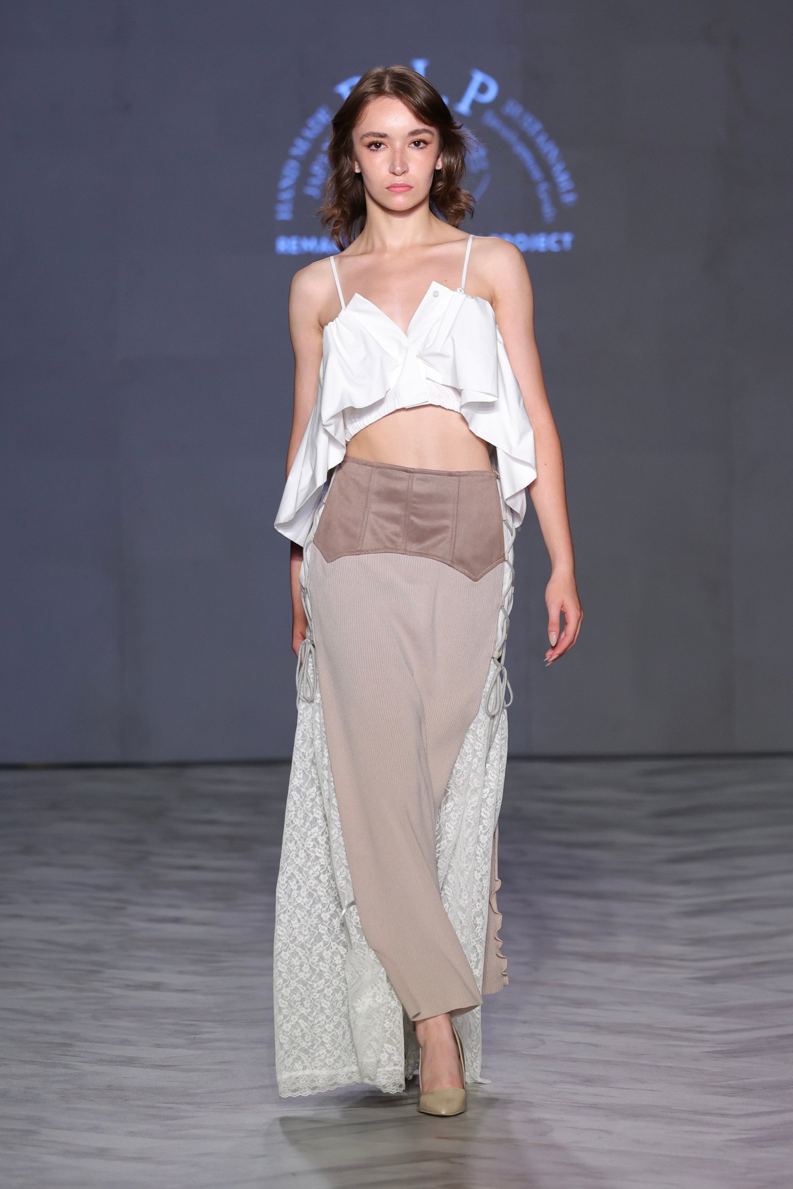 日本の静岡を拠点に展開するR.I.Pは、スティーブ・ジョブズのスピーチ「点と点をつなぐ」に着想を得たコレクションを発表。捨てられる運命だった衣服や残布を素材に、解体と再構築で新たな表情を生み出した。ねじりや裁ち切りのディテールが生む不均一なリズムや、糸が絡み合うように流動するフォルムは、生命のつながりをも感じさせる。R.I.Pはサステナビリティを出発点に、ジャパンメイドによる“再生の美学”を更新し続けている。