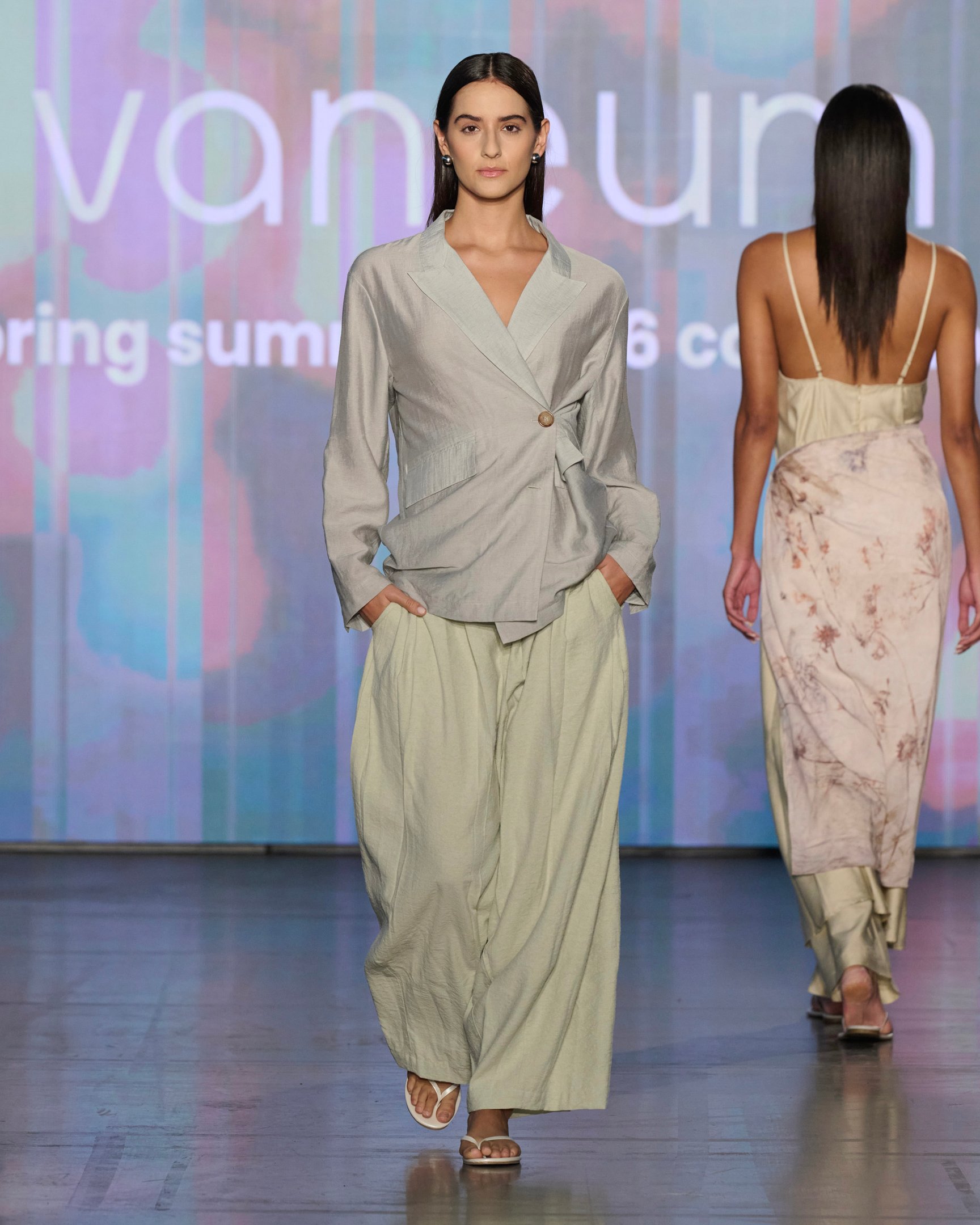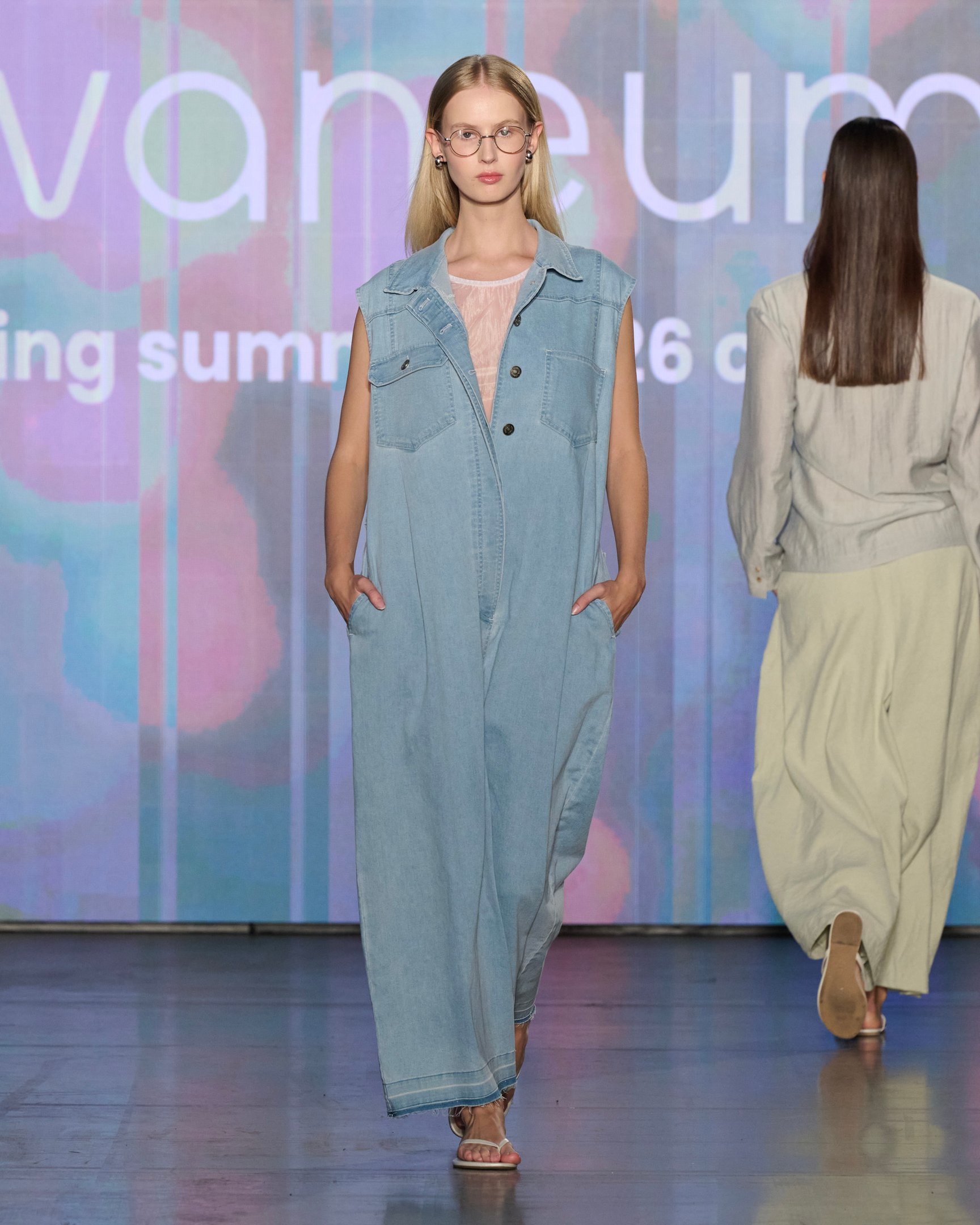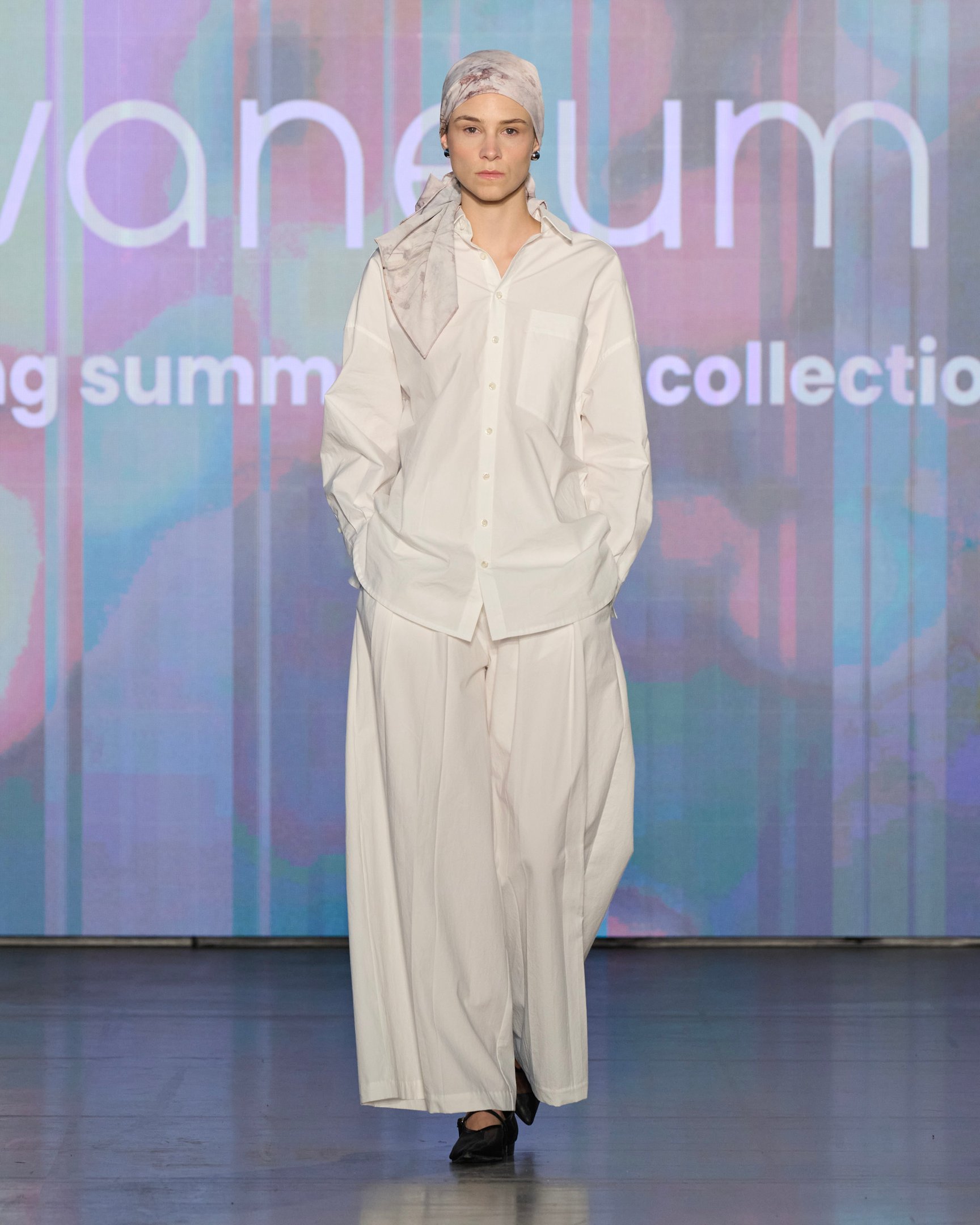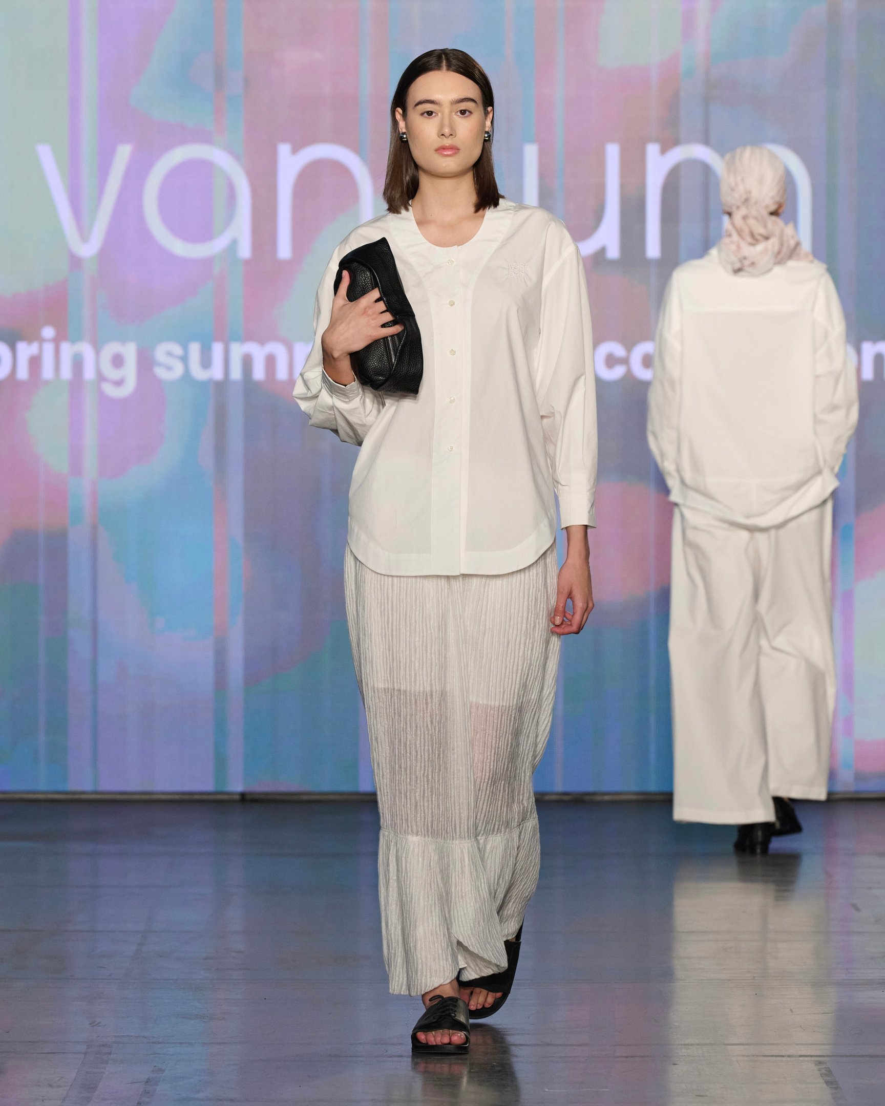 バニュームのコレクションは“静けさの中の高揚”がテーマ。リネンやシアー素材を中心とした空気をはらむシルエットに、ホワイトやベージュの柔らかなトーンが重なり合い、穏やかなリズムを生み出している。日常の延長にあるエレガンスを軽やかに表現し、素材の質感を活かしたクリーンさも心地いい。実用的でありながら、ノンシャランな魅力と品のある佇まいで、日本独自のニュートラルな感性を世界へと広げている。
