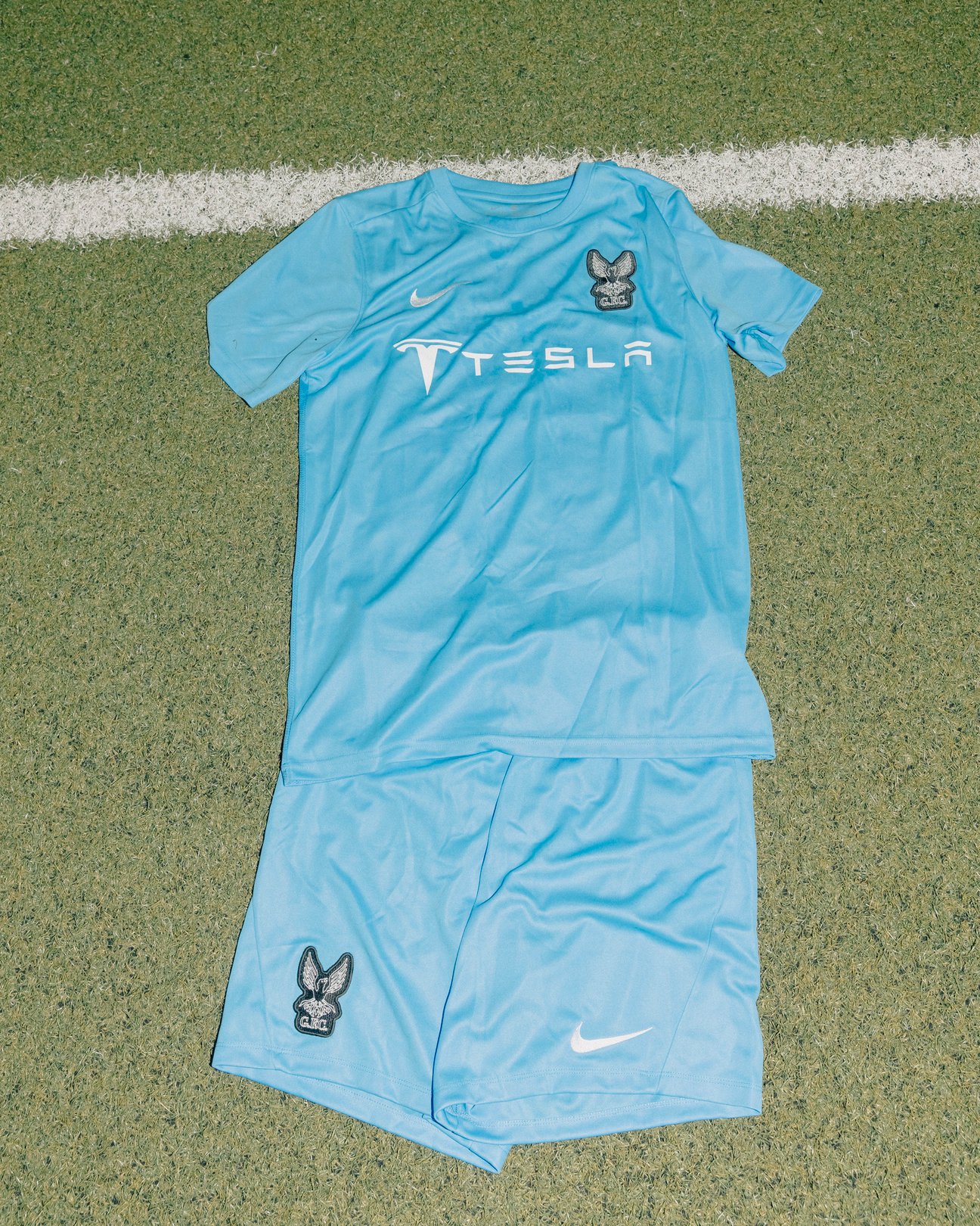 ユニフォームのデザインはチームメンバーとの話し合いながら決めていくそう。今日の試合で登場したのはブラック、ブルーのユニフォーム計2種類、トレーニングウェア1種類の全3種類。ユニフォームには「ロールス・ロイス(Rolls-Royce)」や「テスラ(Tesla)」のグラフィックがスポンサーロゴ風にあしらわれ、遊び心のあるデザインに。ボディの形をはじめ、柄や色を決めた後、胸スポンサーの企業を決定。「ユニフォームを作るとなると一般的には一括で全部やってくれる所で注文するのがベーシックなんですけど、面白みのないデザインになってしまうのが僕らはイヤで(笑)。皆んなファッションへの情熱がすごいので、自ずと全部自分たちで一から作る流れになりましたね。胸スポンサーは、サッカーのスポンサーに入るイメージがなさそうな企業をあえて選んでます(笑)」(八坂さん)。