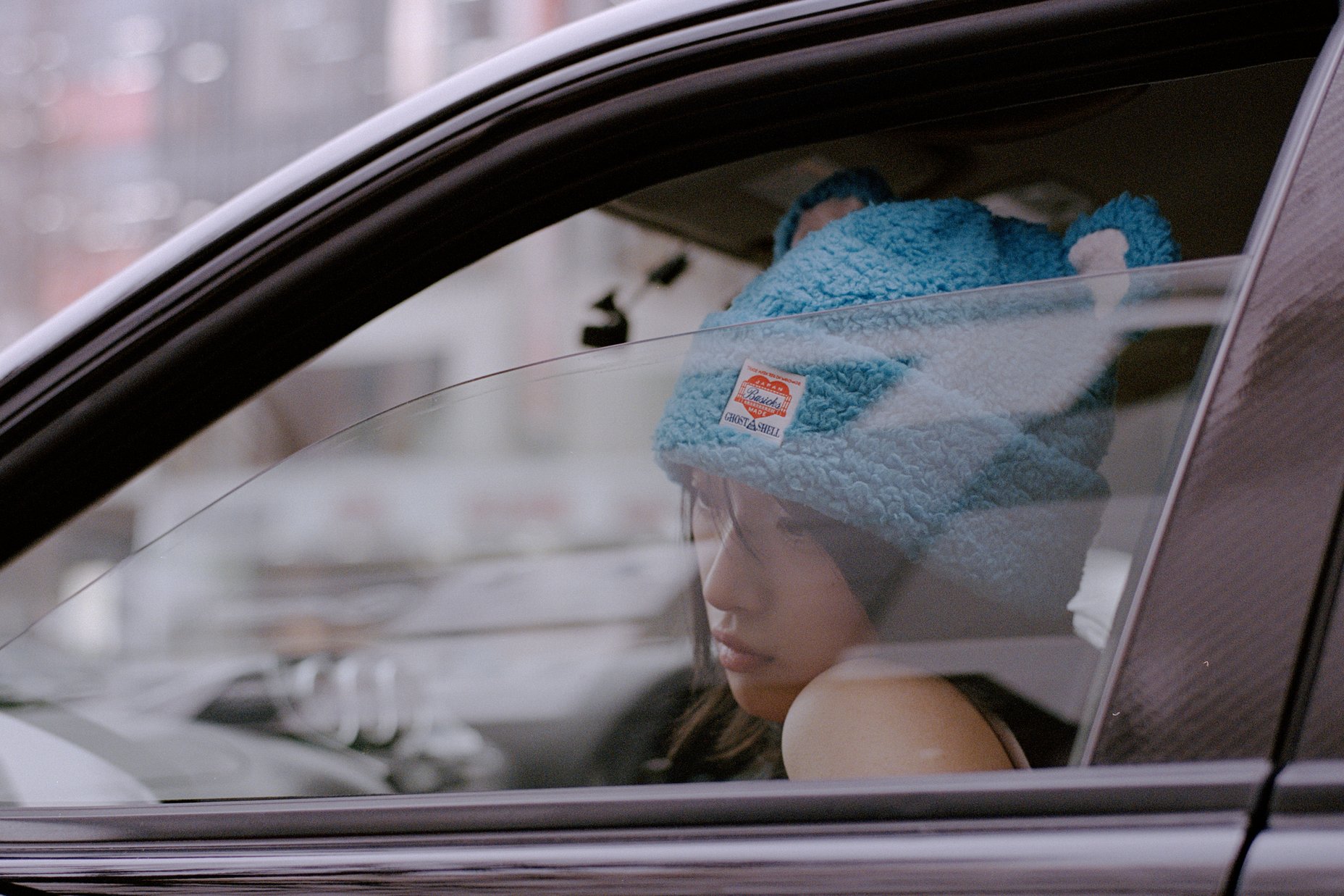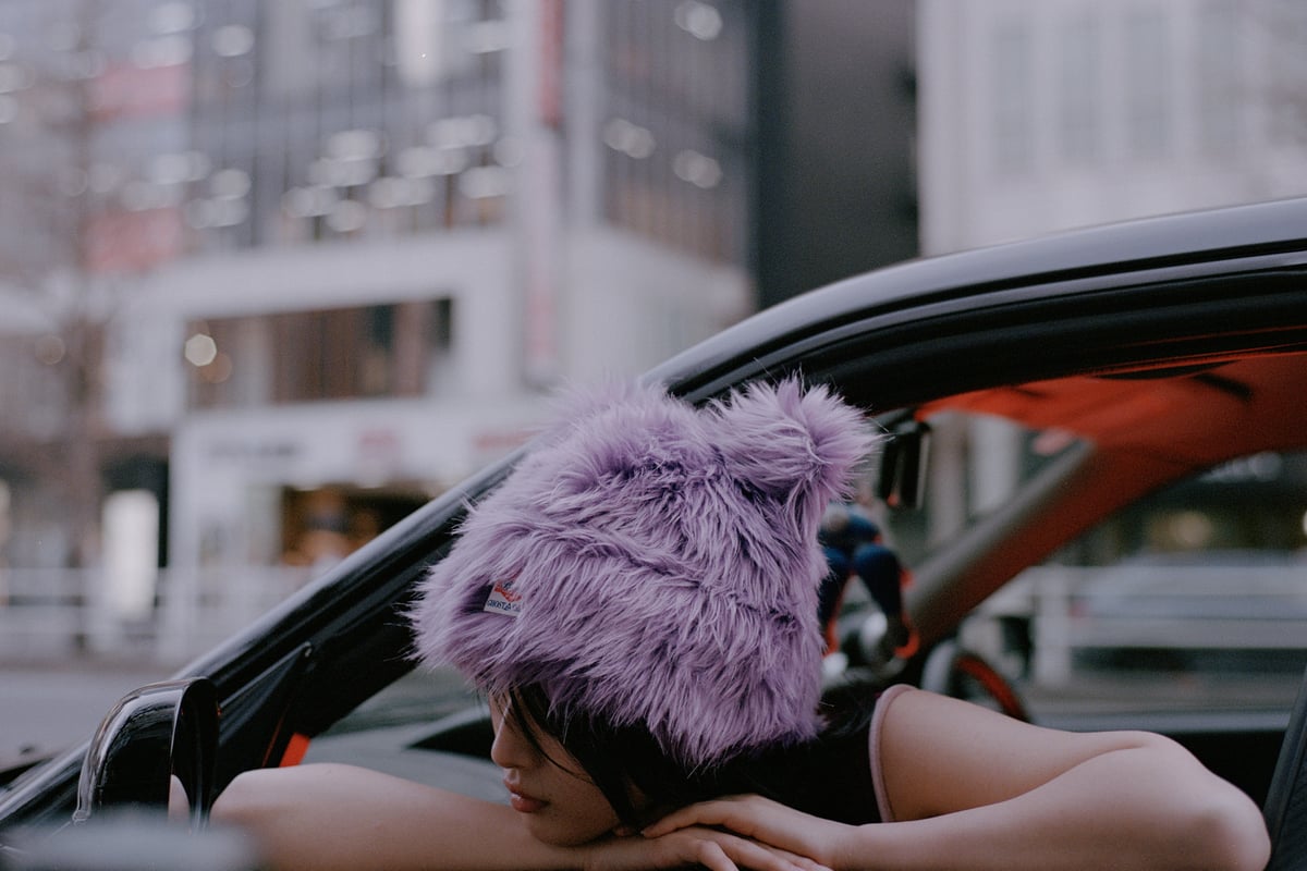 ビーニー (1万4300円)/ベイシックス:草薙素子のへアスタイルをイメージして毛足の長いファー素材でアレンジした、ブランドの定番アイテムのクマ耳ビーニー。ボディスーツ (2万8600円)/ベイシックス:草薙素子が作品内で着用しているボディスーツを再解釈。肌触りの良いベロア素材に刺繍を施している。