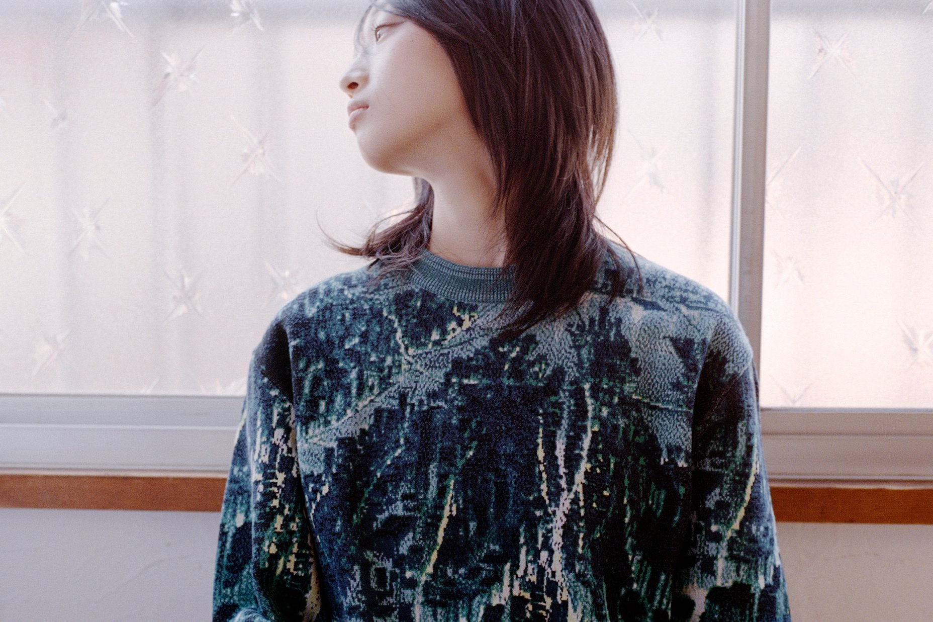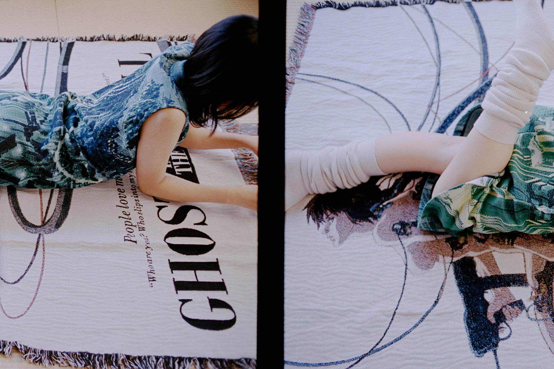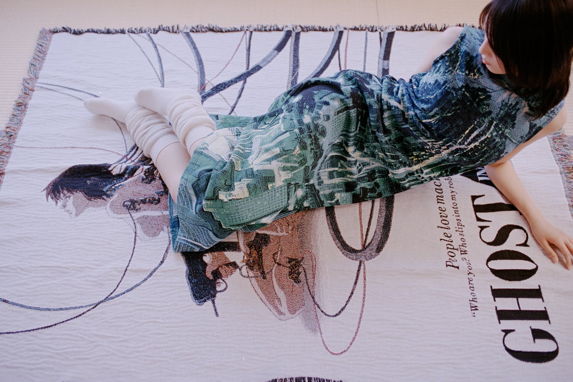 ジャカードセーター(4万1800円)、ジャカードドレス (5万5000円)/ハトラ:「ネットは広大だわ」というセリフが象徴的な押井版のラストシーンで無限に広がるネットワークと摩天楼が重なり合うランドスケープを色分解し、緻密な編み組織で再構成したニット。ブランケット(6万6000円)/ハトラ:キーヴィジュアルを色分解し、コンピューターの起源とも言われるジャカード織機によって、6色の原色糸を織り上げることで再構成した180 x 135cmの特大ジャカードタペストリー。