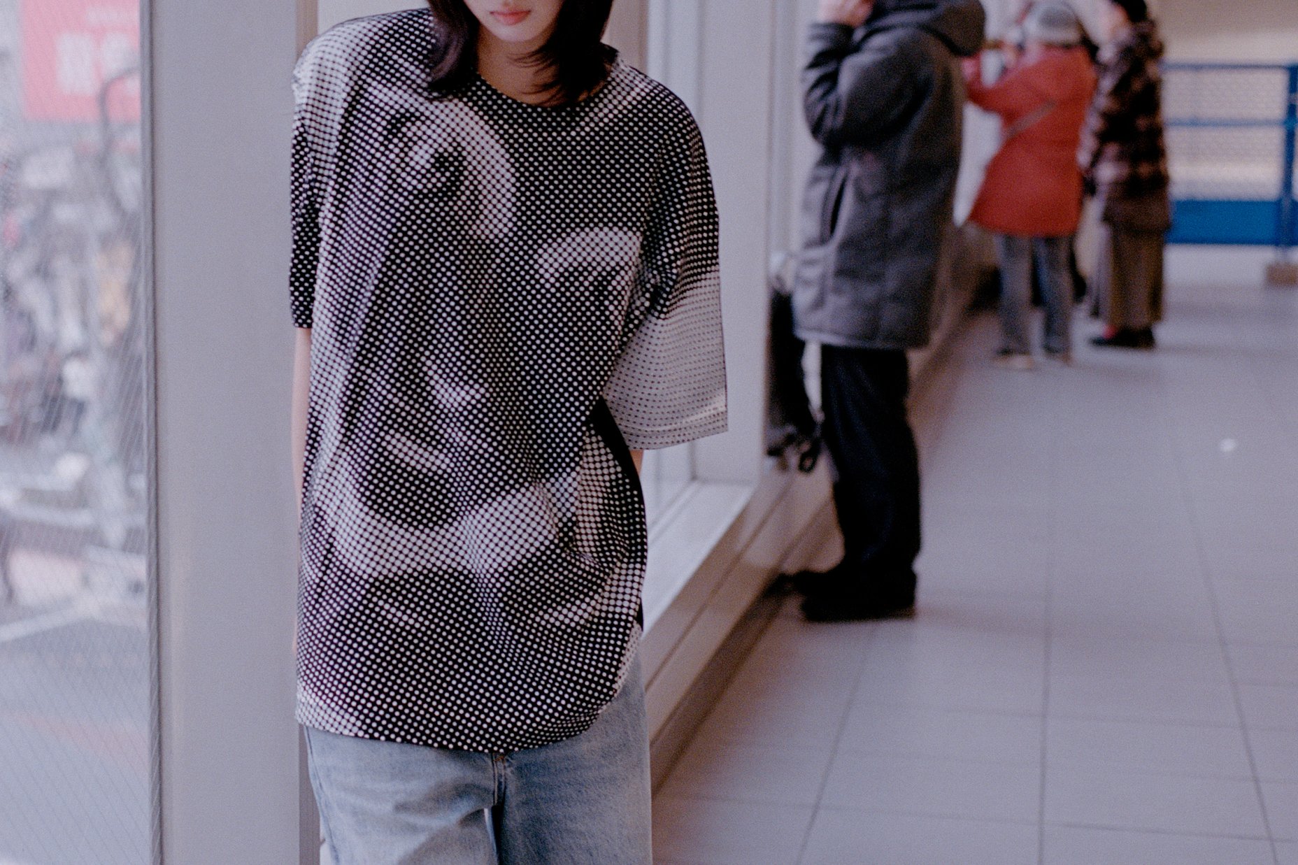 Tシャツ(1万2100円)*2月中旬販売開始予定/ティーエイチ プロダクツ:1990年代のサブカルチャーの雰囲気を感じさせるハーフトーンのドット処理を施したグラフィックを、フロント全⾯にシルクスクリーンでプリント。半ラバーインク特有のマットなタッチが、時を経たアーカイヴTシャツのような印象を生む。