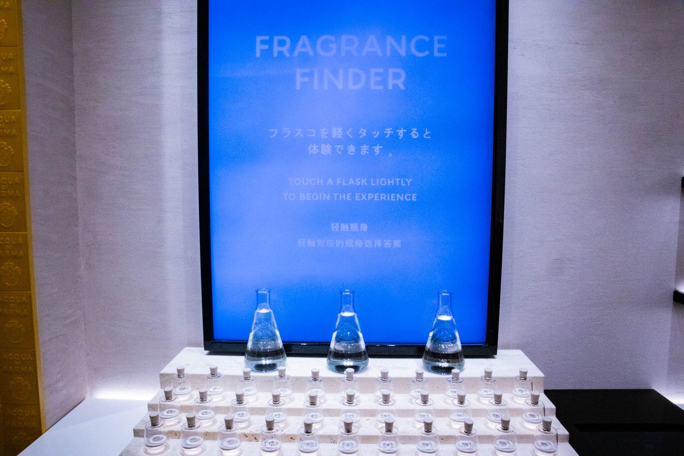 また、日本初のサービスとしてフレグランスファインダーを導入。ディスプレイに表示される香りのキーワードや、香水を付けたいシチュエーションなどの質問に答えると、AIが約30種類の香りの中から最適な数種類をレコメンドしてくれます。