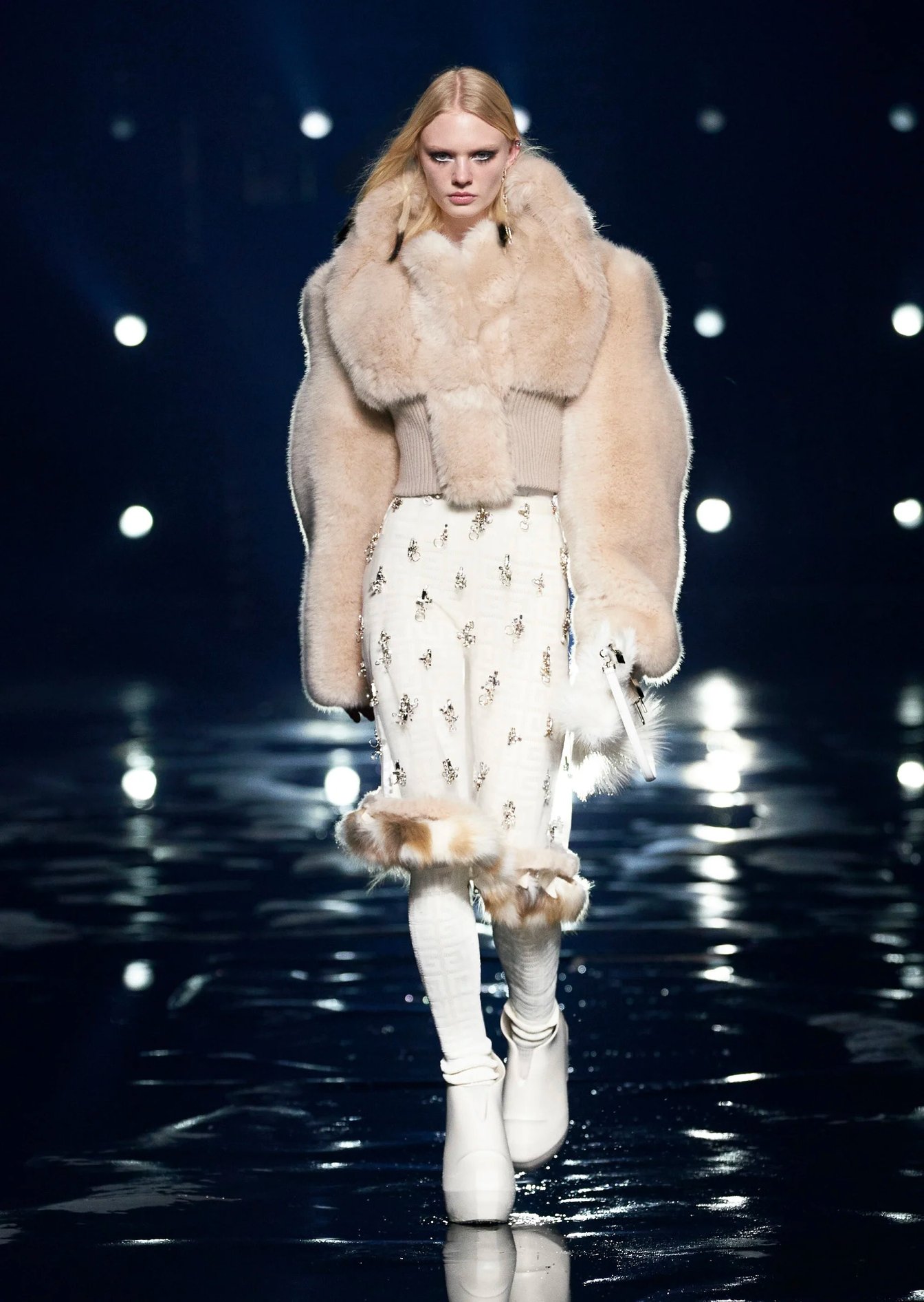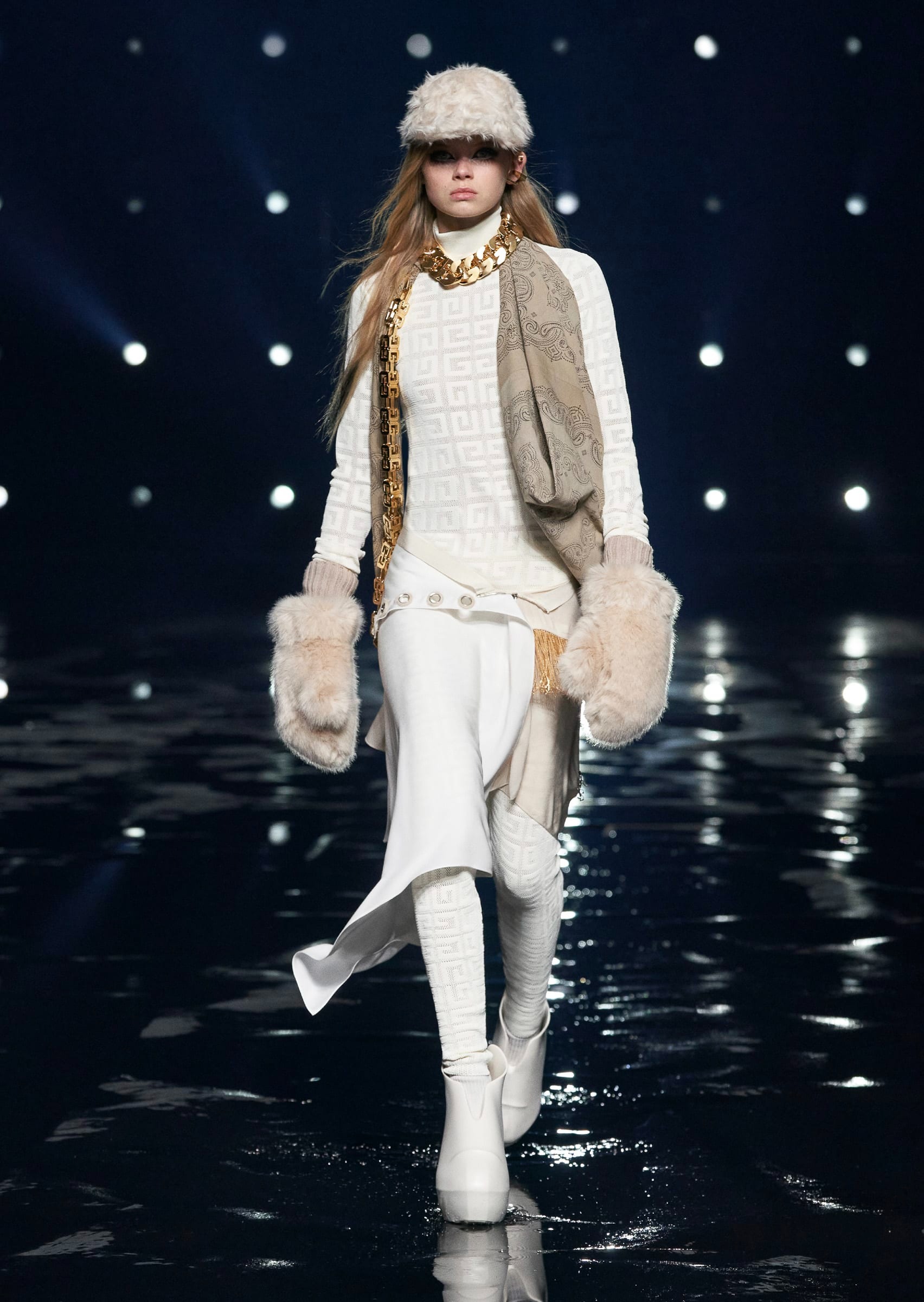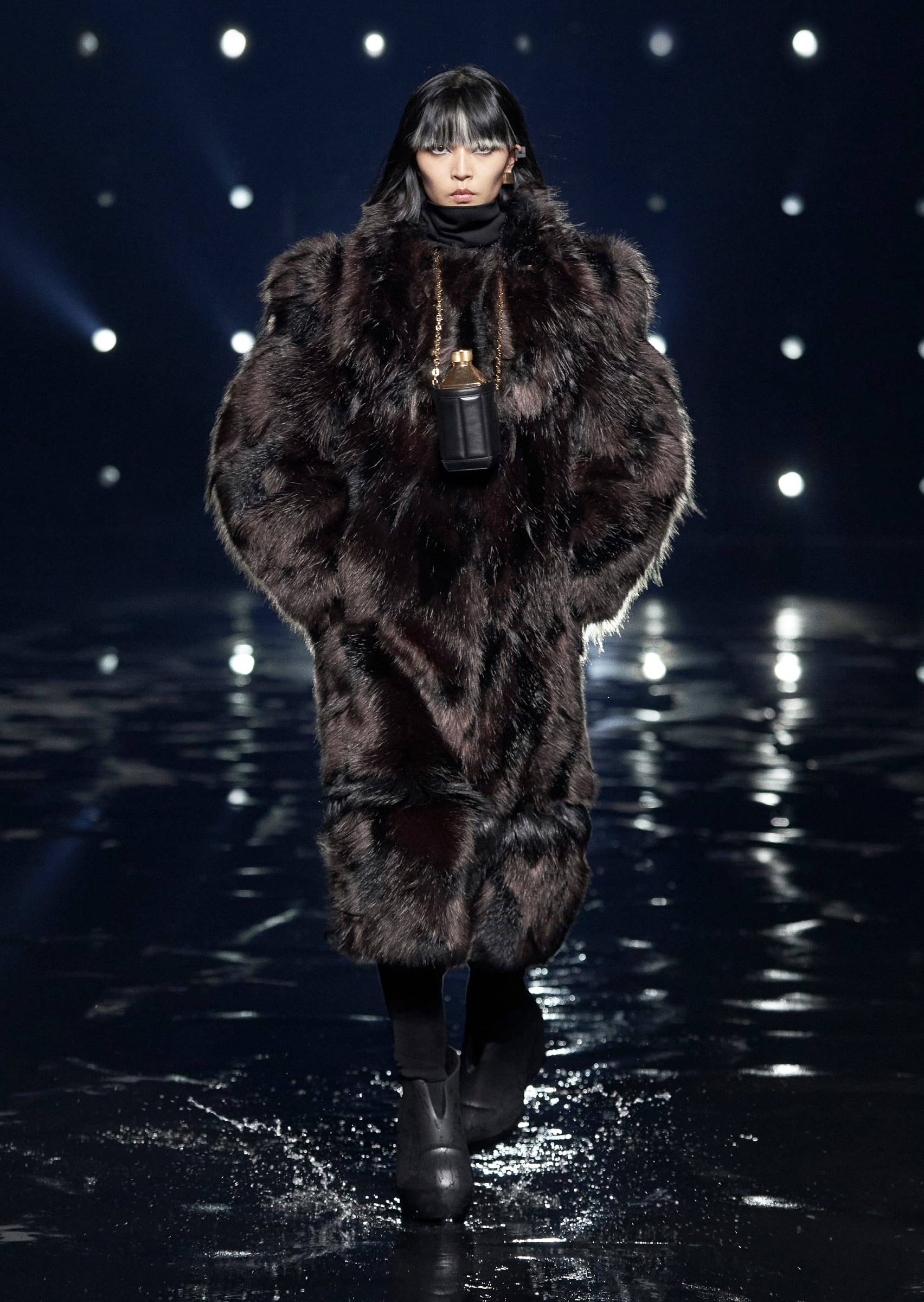 今回のコレクションには、実用性と贅沢さ、そして保護されている感覚、安心感が潜む。フェイクファーまたはリアルなシアリングといった肌触りの良い素材、4Gロゴ模様のボディスーツ、そしてレイヤーを重ねたコクーンシルエットが、着る人を優しく包み込む。ビジューやフェザーなど華美な装飾は、パンデミック後の世界への希望を感じさせる。