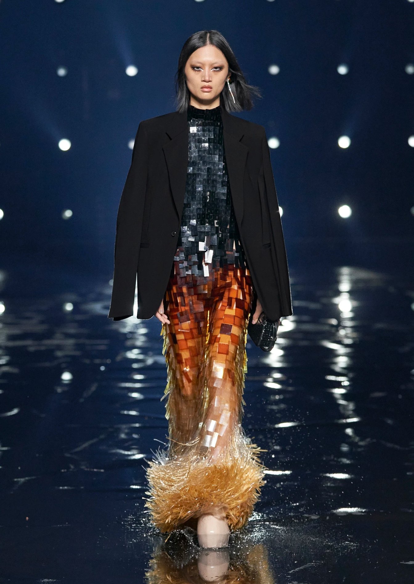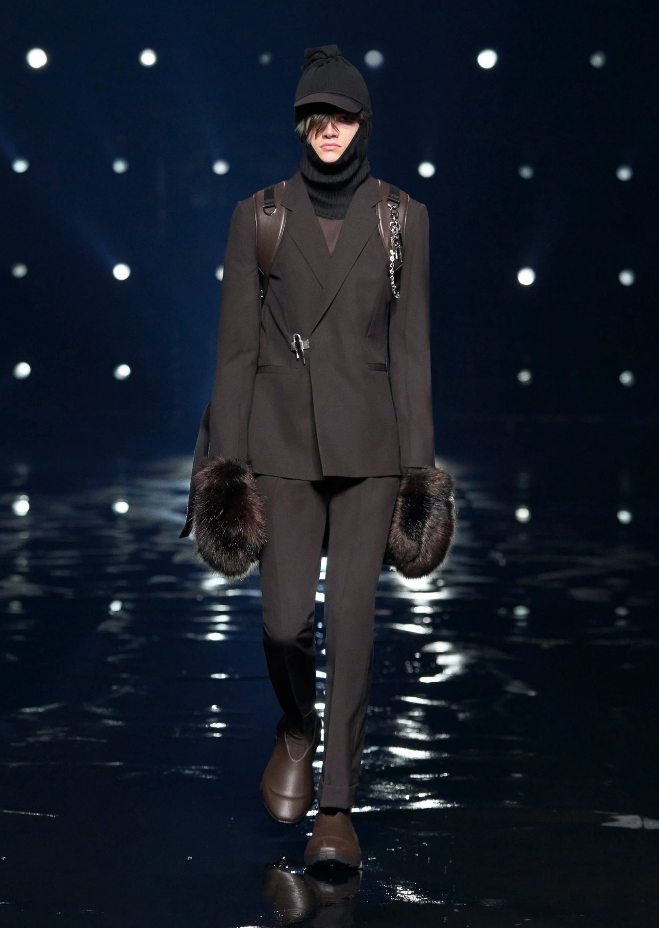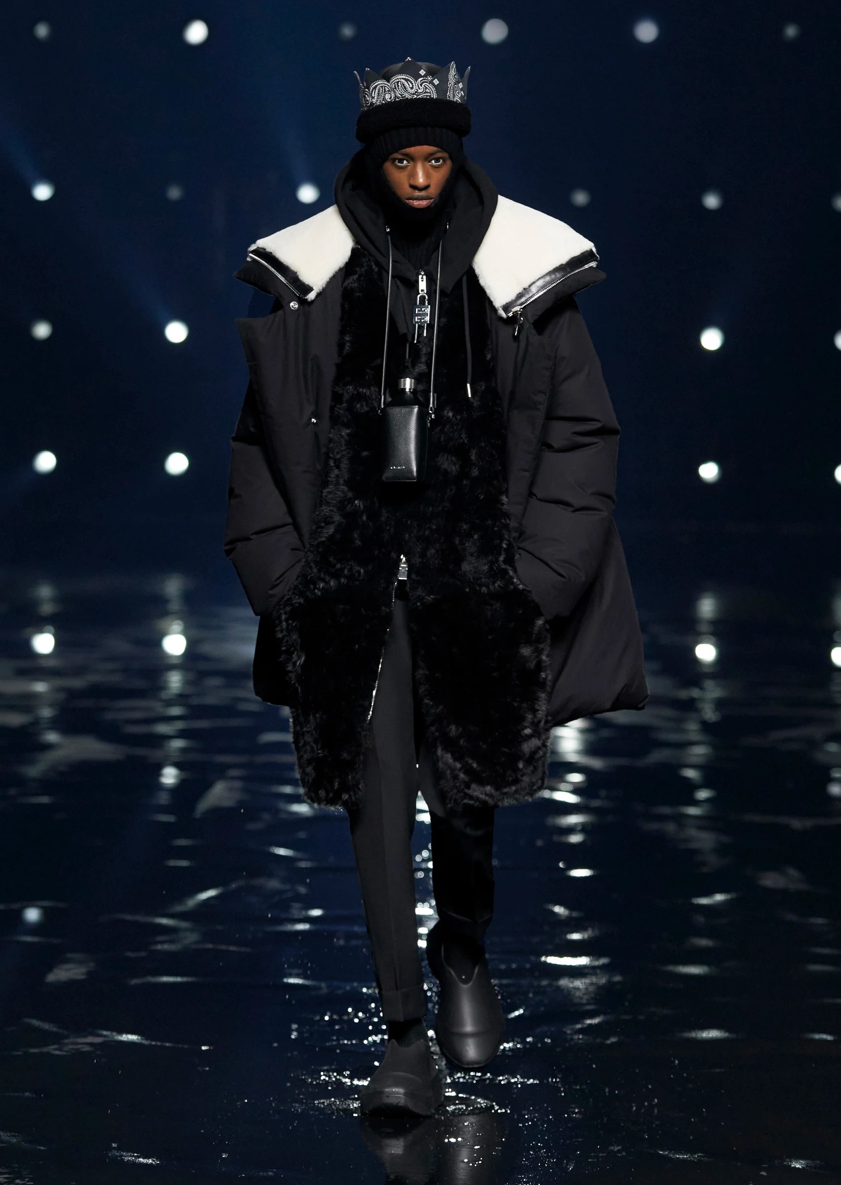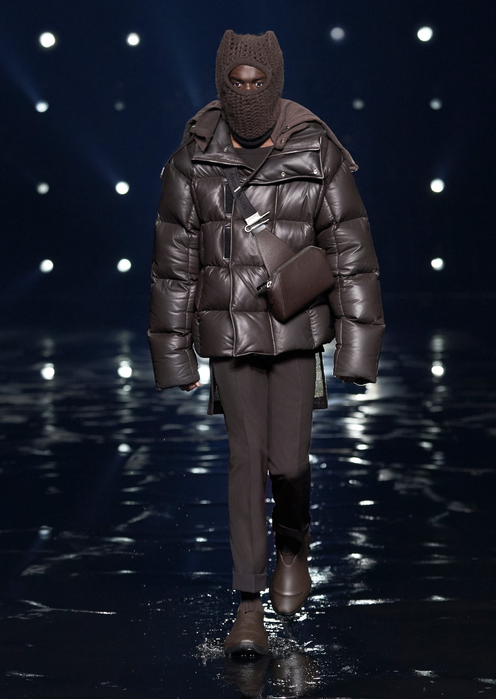 今回のコレクションには、実用性と贅沢さ、そして保護されている感覚、安心感が潜む。フェイクファーまたはリアルなシアリングといった肌触りの良い素材、4Gロゴ模様のボディスーツ、そしてレイヤーを重ねたコクーンシルエットが、着る人を優しく包み込む。ビジューやフェザーなど華美な装飾は、パンデミック後の世界への希望を感じさせる。