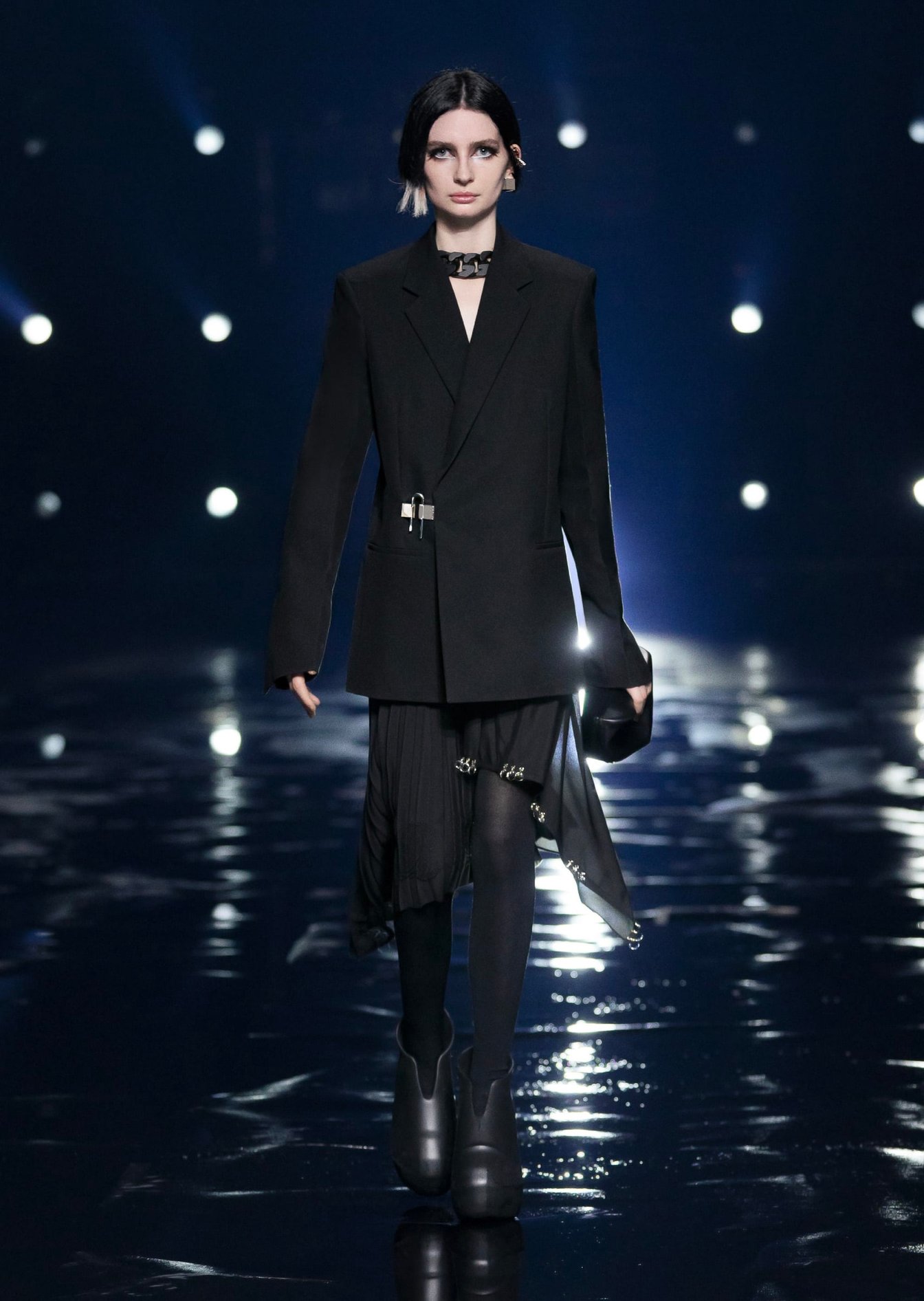 新生ジバンシィを象徴するメタルの「ハードウェア」は服からアクセサリーまで随所に。テーラードジャケットは、南京錠がボタンの代わりとなった。