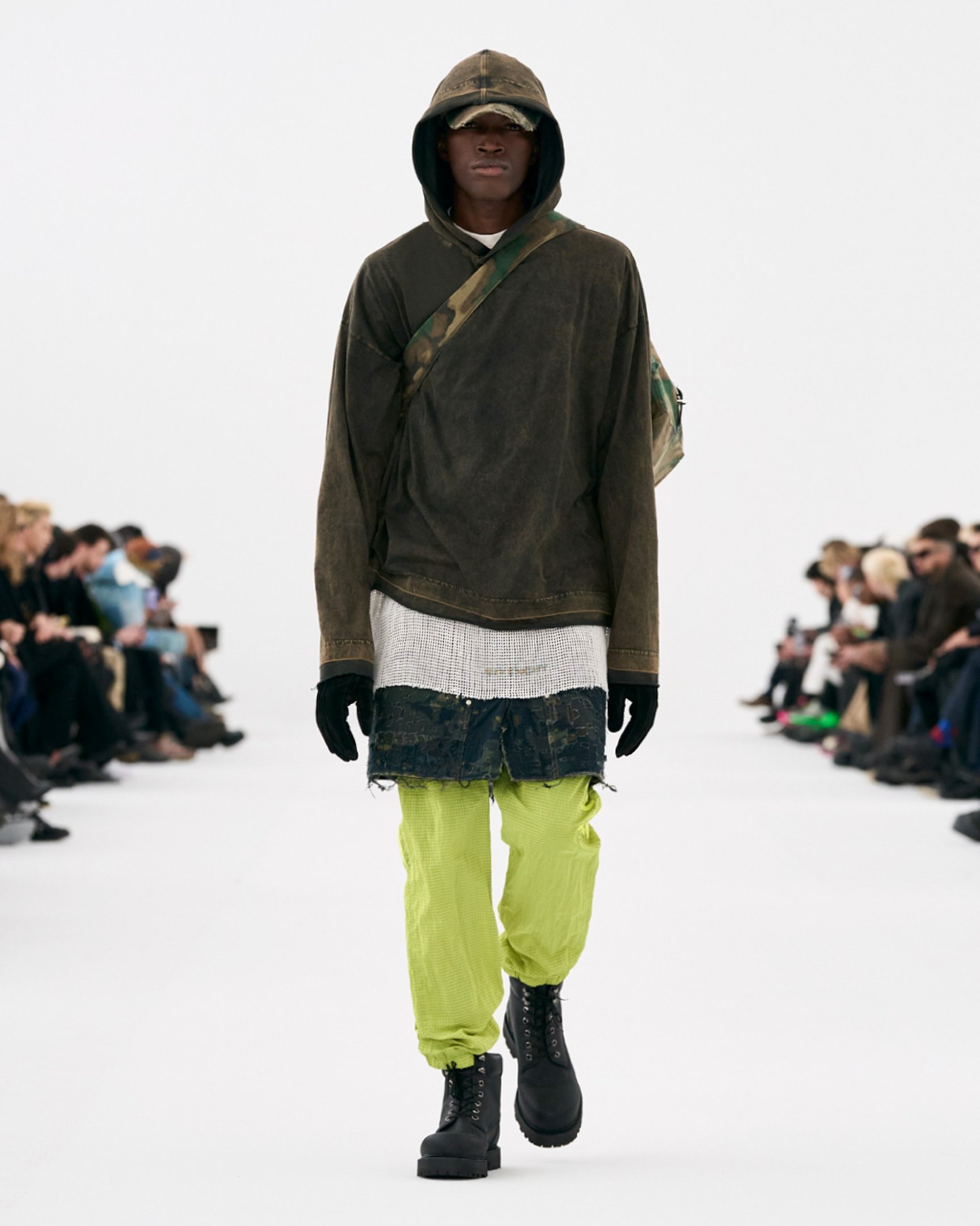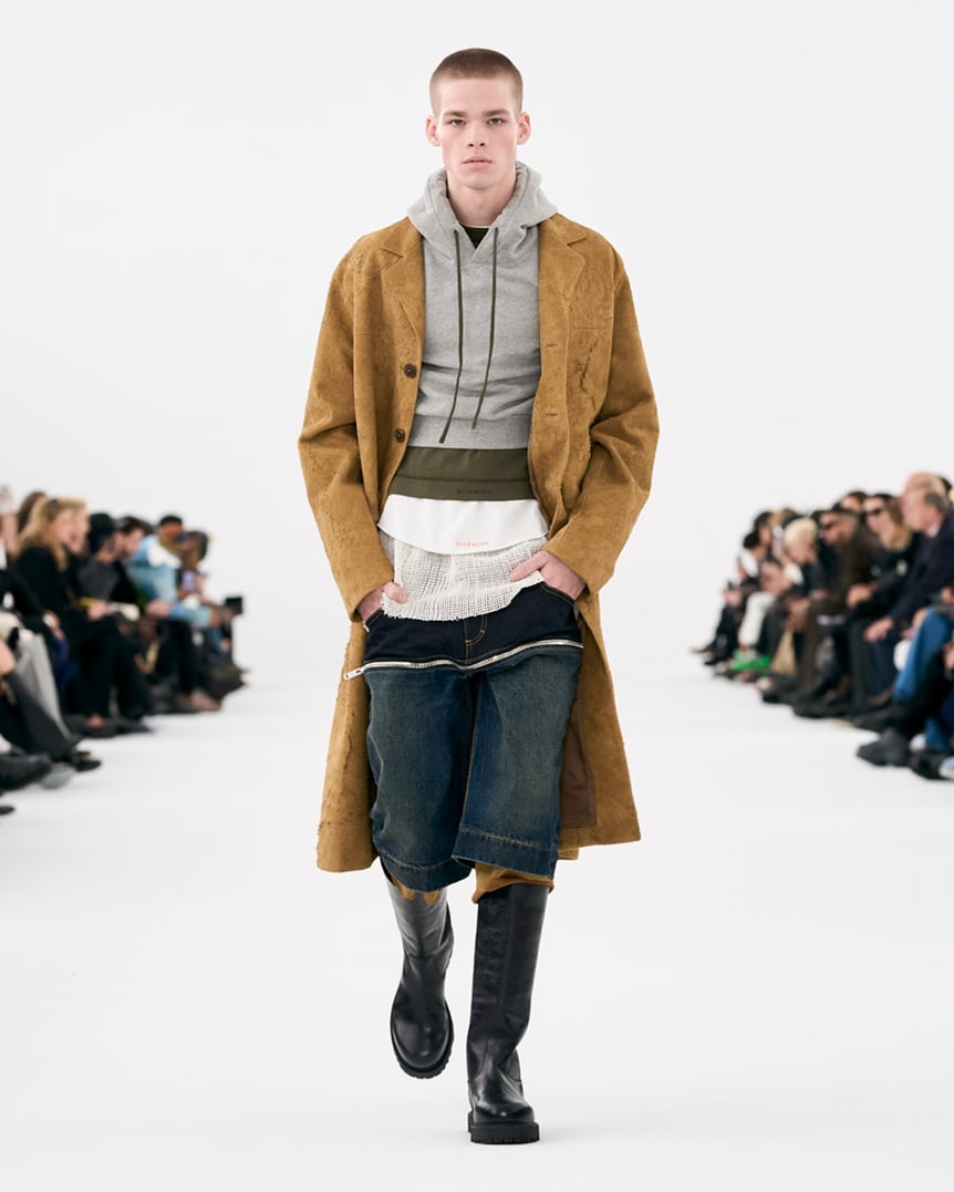 そこからは一転して、アーティスティック ディレクター マシュー・M・ウィリアムズ(Matthew M Williams)らしいストリートのひねりを加えたルックが続く。オーバーサイズの肩幅の広いジャケットに、クロップド丈のフーディと複数のレイヤーを重ね、膝下パンツにロングブーツをスタイリング。パンツはファスナーを多用し、取り外してショートパンツとしても使える汎用性のあるデザインに。