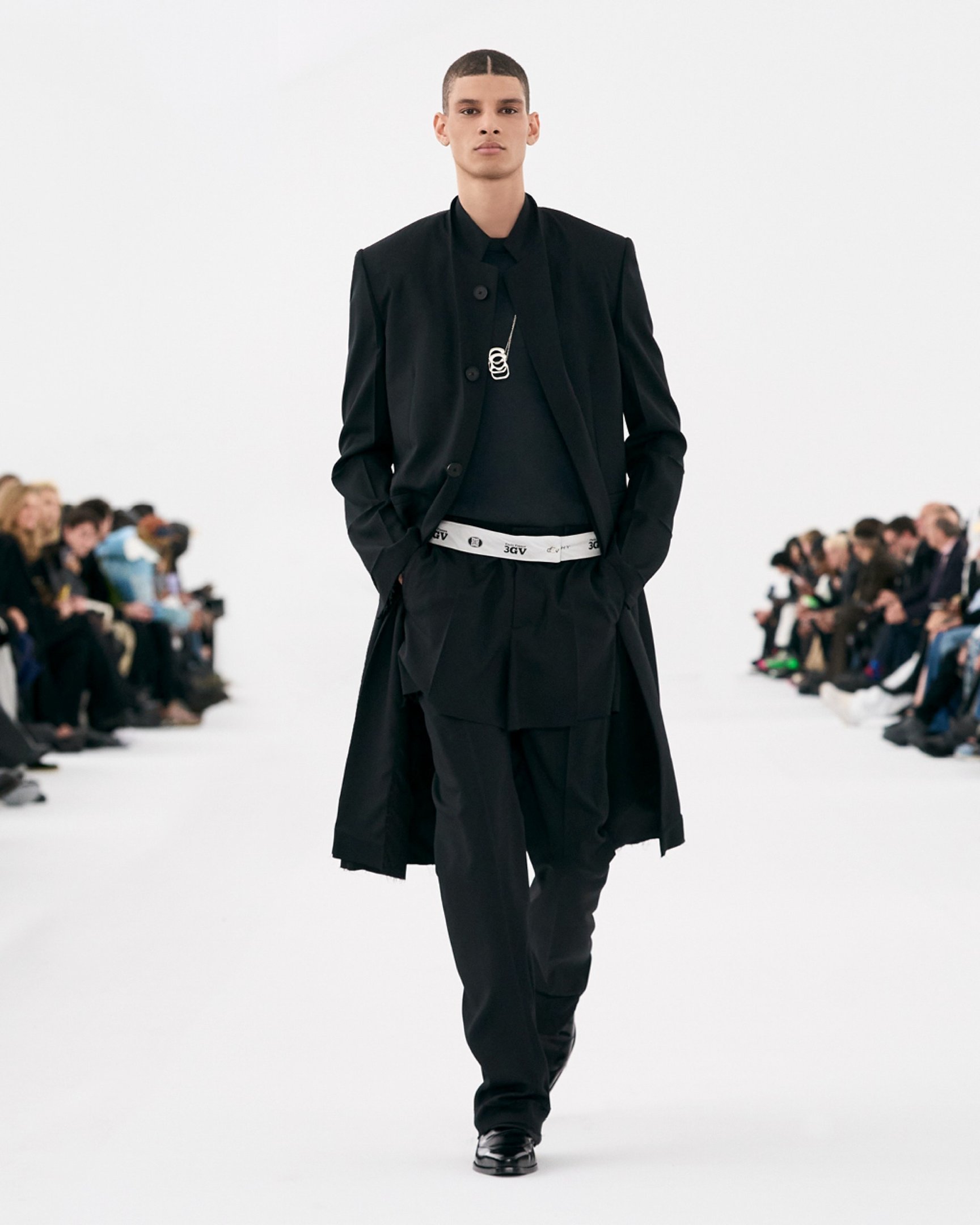印象的なのは冒頭の4ルック。オートクチュールのアトリエで仕立てられたという上質でスタイリッシュな4着のテイラードジャケットは、ハイネックのインナー、グローブ、シューズまで黒一色で、登場するモデルの髪型もコーンロウで統一された。デジャブのように反復されるストイックでクリーンなルックは、これ以降に続く挑戦的なスタイリングの序章として、どこか厳かな雰囲気をまとっている。