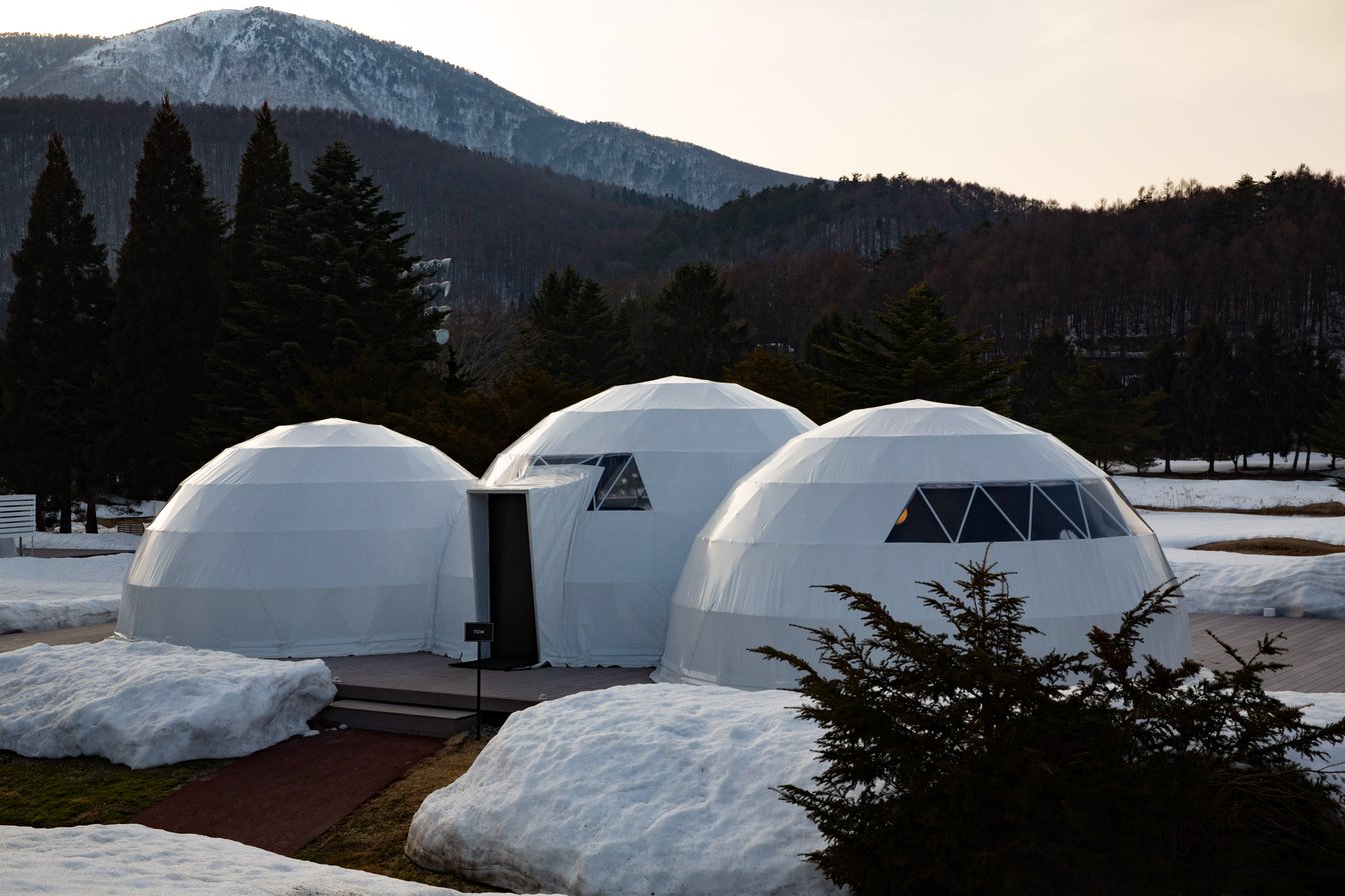 グランルークがある場所は、標高1917メートルある飯縄山の麓の飯綱高原。ゴルフ場の跡地という広大な敷地には、真っ白なドーム型テント14棟が設営されています。シングルドームや、コブが連なったツイン/トリプルドームタイプがあり、ファミリーやカップル、友達といった人数構成や予算で宿泊するお部屋のタイプをセレクトできます。