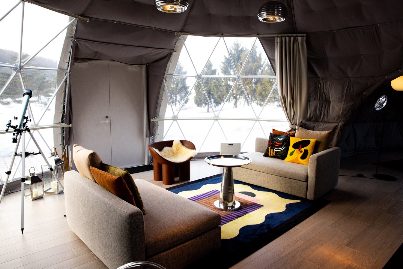 標高が高く、降雪地帯でもあるので3月末の取材時もまだ雪が残っている状態。寒さが気になるところですが、冷暖房完備なので部屋の隅々まで暖かく快適に過ごせます。テント内はモダンなインテリアが設置され、海外のリゾートのようなスタイリッシュな空間に仕上げられています。部屋によってコンセプトも異なり、どれも自然との調和が考えられた温もりを感じさせる内装です。部屋の名前でもある「パトリシア」と「トム」と聞いて、ピンとくる人はかなりのデザイン通。それぞれ、世界的に有名な家具デザイナー パトリシア・ウルキオラとトム・ディクソンの名を冠しているそう。(!)