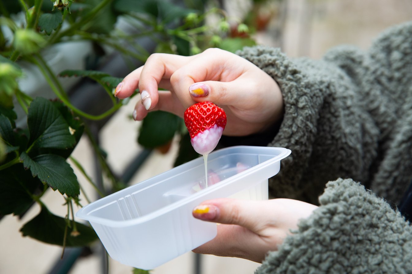 ぐっすり寝た翌朝は朝ご飯を食べてチェックアウトです。前の晩にバーでたくさんお酒を飲んでも追加チャージされないので、チェックアウトは部屋の鍵を返却して完了、という気楽さ。旅もエンディングと思いきや、ここでアクティビティに出発です。アクティビティは季節によってさまざま。冬なら近場のスキー場でのスノースポーツや(ウェアや用具などのレンタルも無料)や目の前の霊仙寺湖でワカサギ釣り、暖かくなってきたらゴルフやテニス、バギーなどからアクティビティを選ぶことができます。今の季節はちょうどいちご狩りが体験できました。(車で40分ほど、一部送迎可。5月末まで)