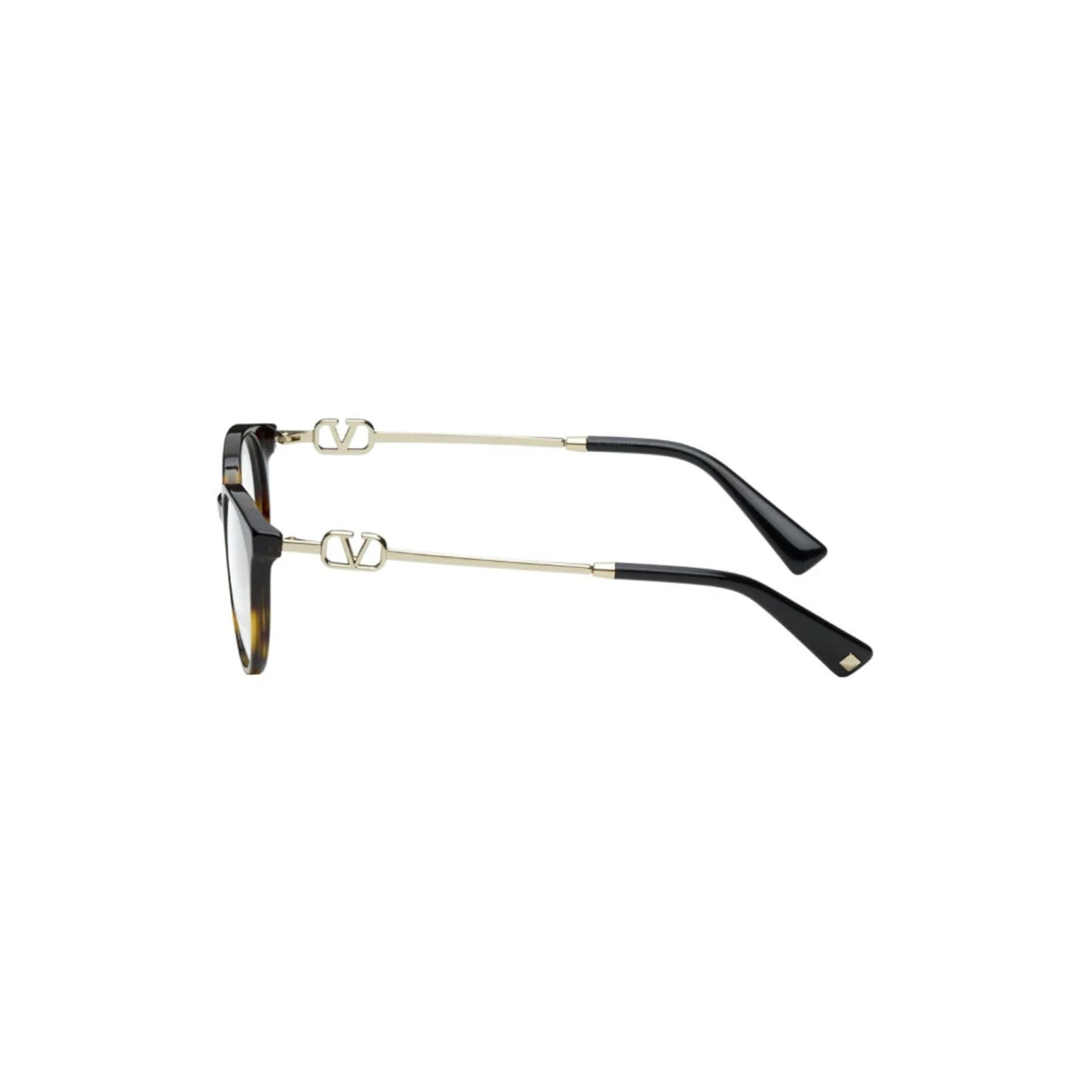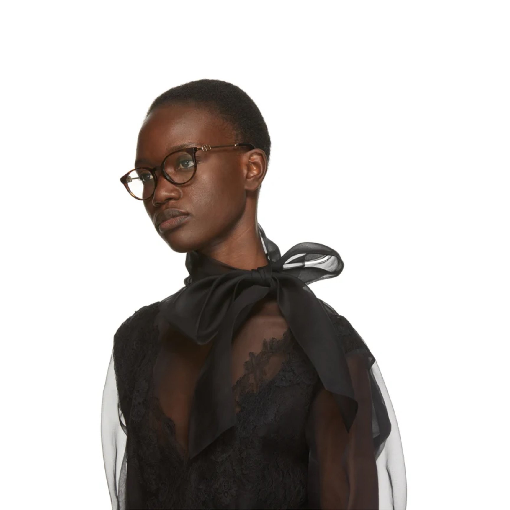 レトロなラウンドシェイプのメガネは「ヴァレンティノ(VALENTINO)」のもの。サイドにはVロゴをメタルで施し、テンプルエンドにはスクエアスタッズをオン。ブランドシグネチャーを散りばめたデザインです。