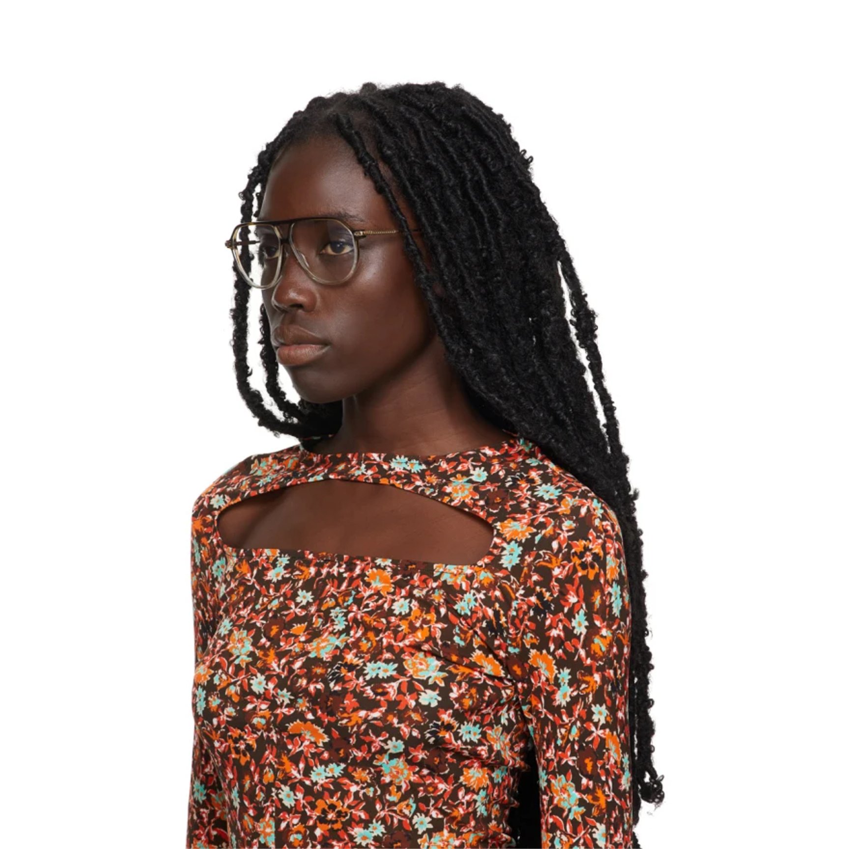 グラデーションが美しい「ヴィクトリア・ベッカム(Victoria Beckham)」のメガネは、アメリカ空軍で採用されていたサングラスと同類のアビエイターシェイプ。シンプルスタイルのスパイスに取り入れてみては?