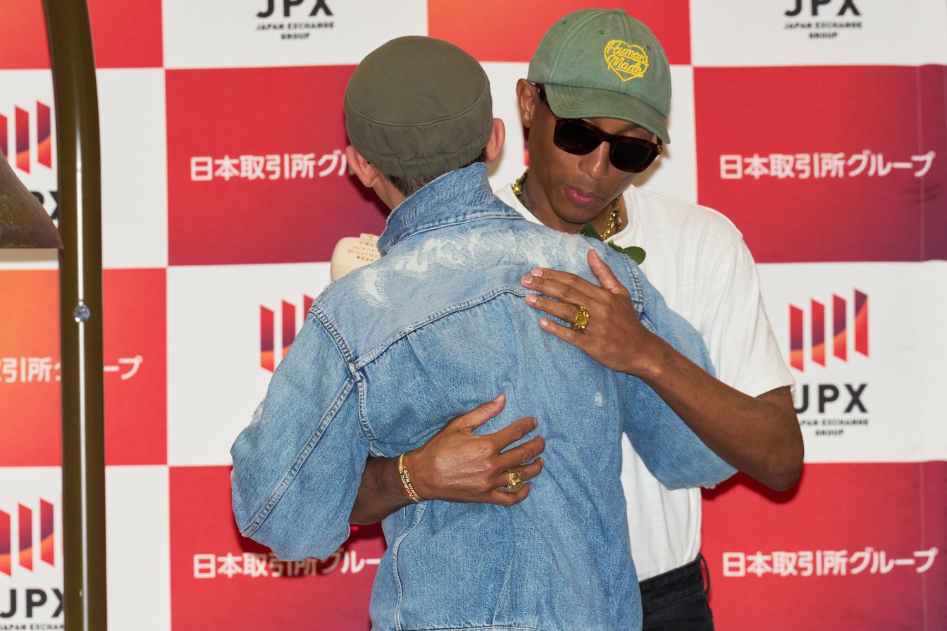 東京証券取引所にて新規上場を記念した打鐘の後、抱き合うNIGO®︎とファレル・ウィリアムス