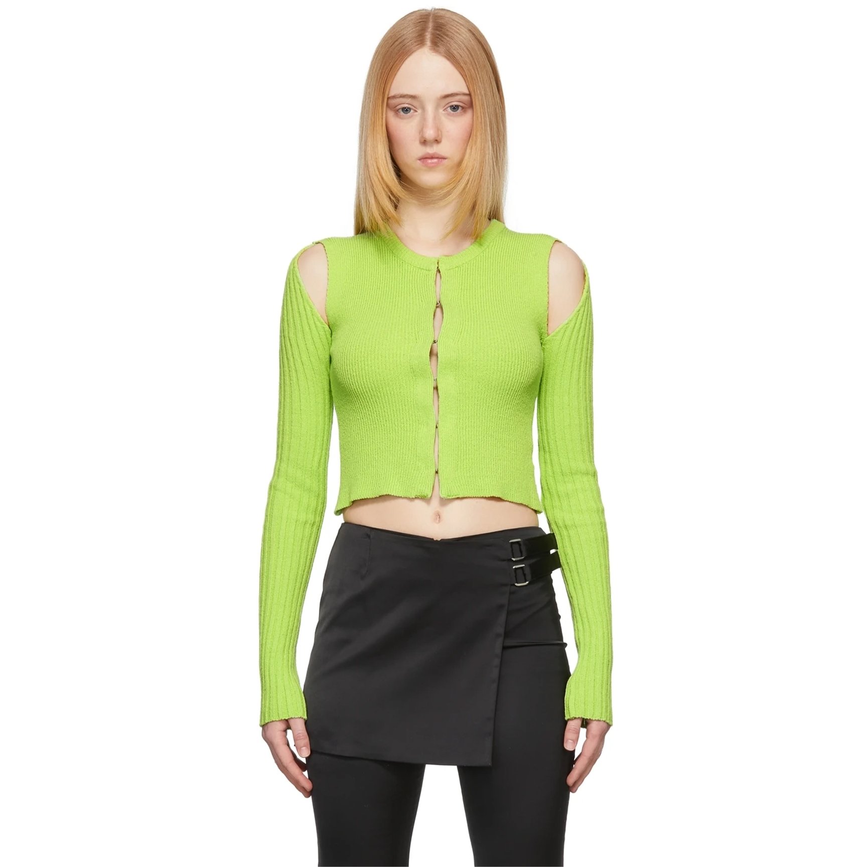 大胆なカットアウトが特徴的な長袖カーディガンは、韓国発のブランド「ザオープン プロダクト(THEOPEN PRODUCT)」のもの。控えめな印象ながら独自のセンスが光るアイテムを提供するブランドらしさが詰まった一着。蛍光に近いグリーンカラーで、ストリートにもクールにも着こなせるアイテムです。