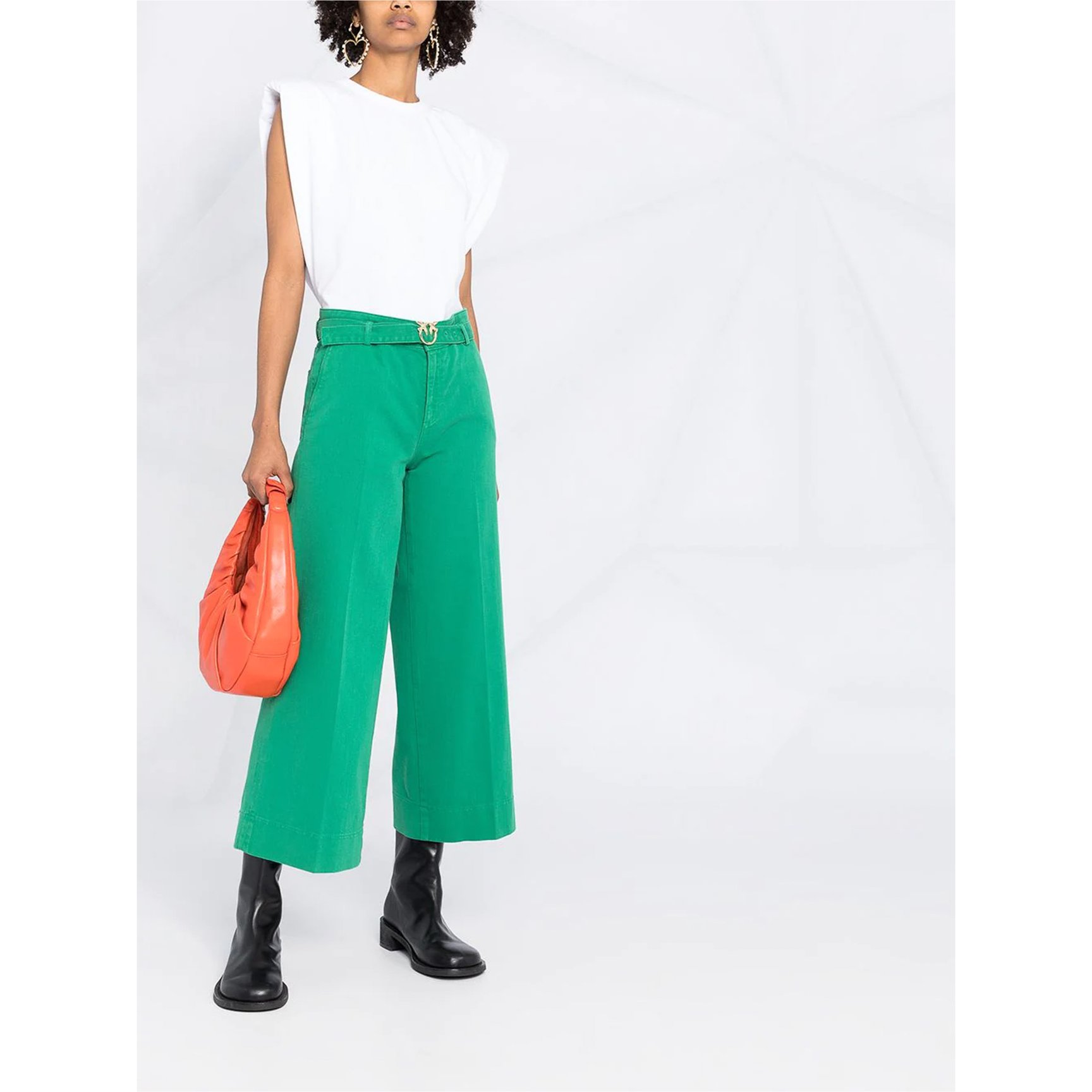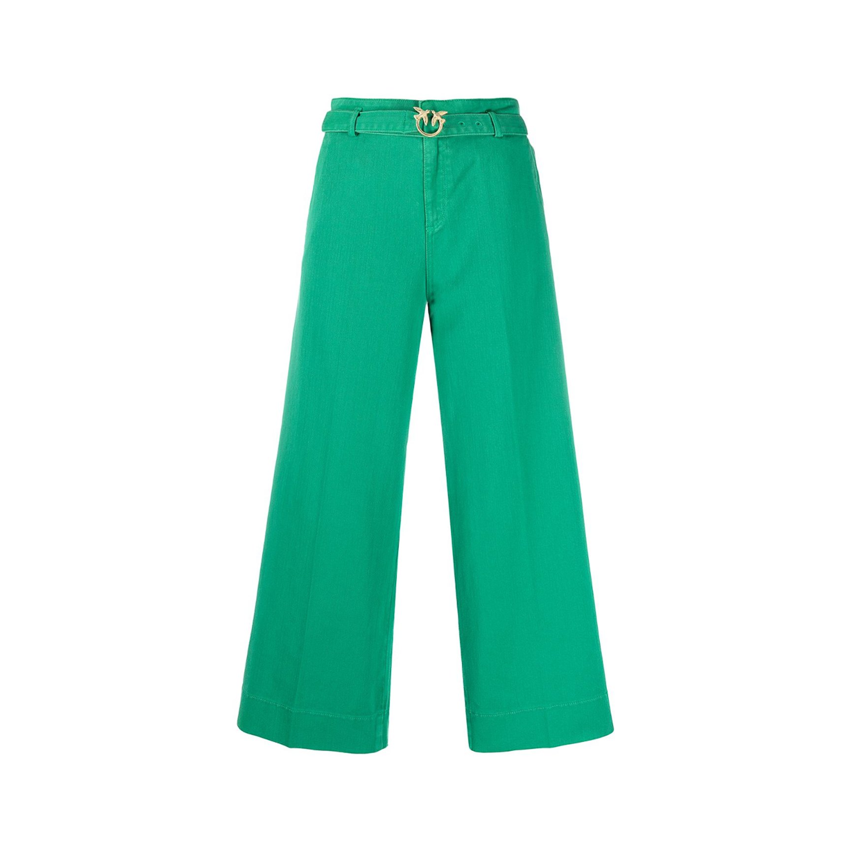エネルギッシュでグラマラスなデザインで知られるイタリアのブランド「ピンコ(PINKO)」から登場する、グリーンカラーのボトムス。フレアデザインながらも、クロップドレッグですっきりとした印象に見える点が特徴。明るいグリーンカラーが春夏にぴったりで、ゴールドトーンのバックルクロージャーがワンポイントです。