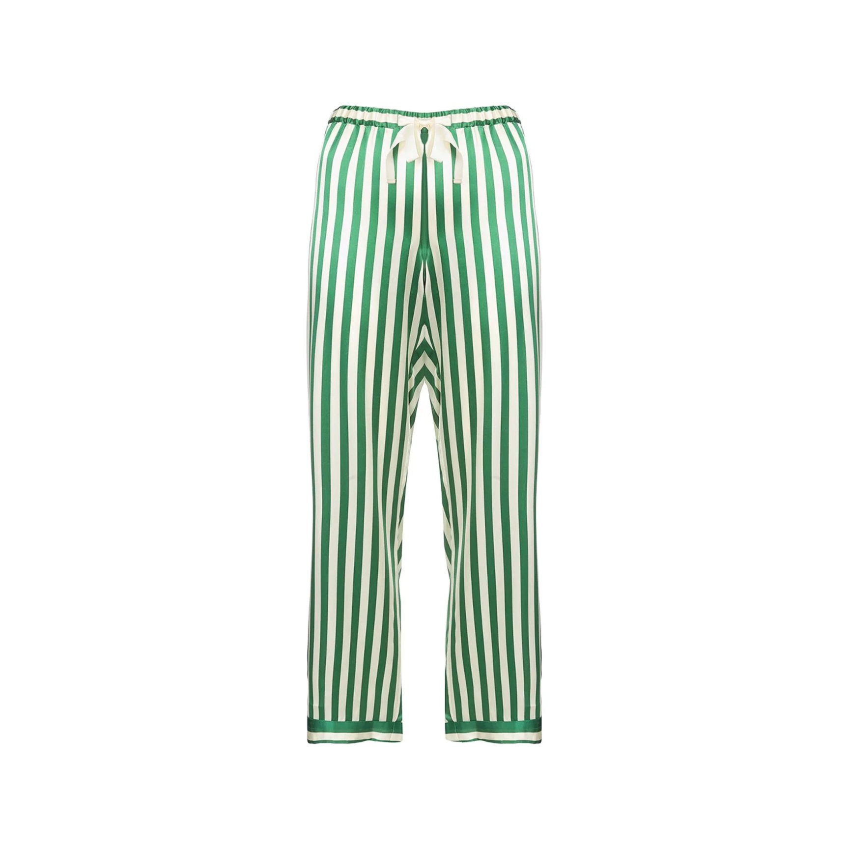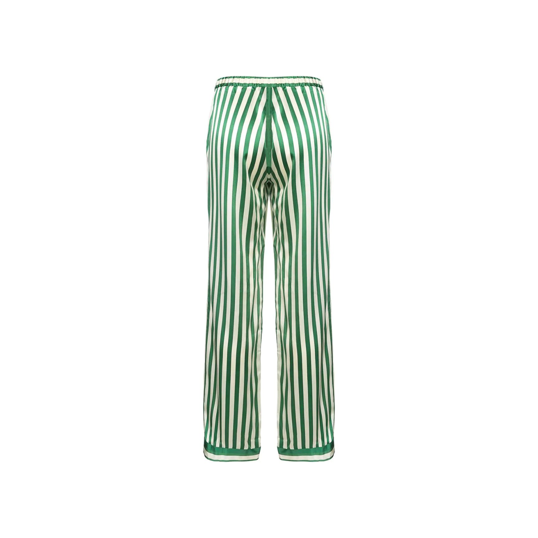 「モーガン・レーン(Morgan Lane)」のグリーン×ホワイトのストライプパンツ。シルク100%なので、肌触り抜群。さらにハイウエストで、スタイルアップ効果も兼ねています。シンプルなトップスと合わせるだけで、存在感あるコーデが完成します。