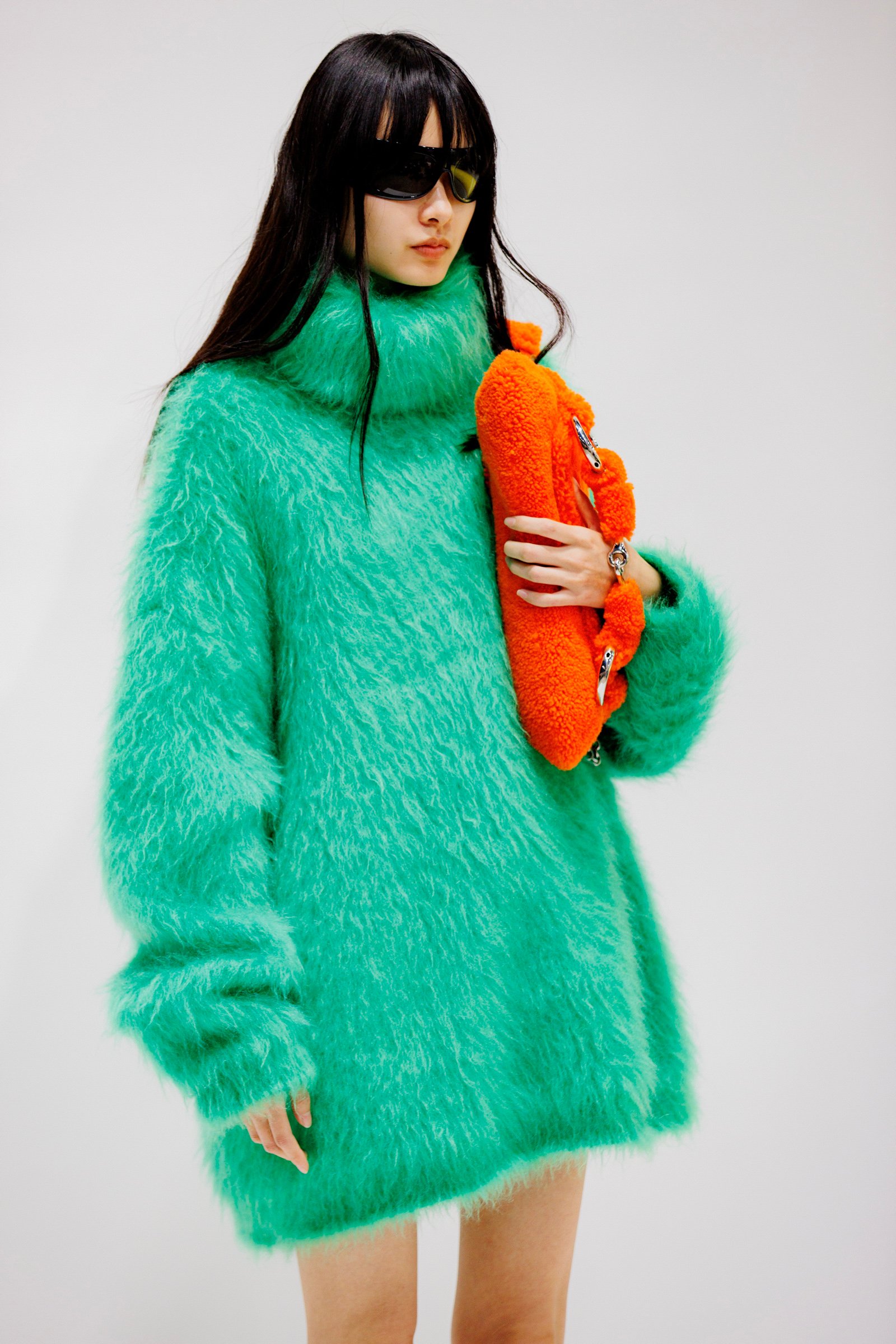 ショーはクリスタルがあしらわれたGGメタルのマイクロブラルックからスタート。エコファーを使用したカラフルでボリューミーなアウターや、ボーイフレンドライクなオーバーサイズのシャツ、コート、ジーンズの組み合わせ、スカートは膝丈、ショート丈といずれもタイトなトップスや胸元が開いたシャツと合わせてグラマラスな印象に。グリーンのモヘアセーターはオーバサイズでニットドレスとして登場したほか、縁がビーズで刺繍された丸やドロップ模様はスカートやコート、パニエドレスやショートドレスにあしらわれた。ランジェリーやシアーな透け素材、ビーズメッシュ、レースはセンシュアルで、ビロードやモヘヤ、エコファーなどの素材と対極の軽やかさと煌びやかさで、コレクションに華やかさをプラスした。