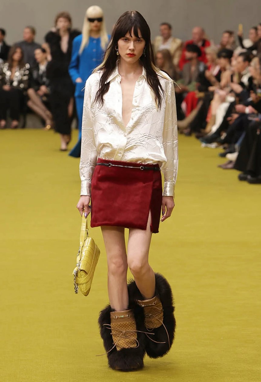 2000年代のブリトニー・スピアーズ(Britney Spears)の楽曲のイントロを彷彿とさせるBGMが繰り返し流れ、ショーがスタートした。モデルは四方に設置されたエレベーターから登場。これもまた、「これまで」と「これから」の時空を行き来するタイムマシーンのような役割を担い、ランダムにモデルが出たり入ったりを繰り返す。コレクションのベースには1990年代(トム・フォード期)、2010年代(アレッサンドロ・ミケーレ期)から今日に至るまでの、時代を重ねて構築されてきたグッチのヘリテージが散りばめられた構成に。