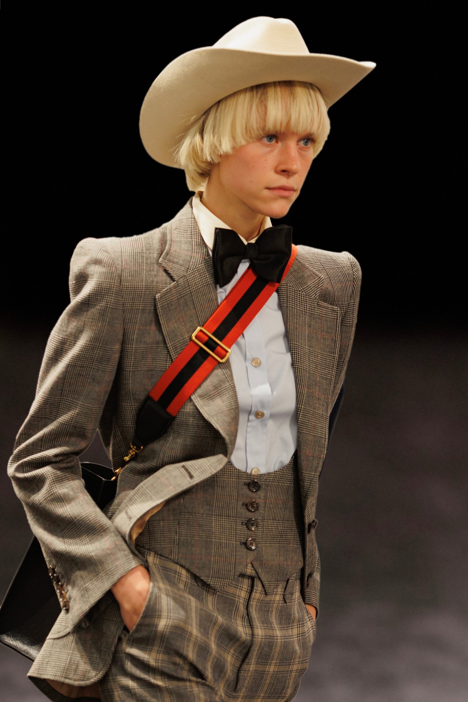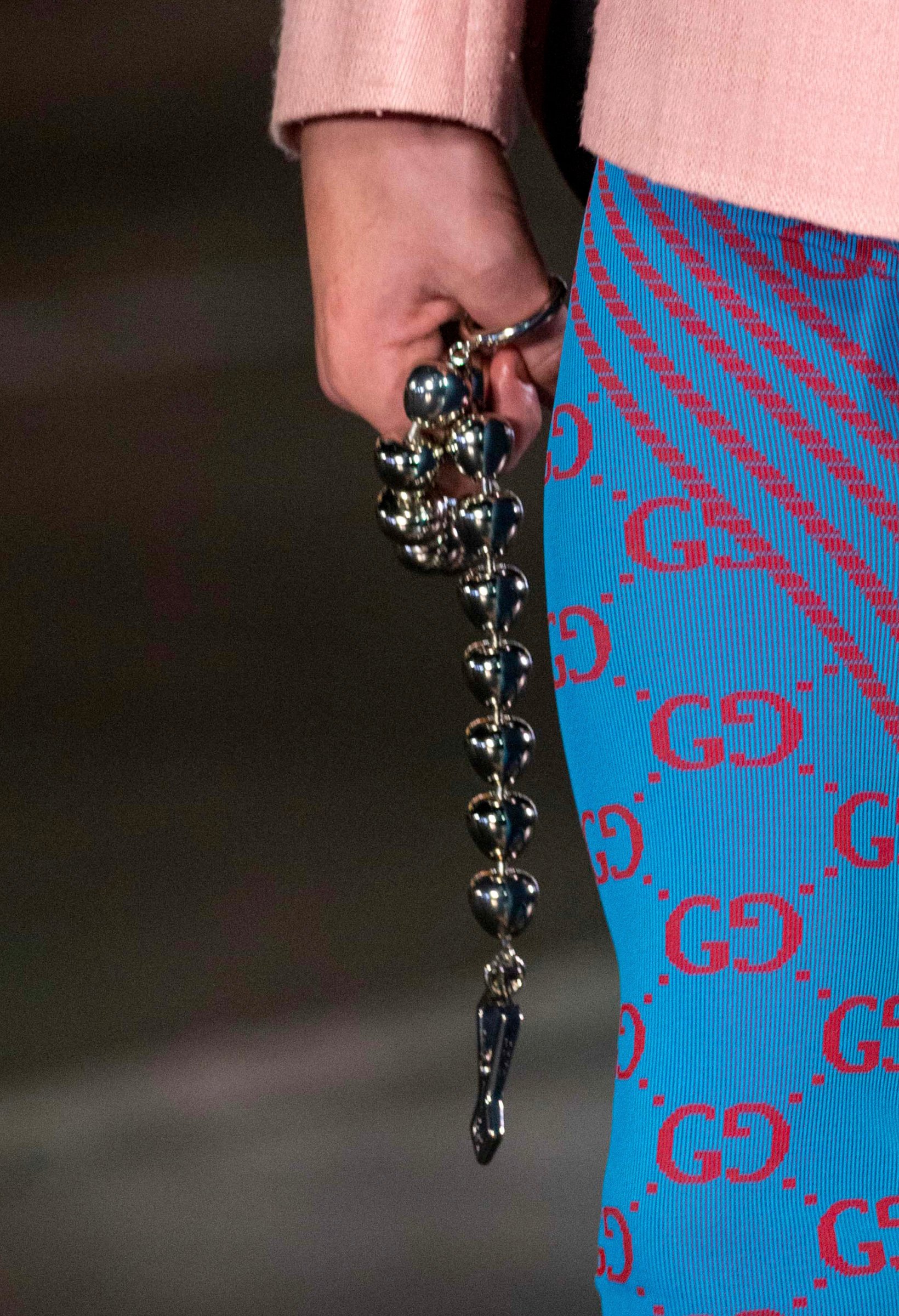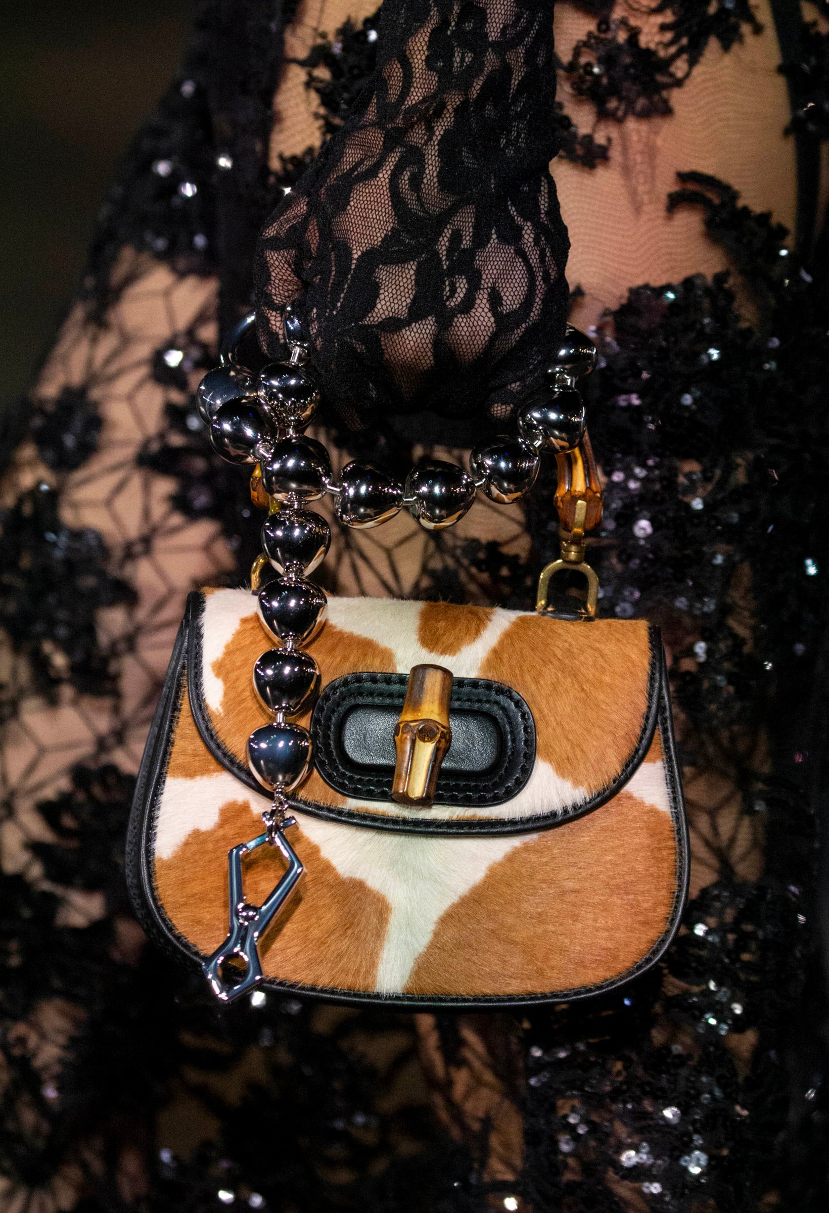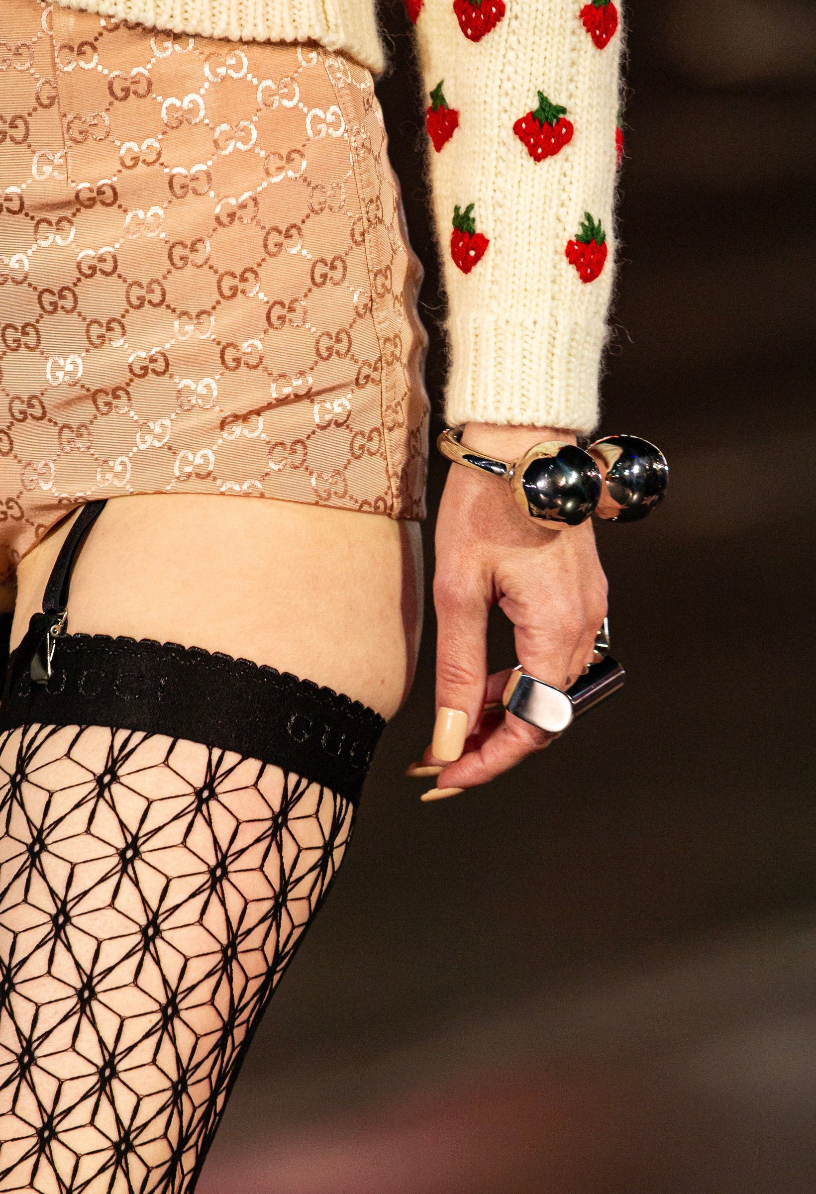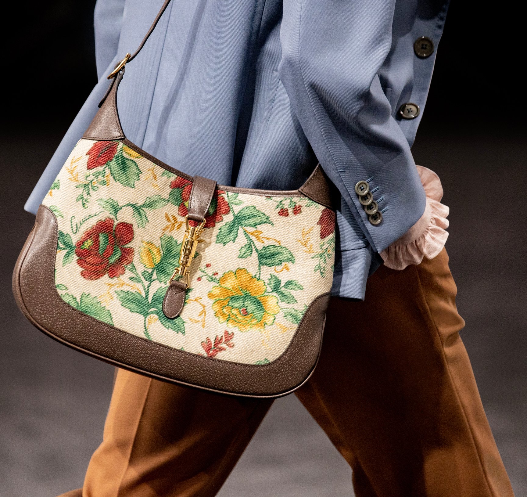過去にも多くのアイコンを生み出してきたグッチ。歴史とルーツに目が向けられた今回は、1971年に作られたメッセンジャーバッグ、プラットフォームサンダルなど、フェミニンな懐かしさを感じさせるバッグやシューズが現代版にアレンジされた。