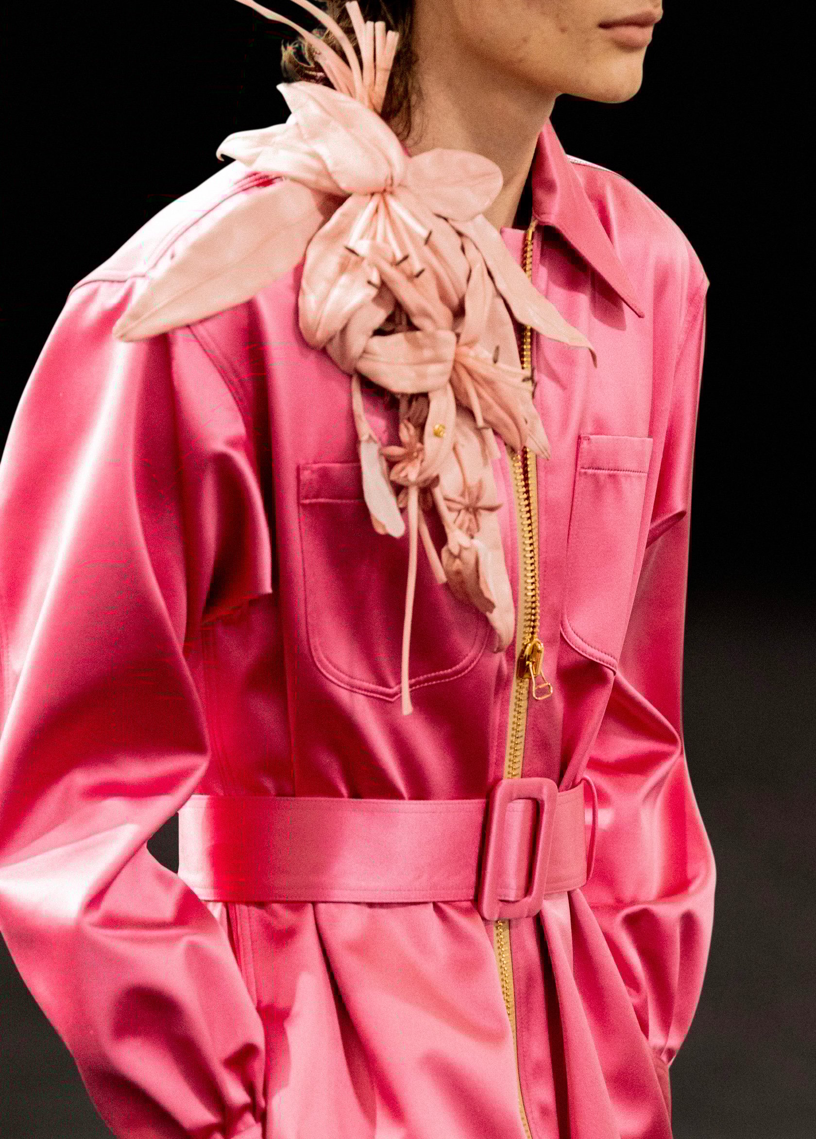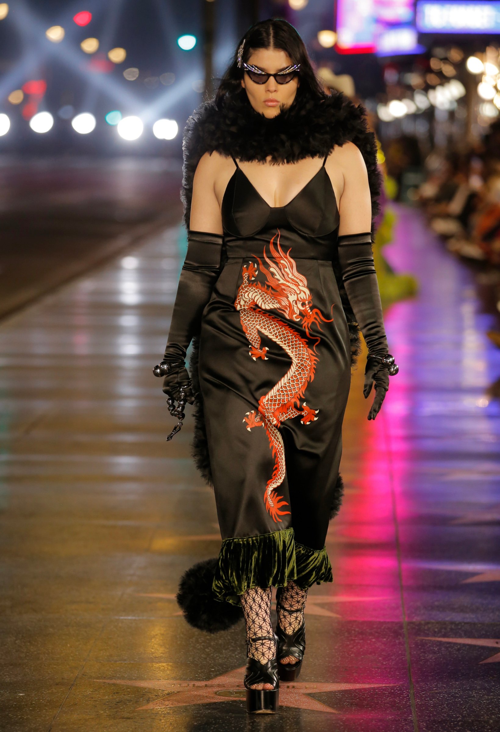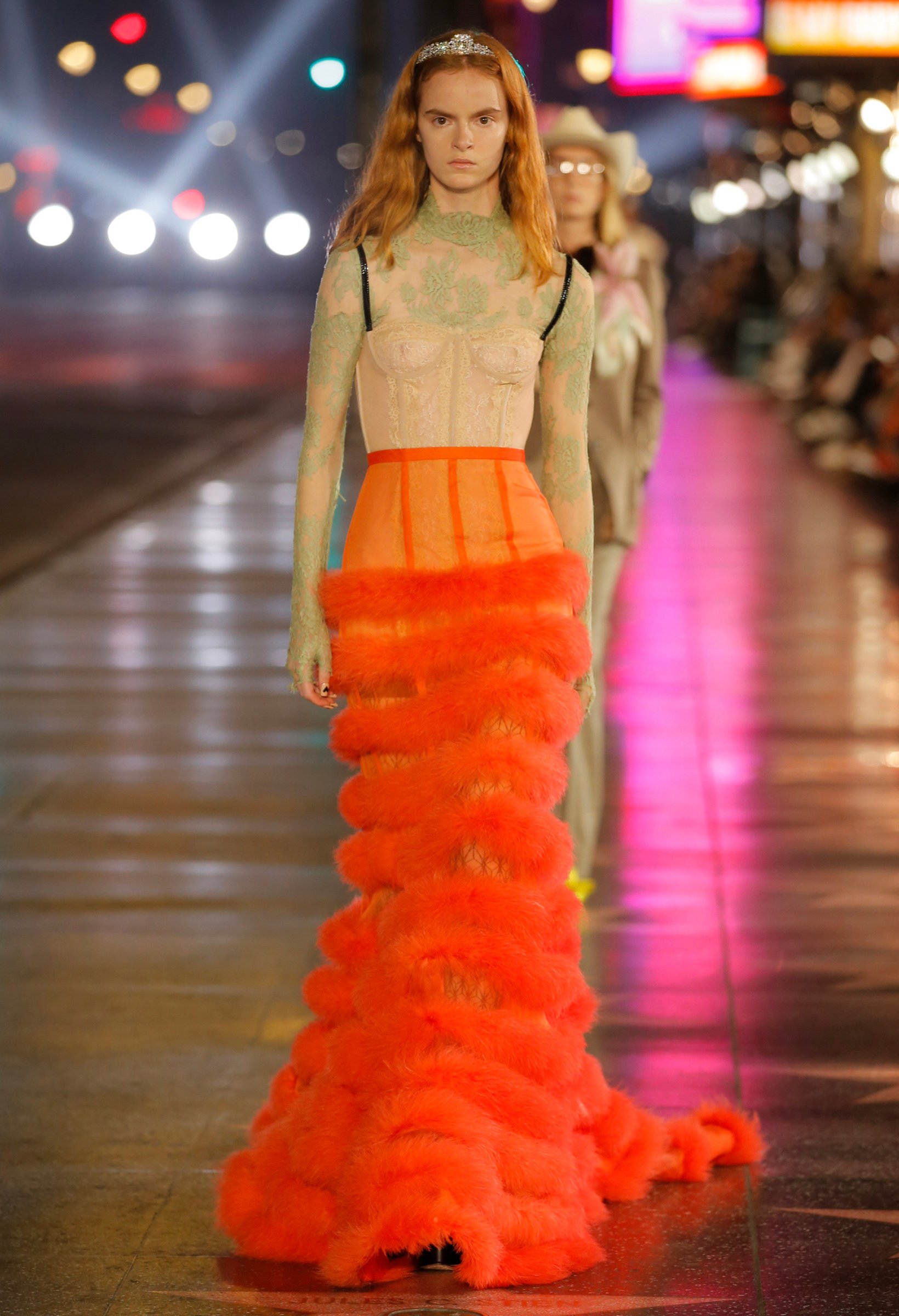 コレクションノートの冒頭に書かれていた「NINE LETTERS DRIPPING WITH DESIRE(欲望の滴る9つの文字)」とは、ミケーレが幼い頃から夢見てきた「HOLLYWOOD」のこと。ハリウッド特有の欲望を探究し、クラシカルなテーラリングと魅惑的なドレスを発表した。上品なサテンやレース、ランジェリーのセンシュアルな要素を取り入れ、往年のハリウッド女優を連想させるフェザーが装飾されたイブニングドレスやファーのガウン、女神のような風貌のプリーツドレス、またカウボーイハットをサテンのオールインワンに合わせるといったマカロニウエスタン調の装いも。