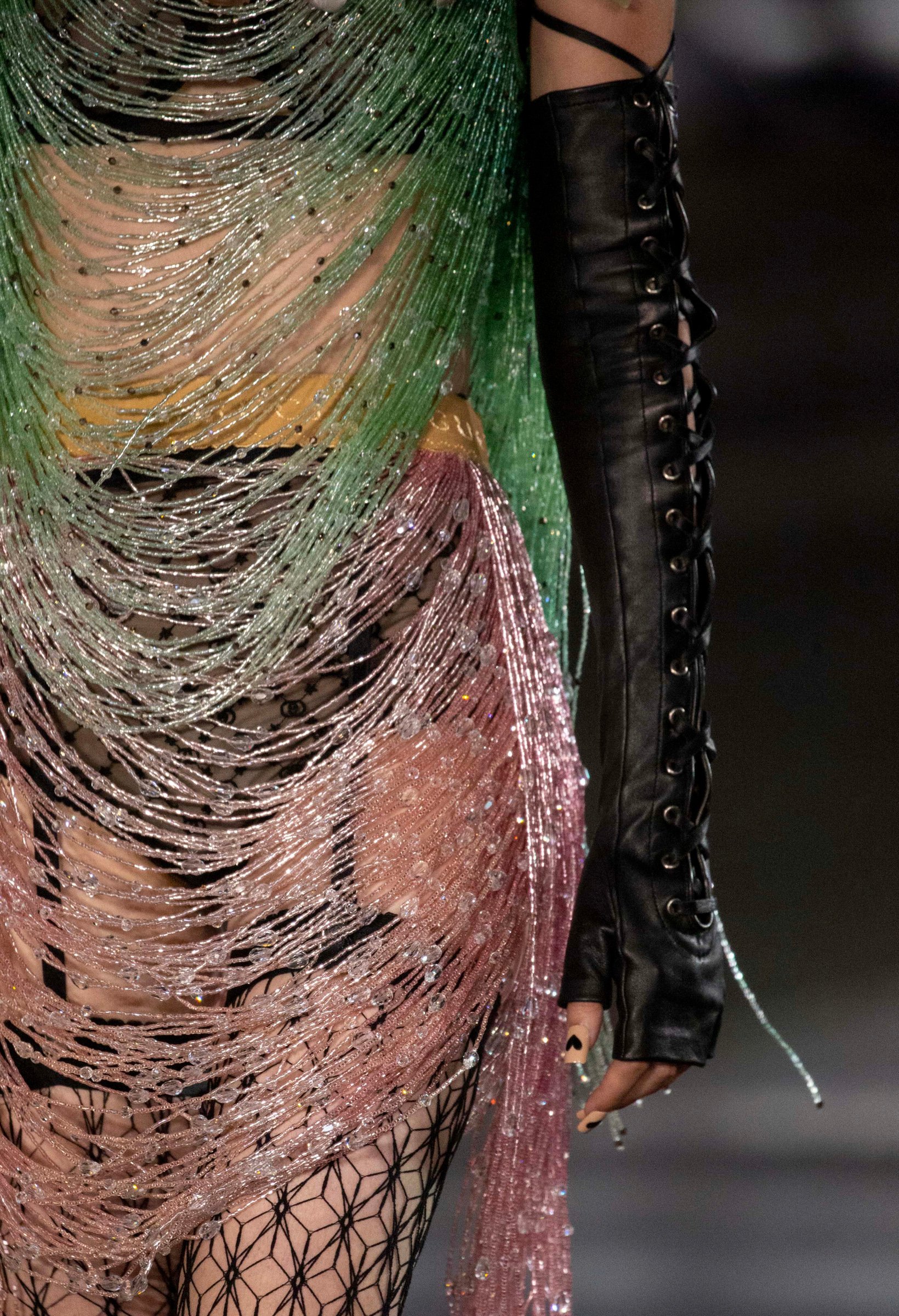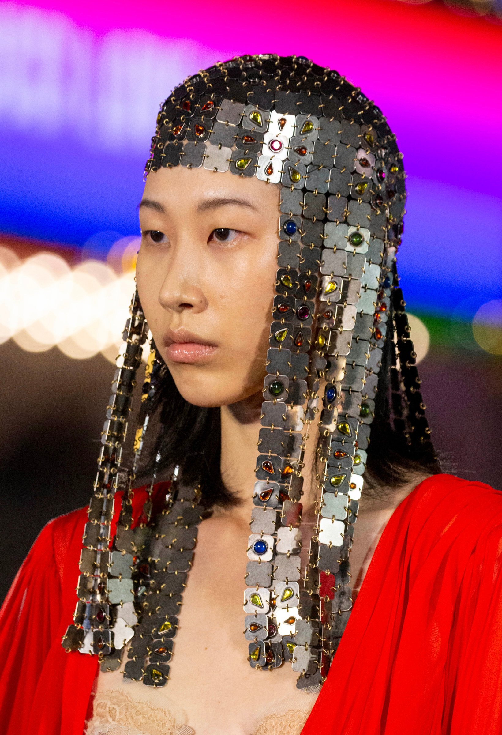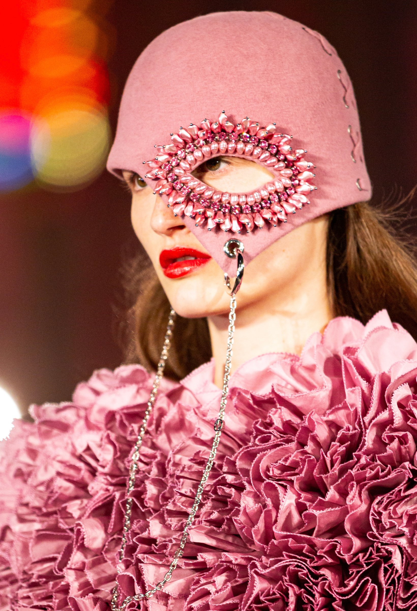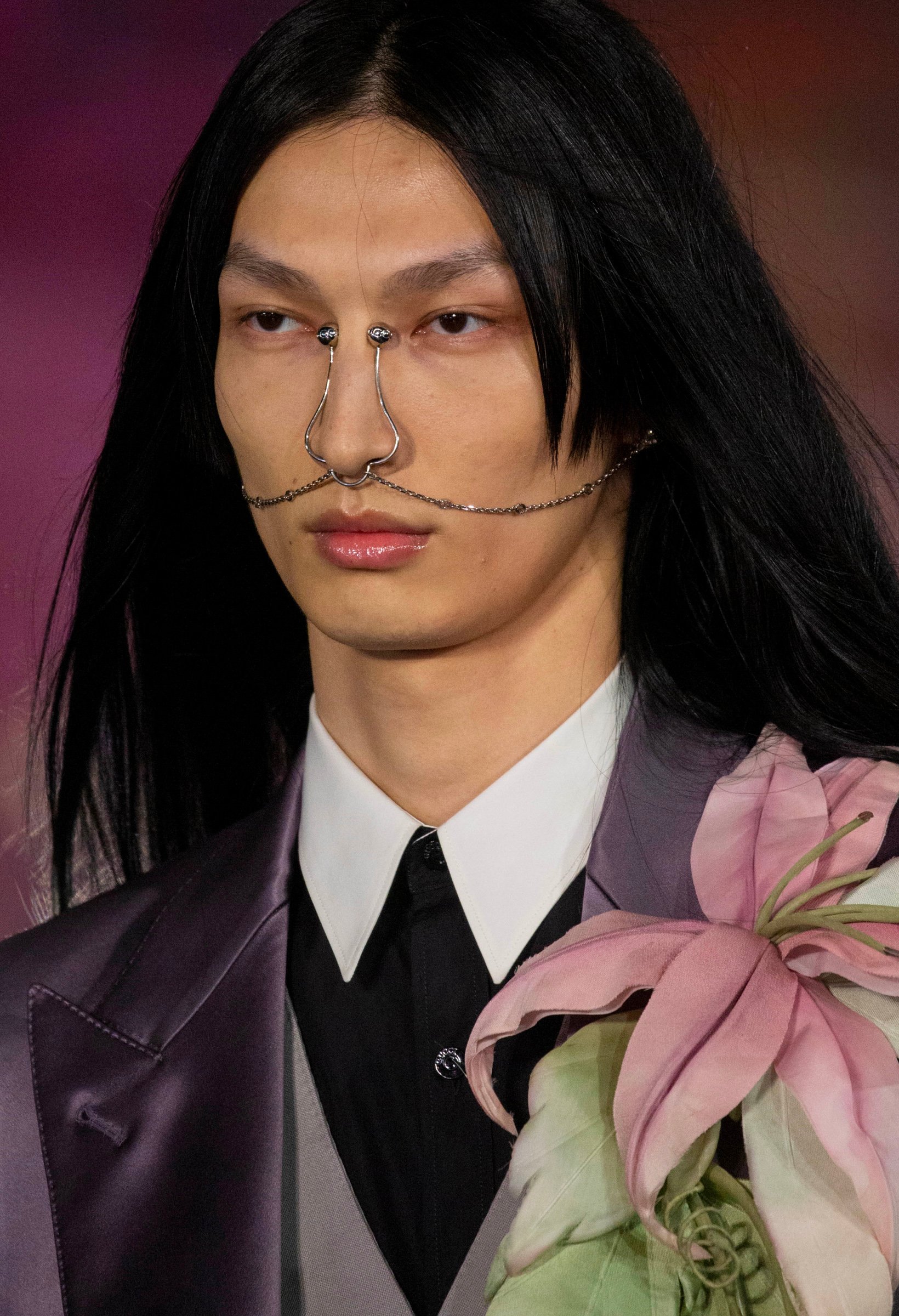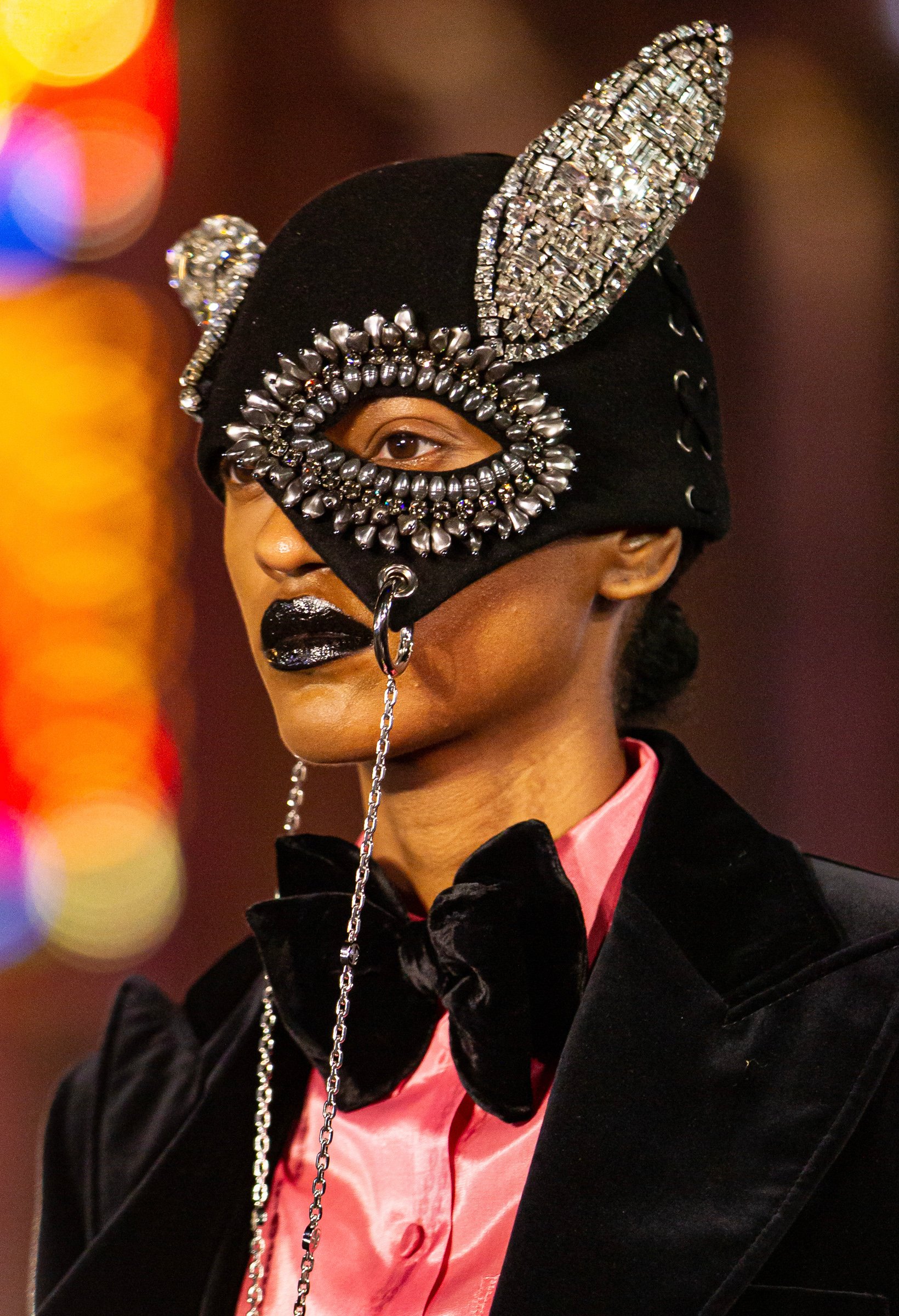 またメタルパーツで構成されたヘッドピースや、鼻を象ったピアス、フェティッシュなモチーフのジュエリーといった存在感のあるアクセサリーも個性を引き立てている。