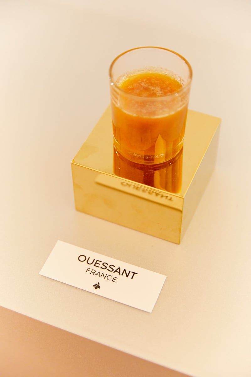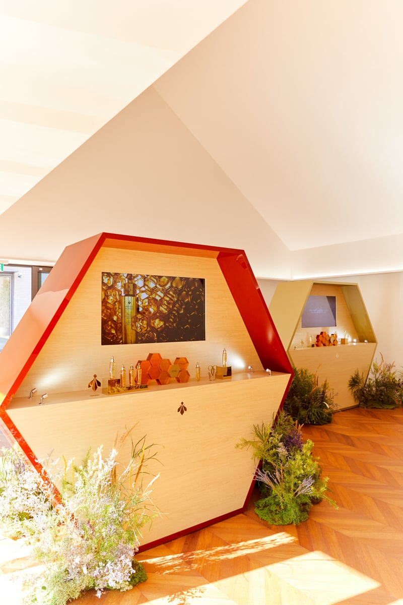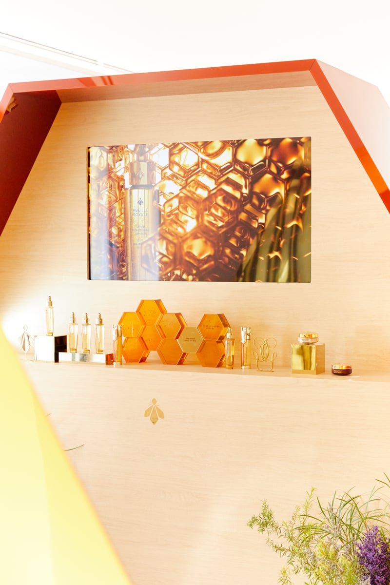 そして自然の力を先端サイエンスや研究知見で引き出してきたゲランらしいコンテンツも。“蜂の巣”に入り込むようなチェアに座り、VRを装着すると、そこにはメゾンのハニー・リザーブが広がります。世界中から集められた150種類以上のハチミツのサンプルが保管された貯蔵庫で、現在は一般公開されていない、いわばアベイユ ロイヤルの鍵を握るシークレットルーム。四方を色とりどりのハチミツが所狭しと並び、長年の採集と研究の英知が集結することで、新オイル美容液に取り入れた3種が見つけ出されたことが分かりました。