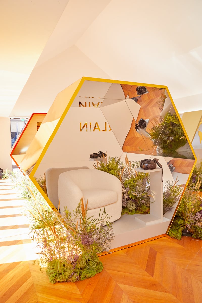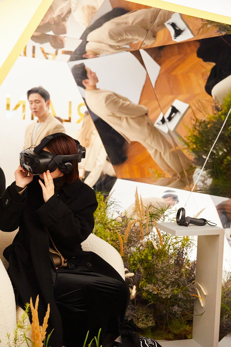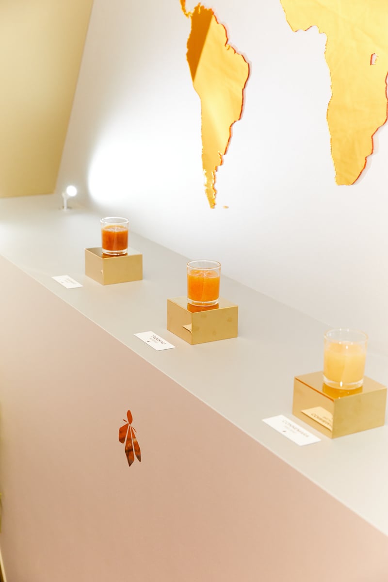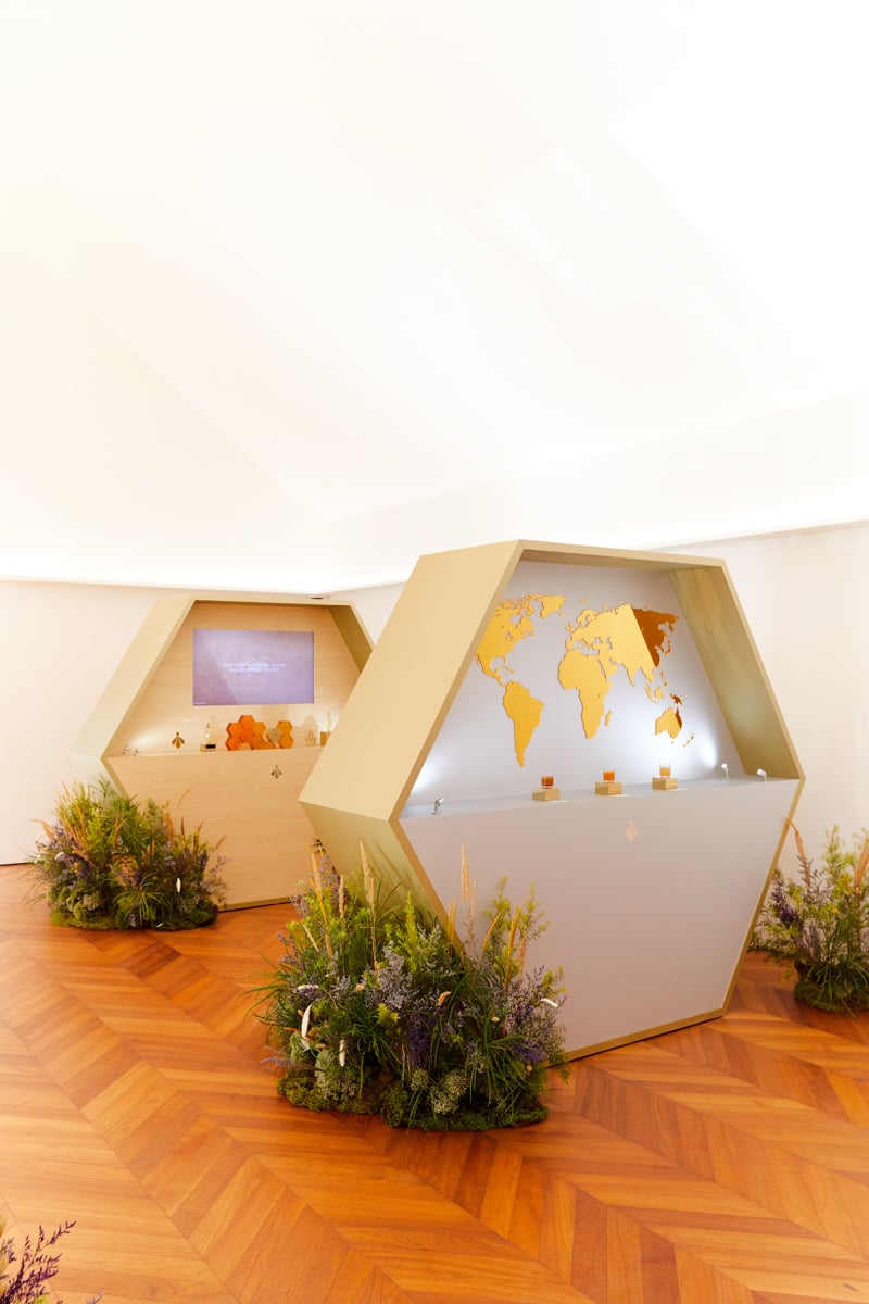 そして自然の力を先端サイエンスや研究知見で引き出してきたゲランらしいコンテンツも。“蜂の巣”に入り込むようなチェアに座り、VRを装着すると、そこにはメゾンのハニー・リザーブが広がります。世界中から集められた150種類以上のハチミツのサンプルが保管された貯蔵庫で、現在は一般公開されていない、いわばアベイユ ロイヤルの鍵を握るシークレットルーム。四方を色とりどりのハチミツが所狭しと並び、長年の採集と研究の英知が集結することで、新オイル美容液に取り入れた3種が見つけ出されたことが分かりました。