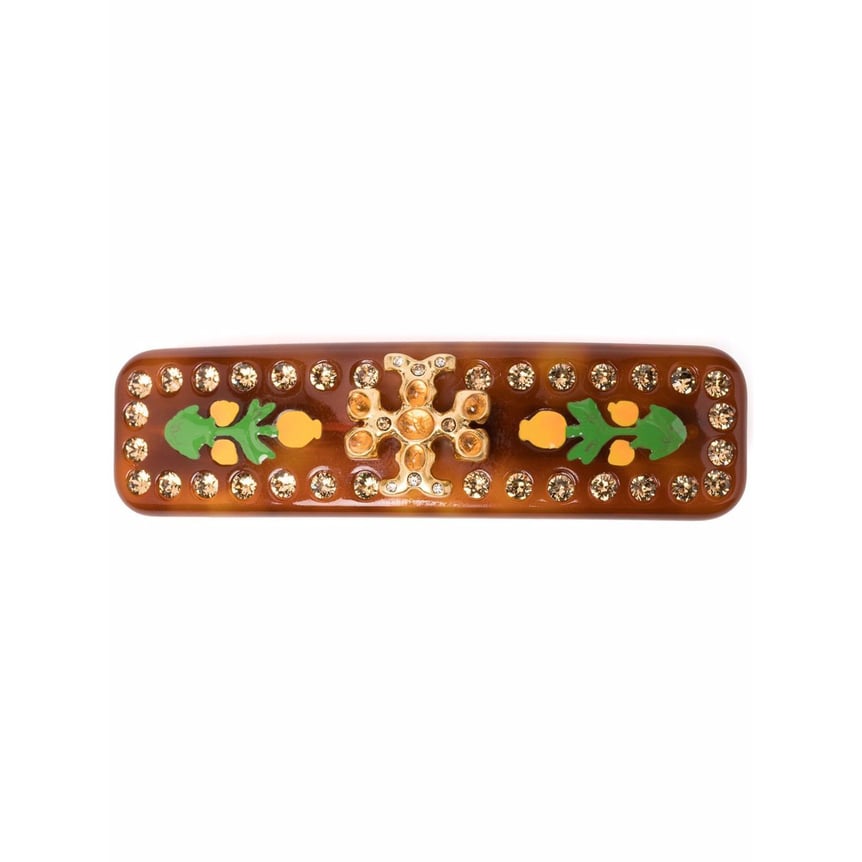 重厚感のあるアンティーク調のバレッタは、「トリー バーチ(TORY BURCH)」のもの。縁取りと中央のダブルTに施したクリスタルの輝きと、ハンドペイントであしらった両サイドのフラワーモチーフのクラフト感のバランスが秀逸です。