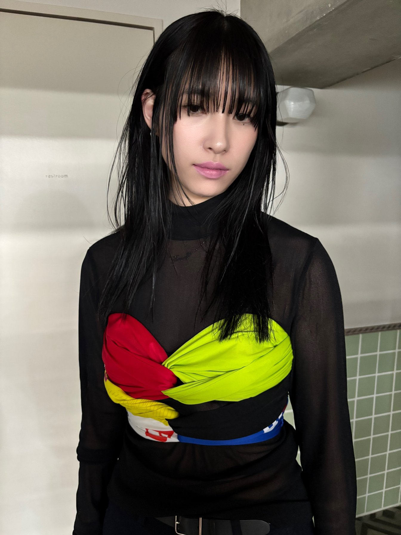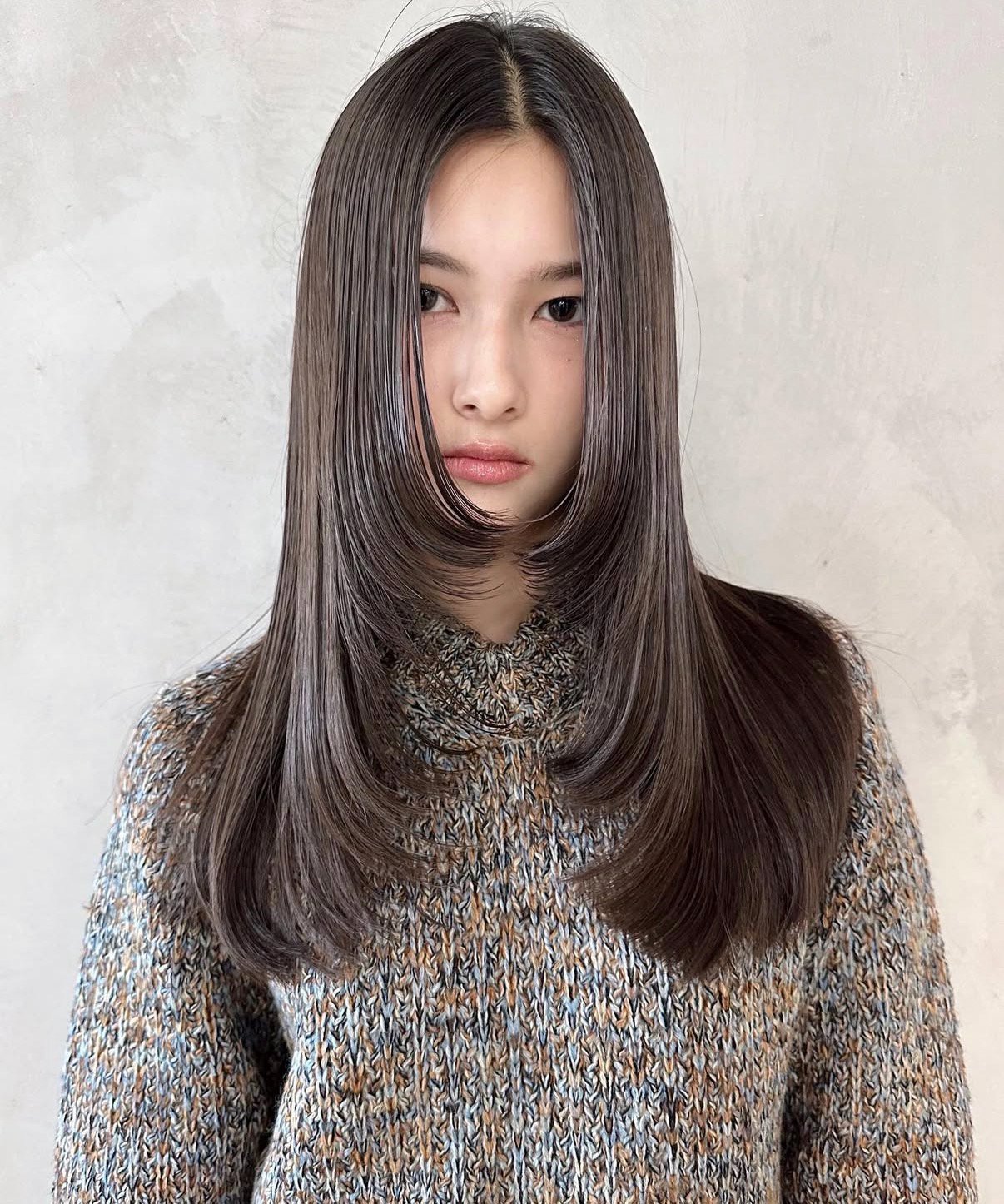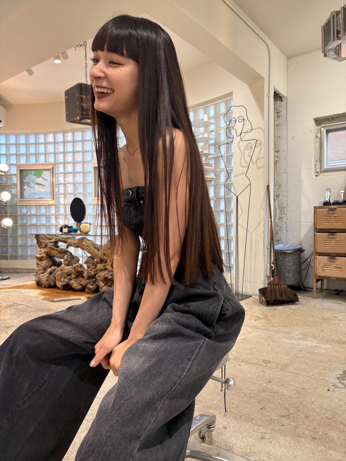 前髪も毛先もぱつっと仕上げた黒髪スーパーロング。胸下まであるレングスが最大の魅力です。ツヤツヤのロングヘアは髪自体がアクセサリーのように存在感があるので、巻いたりアレンジしたり、日々色々なスタイルを楽しめます。トレンドのY2Kスタイルは特に相性が良さそうですが、どんな服装でも合うと思います。甘くなりがちなので、アイラインはしっかりめに!(@mayukaabe)