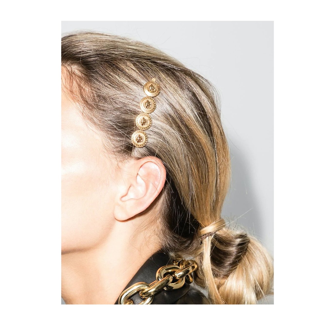 メデューサの金ボタンモチーフが4連になった控えめですが存在感大な「ヴェルサーチェ(VERSACE)」のヘアピンです。髪につけるだけで、一気に華やかに。