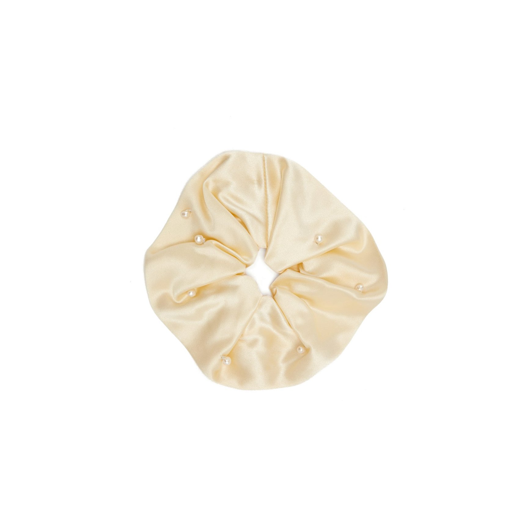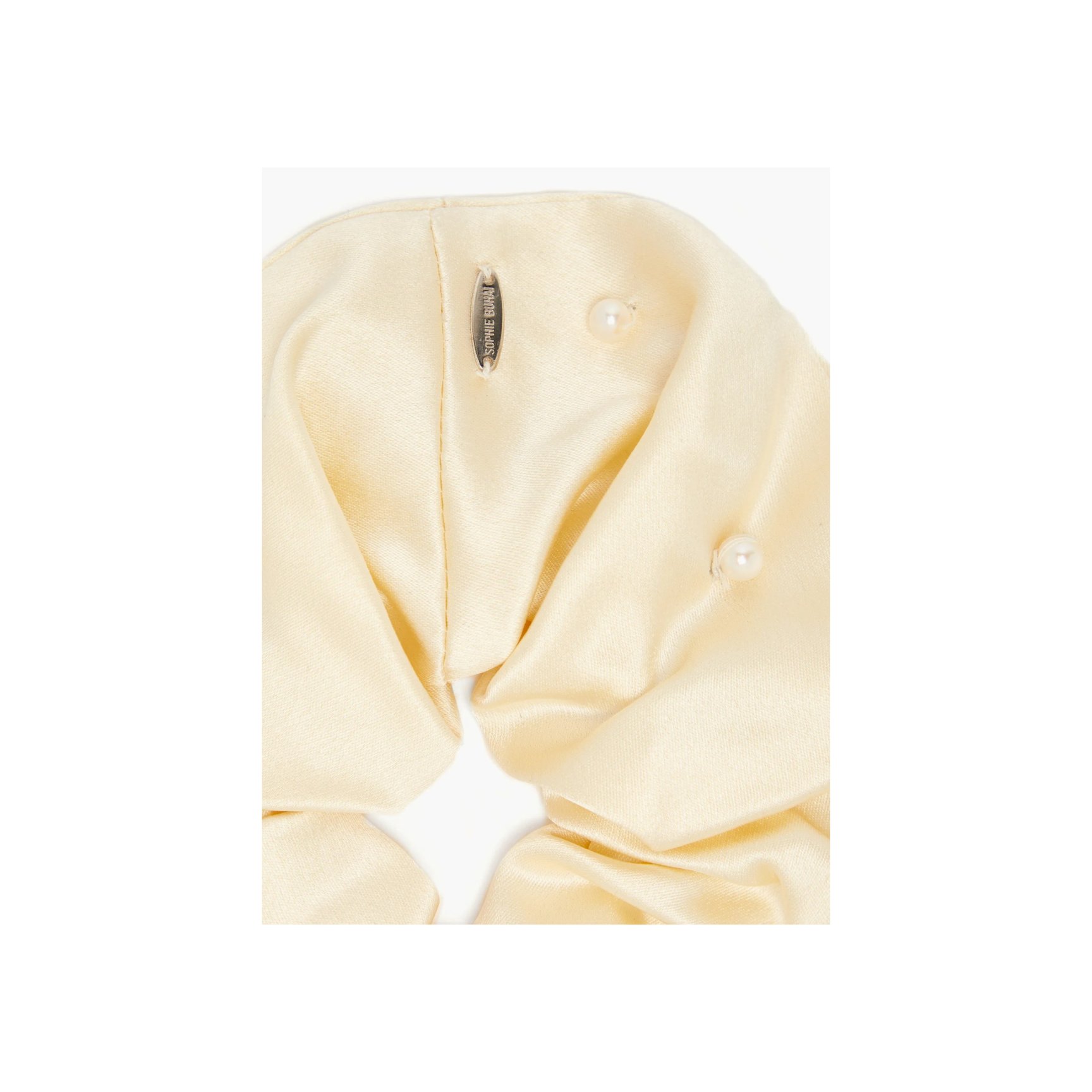 シンプルなシルクサテン地に小さなパールがあしらわれた、ジュエリーブランド「ソフィー ブハイ(Sophie Buhai)」のシュシュです。控えめな光沢とパールがエレガントで、髪を緩く束ねるだけで上品に仕上がります。