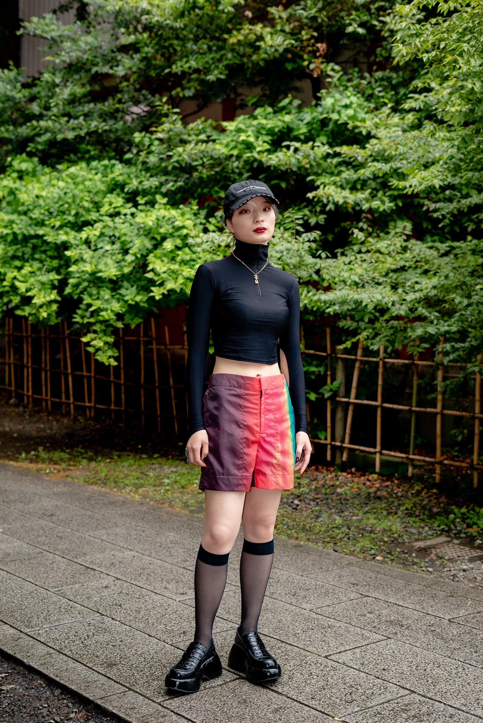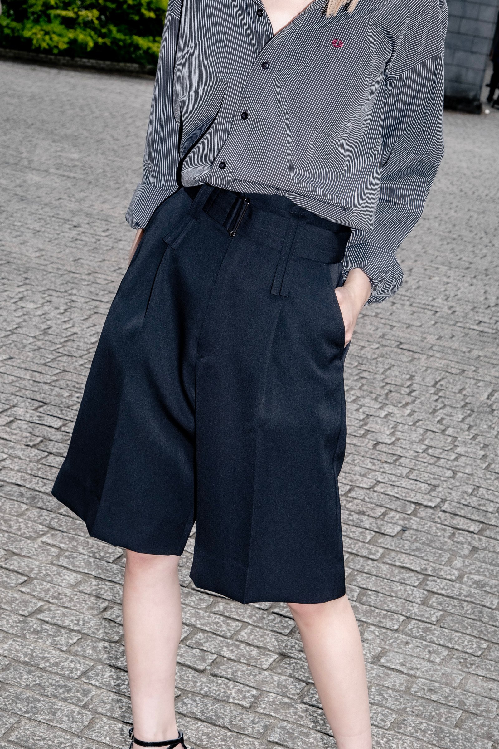 男女問わずに履けるツータックショートパンツは「ビューティフルピープル」のもの。船の帆に使用される太い糸で織った麻の頒布素材は光沢感がありドライな質感が特徴的。裾に向かって広がっていくAラインシルエットは足を細く長く見せてくれます。ポステレガントのシャツと合わせるとモードなマニッシュスタイルの完成です。