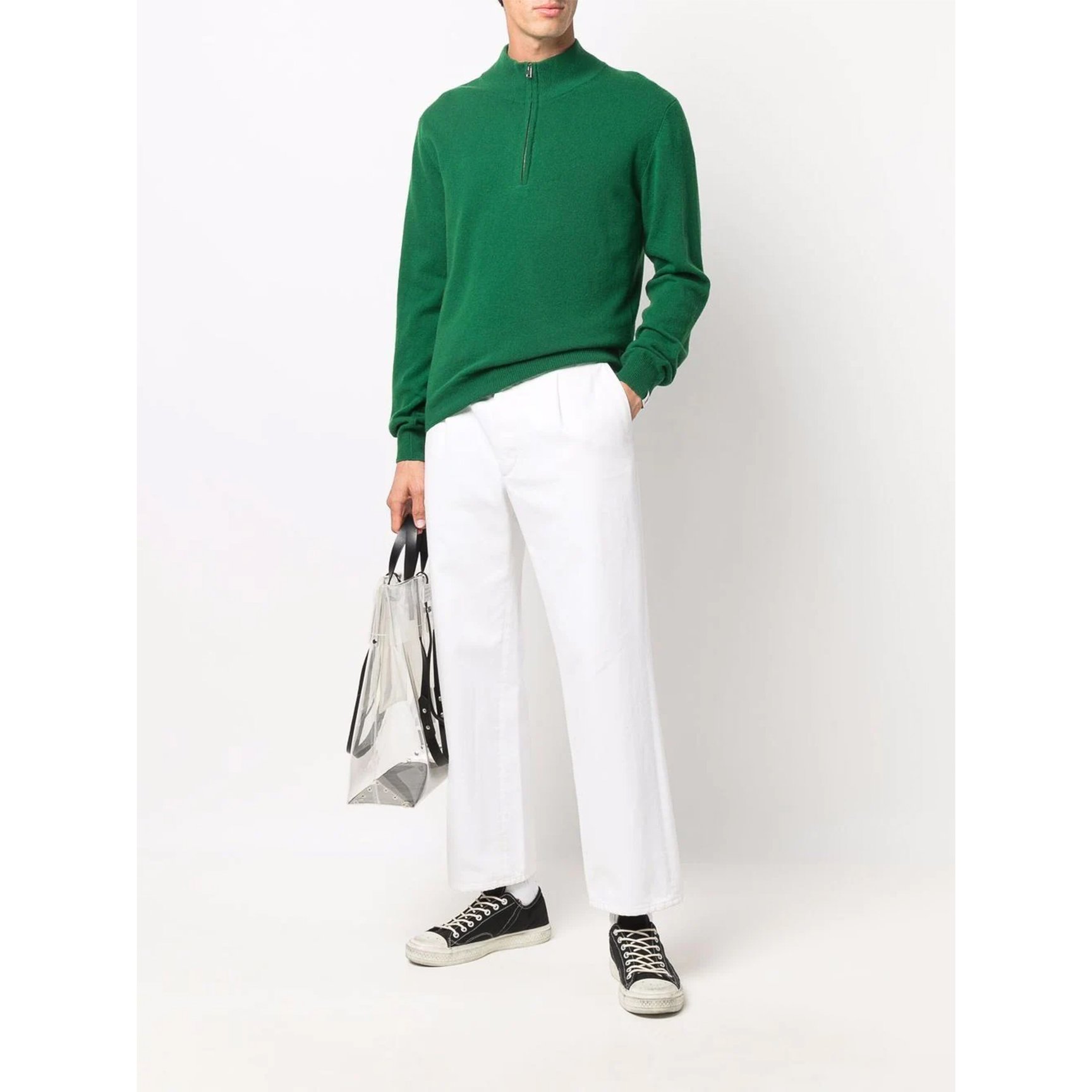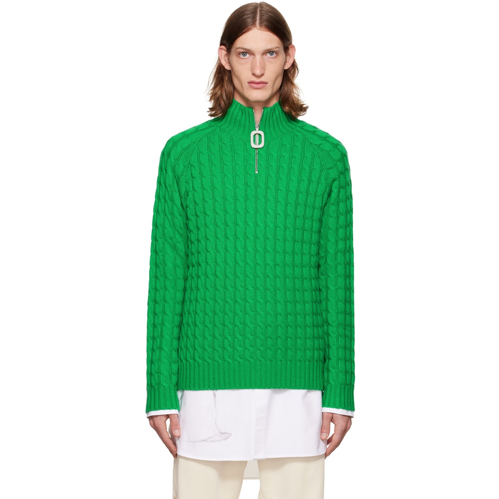 鮮やかなグリーンカラーとケーブル編み、大きめのジップで個性たっぷりのハーフジップセーターは「JW アンダーソン(JW ANDERSON)」のもの。中性的なスタイルを得意とするJWアンダーソンらしいデザインで、彩度高めの鮮やかなグリーンカラーが今の気分。